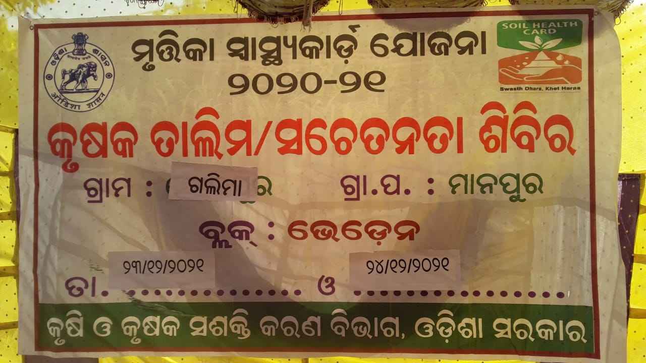 ବରଗଡ:-ବରଗଡ ଜିଲା ଭେଡେନ ବ୍ଳକ ଅନ୍ତର୍ଗତ ମାନପୁର ଗ୍ରାମ ପଞ୍ଚାୟତ ଗଲିମା ଗ୍ରାମରେ ମୃତ୍ତିକା ସ୍ବାସ୍ଥ୍ୟ କାର୍ଡ ଯୋଜନା କୃଷକ ତାଲିମ/ସଚେତନତା ଶିବିର ରେ ଭେଡେନ ବ୍ଳକ କୃଷି ଅଧିକାରୀ କୃଷକ ମାନଙ୍କୁ ଚାଷ ର ଉନ୍ନତି ଦିଗରେ କୃଷକ ତାଲିମ ଓ ସଚେତନତା କରିଥିଲେ । ଏହି ତାଲିମ ଶିବିର ରେ ରାଜ୍ୟ ଆତ୍ମା କମିଟି ର ସଦସ୍ୟ ଶ୍ରୀ ଗଣେଶ କର୍ଣ୍ଣ ,ମାନପୁର ଗ୍ରାମ ପଞ୍ଚାୟତ ଗ୍ରାମ ସେବିକା , କୃଷ୍ଣ ଚନ୍ଦ୍ର ନାଏକ,ବିଜୟ ଅଗ୍ରୱାଲ, ପୂର୍ଣ୍ଣ ଚନ୍ଦ୍ର ନାଏକ, ଆଦିତ୍ୟ ଜାଲ ,ସୁରୁବାବୁ ନାଏକ,ଝସକେତନ ନାଏକ ଆଦି ବହୁ ସଂଖ୍ୟାରେ ଚାଷୀ ଭାଇ ଭଉଣୀ ମାନେ ଉପସ୍ଥିତ ଥିଲେ।