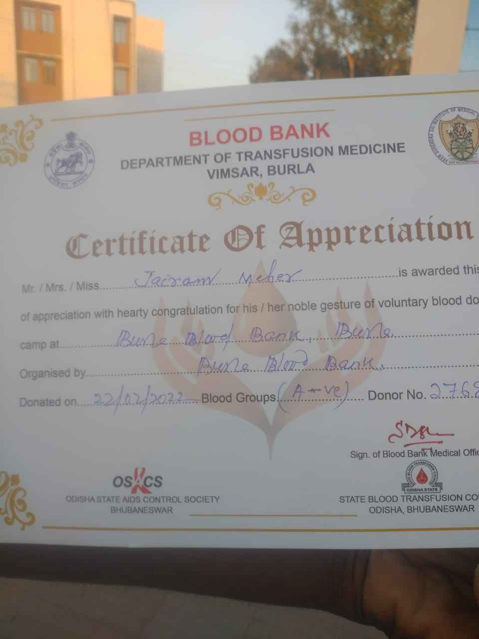 ସୁବର୍ଣ୍ଣପୁର(ମନୋରଞ୍ଜନ ତ୍ରିପାଠୀ) ସ୍କୁଲ ଡିଉଟି ରେ ଥିବା ବେଳେ ଫୋନ କଲ ପାଇ ରକ୍ତ ଦେବା ପାଈଁ ସୁଦୂର ବୌଦ୍ଧ ଜ଼ିଲ୍ଲା ରୁ ବୁର୍ଲା ଭୀମସାର ମେଡିକାଲ କୁ ପହଂଚିଲେ ଓ ରେଆର ଗ୍ରୁପ A ନେଗେଟିଭ ର ରକ୍ତ ଦାନ କରି ବୁର୍ଲା ର
