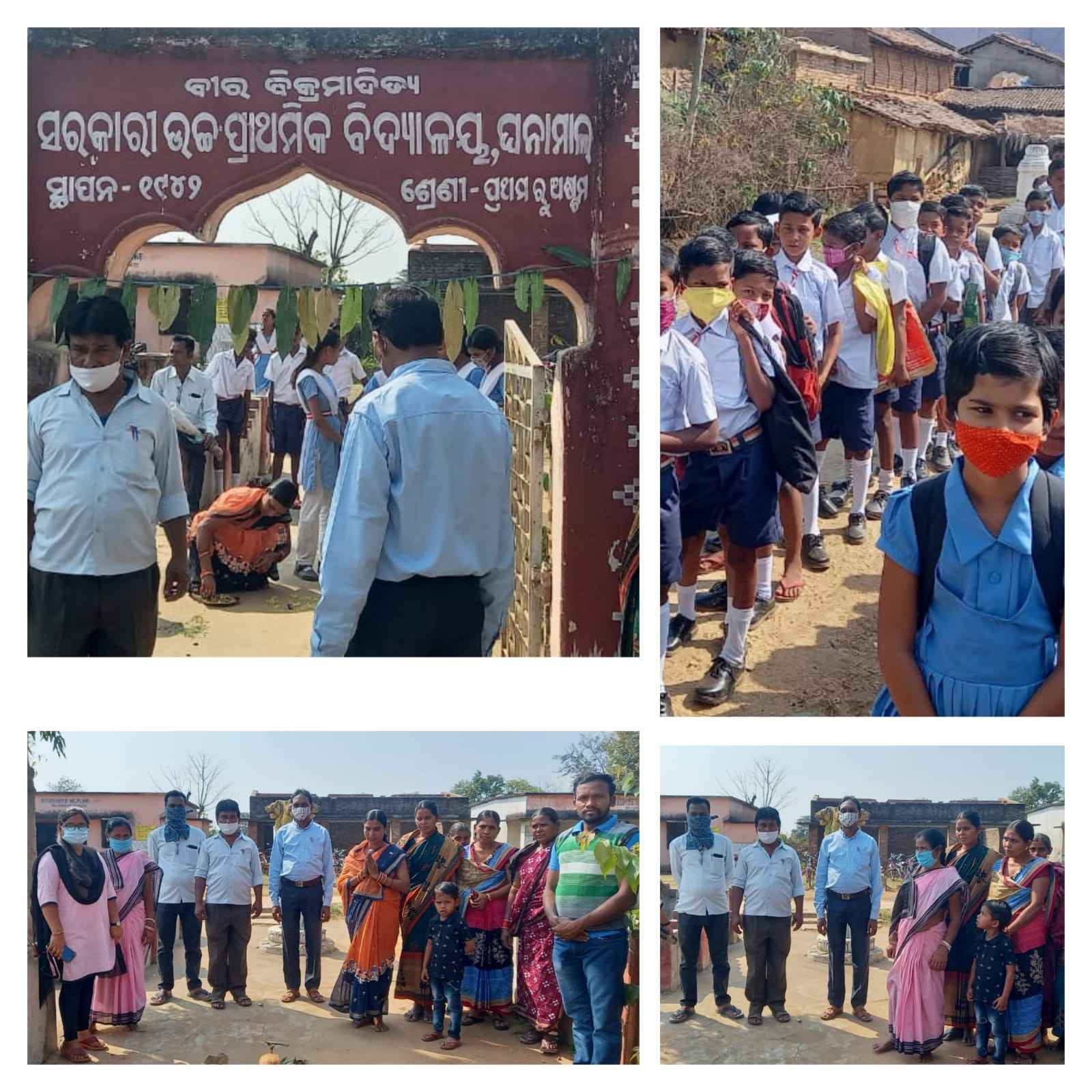 ପଦ୍ମପୁର (ନିରଞ୍ଜନ ତ୍ରିପାଠୀ)-ରାଜବୋଡାମ୍ବର ବ୍ଳକ ରେ ଯାଉଥିବା ବି.ବି ହାଇସ୍କୁଲ ଘନାମାଲ ଠାରେ ଦିର୍ଘଦିନର ବ୍ୟବଧାନ ପରେ ରାଜ୍ୟ ସରକାର ଙ୍କ ନିର୍ଦ୍ଦେଶନାଯାୟୀ ଓଡ଼ିଶା ରେ ଥିବା ସମସ୍ତ ବିଦ୍ୟାଳୟ ରେ ଅଧ୍ୟୟନରତ ପ୍ରଥମ ଶ୍ରେଣୀ ରୁ ଆରମ୍ଭ କରି ସପ୍ତମ ଶ୍ରେଣୀ ପର୍ଯ୍ୟନ୍ତ ପିଲାଏ ପାଠପଢିବାକୁ ପ୍ରେରିତ ଚିଠି ହିସାବରେ ଆଜି ଘନମାଲ ବି.ବି.ହାଇସ୍କୁଲ ରେ ଅଧ୍ୟୟନ କରୁଥିବା ସମସ୍ତ ଛାତ୍ର ଛାତ୍ରୀ ଙ୍କୁ ଫୁଲ ଚନ୍ଦନ ପ୍ରଲେପ ଦେଇ ସ୍କୁଲ ରେ କାର୍ଯ୍ୟରତ ସମସ୍ତ ଶିକ୍ଷକ ଶିକ୍ଷୟିତ୍ରୀ ସ୍ୱାଗତ ସମ୍ବର୍ଦ୍ଧନା କରି ସ୍କୁଲ ର ଶ୍ରେଣୀ କୋଠରୀ ମାନଙ୍କୁ ପାଛୋଟି ନେଇଥିଲେ ।ଏହି କାର୍ଯ୍ୟକ୍ରମ ରେ ସ୍କୁଲ ର ପରିଚାଳନା କମିଟି ଅଧ୍ୟକ୍ଷ ରାଜକିଶୋର ମୁଣ୍ଡ , ସଦସ୍ୟ ସଦସ୍ୟା ତଥା ଅଭିଭାବକ ପିଲାଙ୍କ ଆଗମନ କୁ ଅନେକ ବସିଥିବା ଦେଖିବାକୁ ମିଳିଥିଲା । ଏ ଭଳି ପ୍ରୟାସ କୁ ଗ୍ରାମର ବୁଦ୍ଧିଜୀବୀ ମହଲ ରେ ପ୍ରଶଂସା କରାଯାଇଛି
