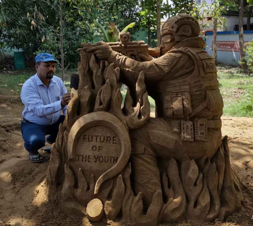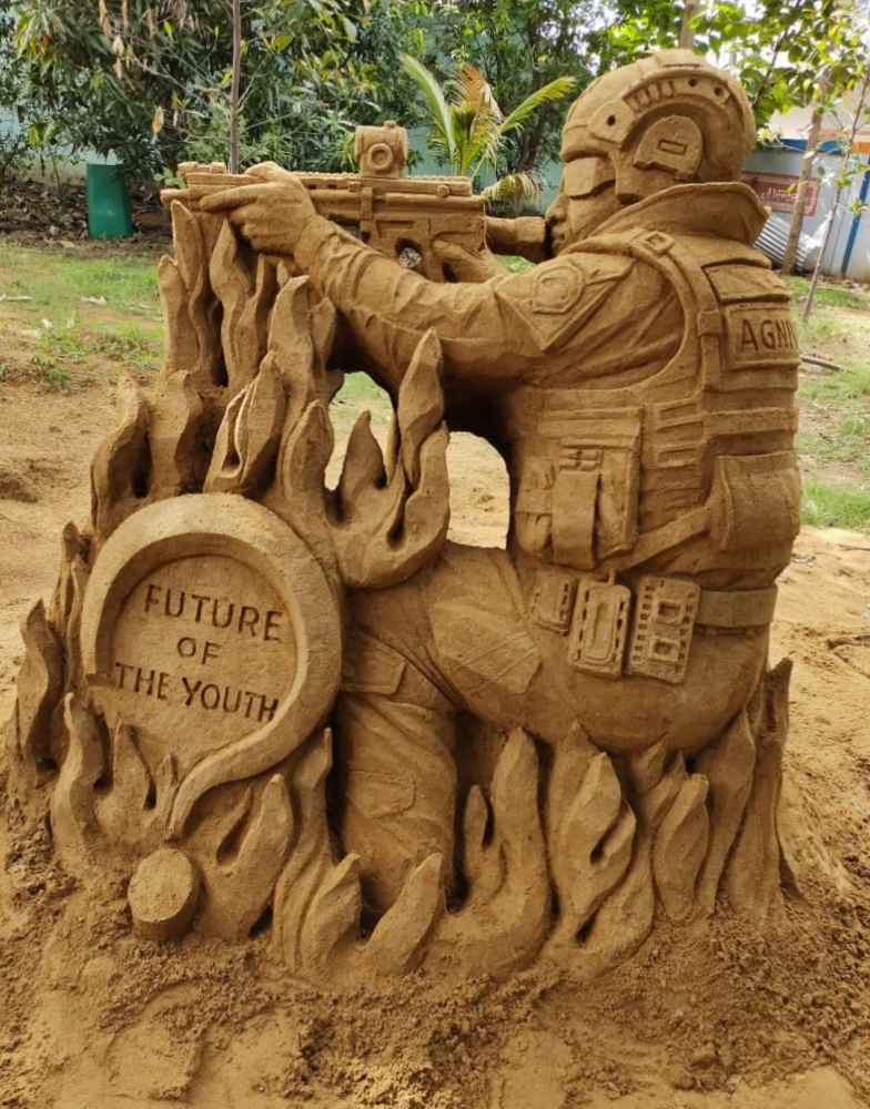 ବର୍ତମାନ ଅଗ୍ନିପଥ ଯୋଜନା କୁ ନେଇ ଦେଶର ବିଭିନ୍ନ ସ୍ଥାନରେ ଆନ୍ଦୋଳନ ଚାଲିଛି l ଏହି ଯୋଜନା ରେ ନିଯୁକ୍ତି ପାଇବାକୁ ଥିବା ଅଗ୍ନିବୀର ମାନେ ମାତ୍ର ଚାରି ବର୍ଷ ଚାକିରୀ କରିବେ, ତା ପରେ କଣ ହେବ ବୋଲି ଅଭିଯୋଗ କରି ଆନ୍ଦୋଳନ ହେଉଥିବା ବେଳେ କଳାହାଣ୍ଡି ଜିଲ୍ଲା କର୍ଲାମୁଣ୍ଡା ବ୍ଲକ ଗଜବାହଲ ପଞ୍ଚାୟତ ଡ଼ଙ୍ଗରମୁଣ୍ଡା ଗ୍ରାମର ଯୁବ ବାଲୁକା ଶିଳ୍ପୀ ଓଁମ ପ୍ରକାଶ ସାହୁ ଏହାକୁ ନେଇ ବାଲୁକା କଳାରେ ସୁନ୍ଦର ଚିତ୍ର ନିର୍ମାଣ କରିଛନ୍ତି l ଯୁବସମାଜ ର ଭବିଷ୍ୟତ ନାମରେ ସେ ନିର୍ମାଣ କରିଥିବା ଏହି କଳା ମାଧ୍ୟମରେ ଆହ୍ୱାନ କରିଛନ୍ତି କି ଯେ ଆନ୍ଦୋଳନକାରୀ ମାନେ ହିଂସାତ୍ମକ ଆନ୍ଦୋଳନ ନ କରି ଗଣତାନ୍ତ୍ରିକ ଭାବେ ନିଜ ମତ ରଖି ଏହି ଯୋଜନା ଉପରେ ତର୍କ କରନ୍ତୁ l