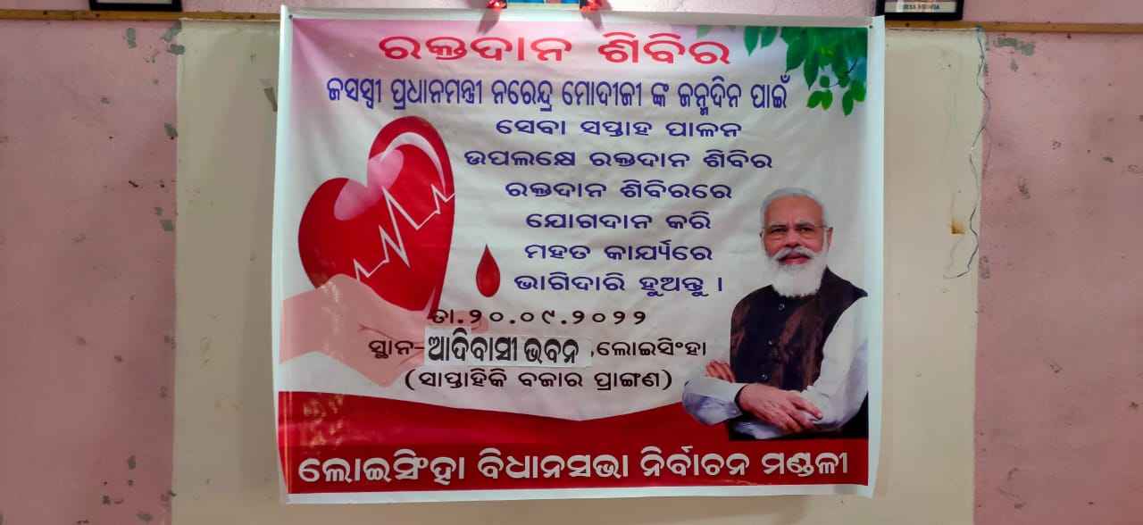 ଲୋଇସିଂହା, (ବିନୋଦ କୁମାର ଦୀପ) ଆଜି ଲୋଇସିଂହା ଆଦିବାସୀ ଭବନ ଠାରେ ଯଶସ୍ବୀ ପ୍ରଧାନମନ୍ତ୍ରୀ ନରେନ୍ଦ୍ର ମୋଦୀଜିଙ୍କ ୭୨ ତମ ଜନ୍ମଦିନ ଉପଲକ୍ଷେ ଲୋଇସିଂହା ବିଧାନ ସଭା ନିର୍ବାଚନ ମଣ୍ଡଳୀ ବିଜେପି ଦଳ ପକ୍ଷରୁ ଏକ ରକ୍ତଦାନ ଶିବିର ଆୟୋଜିତ ହୋଇଯାଇଛି l ଉକ୍ତ କାର୍ଯ୍ୟକ୍ରମରେ ମୁଖ୍ୟଅତିଥି ଭାବେ ଲୋଇସିଂହା ବିଧାୟକ ଡ଼ ମୁକେଶ ମହାଲିଙ୍ଗ ଯୋଗ ଦେଇଥିବା ବେଳେ ଲୋଇସିଂହା, ଆଗଲପୁର ଓ ପୁଇଁତଳା ବ୍ଳକର ଶତାଧିକ ବିଜେପି କର୍ମୀ ଓ ରକ୍ତଦାତା ଉପସ୍ଥିତ ଥିଲେ l