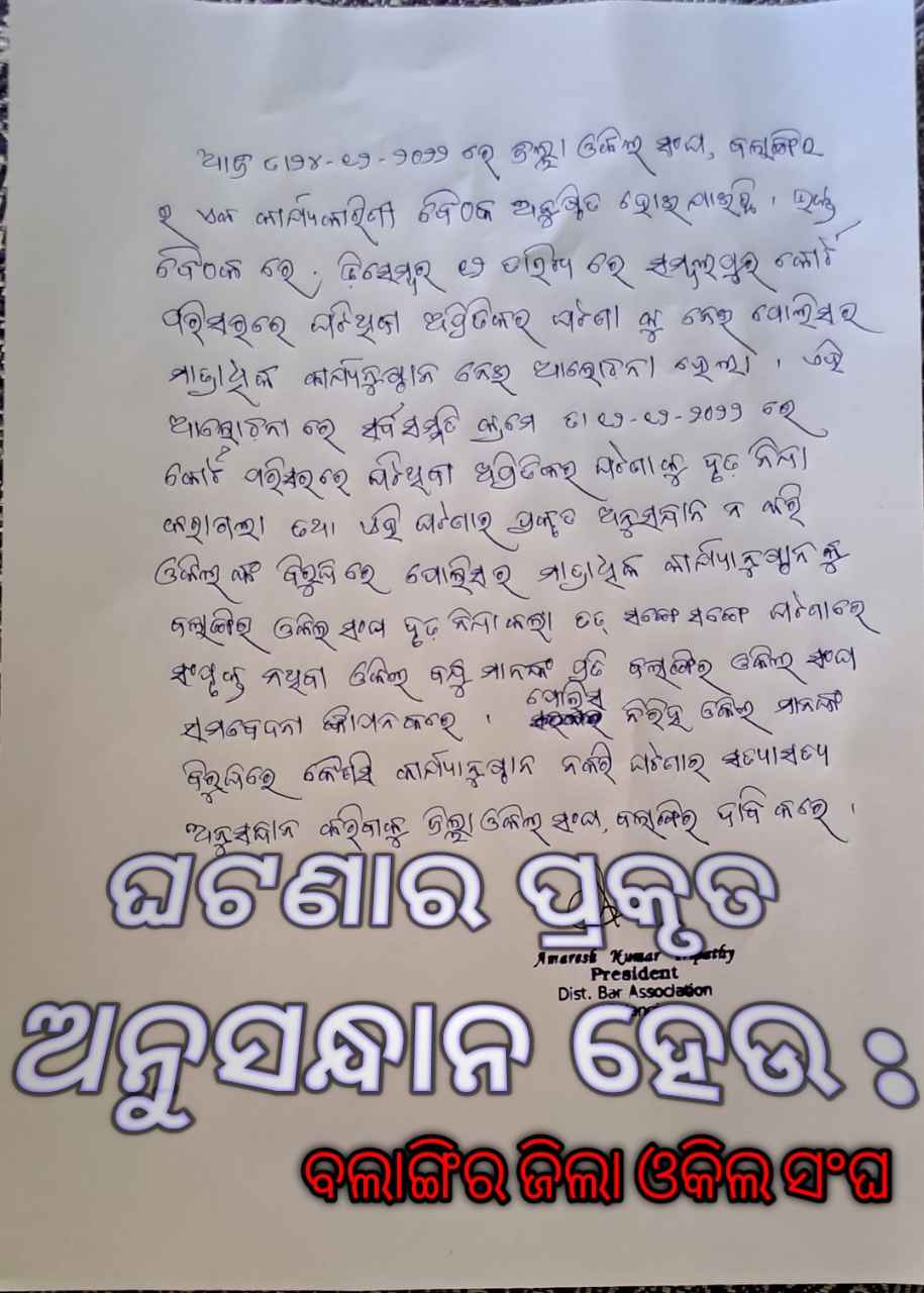 ବଲାଙ୍ଗିର, ଆଜି ସ୍ଥାନୀୟ ସିଭିଲ କୋର୍ଟ ବାର୍ ହଲ୍ଠାରେ ବଲାଙ୍ଗୀର ଜିଲ୍ଲା ଓକିଲ ସଂଘ ର କାର୍ଯ୍ୟକାରିଣୀ ବୈଠକ ଅନୁଷ୍ଠିତ ହୋଇଯାଇଛି । ସଂଘର ସଭାପତି ଅମରେଶ ତ୍ରିପାଠୀଙ୍କ ଆବାହକତ୍ୱରେ ଅନୁଷ୍ଠିତ ଏହି ବୈଠକରେ ସମ୍ବଲପୁର ଓକିଲ ସଂଘର ସଭ୍ୟ ମାନଙ୍କ ବିରୁଦ୍ଧରେ ପୋଲିସର ମାତ୍ରାଧିକ କାର୍ଯ୍ୟାନୁଷ୍ଠାନକୁ ଦୃଢ଼ ନିନ୍ଦା କରାଯାଇଥିଲା । ଗତ ଡିସେମ୍ବର ୧୨ ତାରିଖରେ ହାଇକୋର୍ଟ ସ୍ଥାୟୀ ବେଂଚ ଆନ୍ଦୋଳନକୁ କେନ୍ଦ୍ର କରି ସମ୍ବଲପୁର କୋର୍ଟ ପରିସରରେ ଘଟିଥିବା ଅପ୍ରୀତିକର ଘଟଣାର ପ୍ରକୃତ ଅନୁସନ୍ଧାନ ନ କରି ପୋଲିସ ଘଟଣାରେ ସଂପୃକ୍ତ ନ ଥିବା ସମ୍ବଲପୁର ଜିଲ୍ଲ ଓକିଲ ସଂଘର କିଛି ଓକିଲ ମାନଙ୍କୁ ଅମାନୁଷିକ ଭାବରେ ମାଡ ମାରିଥିଲା । ଭାରତ ପରି ଏକ ଗଣତାନ୍ତ୍ରିକ ରାଷ୍ଟ୍ରରେ ନିଜର ହକ୍ ପାଇଁ ଲଢ଼େଇ କରୁଥିବା ଓକିଲ ମନାଙ୍କ ଆନ୍ଦୋଳନକୁ ଦମନ କରାଯିବାର ଏକ ହୀନ ପ୍ରୟାସ କରାଯାଇଛି । ପୋଲିସ ମାଡର ଶିକାର ହୋଇଥିବା ନିରୀହ ଓକିଲ ମାନଙ୍କ ପ୍ରତି ବଲାଙ୍ଗୀର ଜିଲ୍ଲା ଓକିଲ ସଂଘ ସମବେଦନା ଜଣାଇଛି । ସୁପ୍ରିମ କୋର୍ଟର ରାୟ ପ୍ରତି ଆମର ଯଥେଷ୍ଟ ଆସ୍ଥା ଓ ସମ୍ମାନ ରହିଛି ବୋଲି ଜିଲ୍ଲା ଓକିଲ ସଂଘ ପକ୍ଷରୁ କୁହାଯାଇଛି । ପୋଲିସ ନିରୀହ ଓକିଲ ମାନଙ୍କ ବିରୁଦ୍ଧରେ କୌଣସି କାର୍ଯ୍ୟାନୁଷ୍ଠାନ ଗ୍ରହଣ ନ କରି ଘଟଣାର ସତ୍ୟାସତ୍ୟ ଅନୁସନ୍ଧାନ କରିବାକୁ ବଲାଙ୍ଗୀର ଜିଲ୍ଲା ଓକିଲ ସଂଘ ଦାବି କରିଛି ।