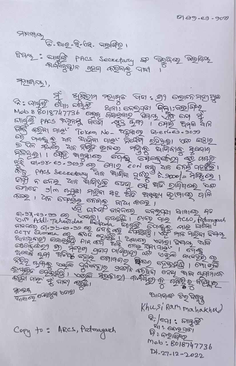 ବେଲପଡ଼ା(ପ୍ରେରଣା ଖବର) - ବଲାଙ୍ଗୀର ଜିଲ୍ଲା ବେଳପଡ଼ା ଅନ୍ତର୍ଗତ ଘାଘୂର୍ଲି ପେକ୍ସ ସମ୍ପାଦକ ମହେଶ ପ୍ରତାପ ପାଣିଗ୍ରାହୀ ଙ୍କ ବିରୁଦ୍ଧରେ ଚାଷୀ ଖୁସିରାମ୍ ମହାକୁଡ ଆଣିଛନ୍ତି ସଙ୍ଗୀନ ଅଭିଯୋଗ । ପେକ୍ସ୍ ସମ୍ପାଦକ କୁଆଡେ ଖୁଶିରାମ ଙ୍କୁ ୨/୩ ଚାପୁଡ଼ା ମାରିବା ସହ ଅଶ୍ଳୀଳ ଭାଷାରେ ଗାଳିଗୁଲଜ କରିଥିଲେ ।ଖବର ପାଇ ଅତିରିକ୍ତ ତହସିଲଦାର ବେଳପଡ଼ା ଏବଂ ଏସି ଏସ ଓ ପାଟଣାଗଡ଼ ଘାଘୁର୍ଲି ପେକ୍ସ୍ କୁ ଯାଇ ତଦନ୍ତ କରିଥିଲେ । ଉପରୋକ୍ତ ଘଟଣା କୁ ନେଇ ଚାଷୀ ବେଳପଡ଼ା ଥାନାରେ ଗତ ତା ୨୫.୧୨.୨୦୨୨ ରିଖ ପେକ୍ସ୍ ସମ୍ପାଦକ ମହେଶ ପ୍ରତାପ ପାଣିଗ୍ରାହୀ ଙ୍କ ବିରୁଦ୍ଧରେ ଏତଲା ଦେଇଥିଲେ । ସୂଚନା ଅନୁଯାୟୀ ଖୁଶିରାମ୍ ଘଘୁର୍ଲି ପେକ୍ସ୍ ଅଧିନସ୍ଥ ଜଣେ କ୍ଷୁଦ୍ର ଚାଷୀ ଅଟନ୍ତି । ତାଙ୍କର ଅମଳ ଧାନ ବିକ୍ରି କରିବା ପାଇଁ ପାଇଥିବା ଟୋକନ୍ ଅନୁସାରେ ସେ ୧୯.୧୨.୨୦୨୨ ରେ ପେକ୍ସ୍ କୁ ଧାନ ଦେବା ପାଇଁ ନିର୍ଦ୍ଦେଶ ରହିଥିଲା ଏବଂ ୭ ଦିନ ମଧ୍ୟରେ ଧାନ ନିଶ୍ଚିତ ଭାବରେ ମଣ୍ଡିକୁ ଆଣିବାର ସୁଯୋଗ ମିଳିଥିଲା । ସେହି ଅନୁସାରେ ସେ ପେକ୍ସ୍ ସମ୍ପାଦକ ଙ୍କୁ ପଚାରି ତା,୨୪.୧୨.୨୦୨୨ ରିଖରେ ୧୦୯ ବସ୍ତା ଧାନ ନେଇ ପହଞ୍ଚିଥିଲେ ।ଧାନ ଆଣିବା ଦେଖି ମହେଶ ରାଗିଯାଇ ଖୁସୀରାମ ଙ୍କୁ ୨/୩ ଚାପୁଡ଼ା ମାରିବା ସହ ଅଶ୍ଳୀଳ ଭାଷାରେ ଗାଳିଗୁଲଜ କରିଥିବା ଲିଖିତ ଅଭିଯୋଗ କରିଛନ୍ତି । ରାଗି ଚାପୁଡ଼ା ମାରିବା ର କାରଣ ,ସମ୍ପାଦକ ମହେଶ କୁଆଡେ ଚାଷୀ ଖୁସୀରାମ୍ ଙ୍କୁ ଧାନ ଆଣିବା ପୂର୍ବରୁ ୨୦୦୦ ଟଙ୍କା ଲାଞ୍ଚ ମାଗିଥିଲେ । ୨୦୦୦ ଟଙ୍କା ନ ଦେଇ ଧାନ ଧରି ସିଧା ସଳଖ ମଣ୍ଡି କୁ ଆସିଥିବାରୁ ସମ୍ପାଦକ ରାଗିଯାଇ ଚାପୁଡ଼ା ମାରିଥିବା ଖୁଶୀରାମ ଲିଖିତ ଅଭିଯୋଗ କରିଛନ୍ତି । ପେକ୍ସ୍ ସମ୍ପାଦକ ଙ୍କ ଏଭଳି ବ୍ୟବହାର ରେ ଚାଷୀ ଅତିଷ୍ଟ ହୋଇଥିଲେ । ଏଭଳି ଦୁର୍ନୀତି ଯୋଗୁଁ ବିଗତ ଦିନରେ ପେକ୍ସ୍ ସମ୍ପାଦକ ମାନଙ୍କୁ ଚାକିରିରୁ ବହିଷ୍କୃତ କରାଯାଇଥିବା ନଜିର୍ ରହିଛି । ତେବେ ଉପରୋକ୍ତ ସମ୍ବେଦନଶୀଳ ଘଟଣା ପାଇଁ ଚାଷୀ ଖୁଶୀରାମ୍ ସମ୍ପାଦକ ମହେଶ ଙ୍କୁ ଚାକିରିରୁ ବହିଷ୍କାର କରିବା ପାଇଁ ଡି ଆର ସି ଏସ ଙ୍କୁ ଲିଖିତ ଅଭିଯୋଗ କରିଛନ୍ତି।