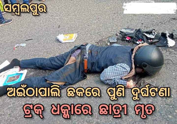 ଅଇଁଠାପାଲି ଛକରେ ମଙ୍ଗଳବାର ପୁଣି ଏକ ସଡ଼କ ଦୁର୍ଘଟଣା ଘଟିଛି I ଦୁର୍ଘଟଣାରେ ଜଣେ କଲେଜ୍ ଛାତ୍ରୀଙ୍କ ଅକାଳ ମୃତ୍ୟୁ ଘଟିଛି I ମୃତ ଛାତ୍ରୀ ଜଣକ ହେଉଛନ୍ତି କ୍ଷେତରାଜପୁର ଥାନା ପୋଦ୍ଦାର କଲୋନିର ଅଭିମନ୍ୟୁ ଭଗତଙ୍କ ବଡ଼ ଝିଅ ସୋନାଲ ଭଗତ(୨୧) I ଛାତ୍ରୀଙ୍କ ମୃତ୍ୟୁ ପରେ ଅଇଁଠାପାଲି ଛକରେ ଉତ୍ତ୍ୟକ୍ତ ଲୋକେ ରାସ୍ତାରୋକ କରି ବିକ୍ଷୋଭ ପ୍ରଦର୍ଶନ କରିଥିଲେ I ସୂଚନା ଅନୁଯାୟୀ, ବୁଢ଼ାରଜା ସ୍ଥିତ ରାଜକୁମାର କଲେଜ୍ ଅଫ୍ ଆଇଟି ମ୍ୟାନେଜ୍ମେଣ୍ଟରେ ବିସିଏ ଦ୍ବିତୀୟ ବର୍ଷର ଛାତ୍ରୀ ହେଉଛନ୍ତି ସୋନାଲ। ମଙ୍ଗଳବାର ସକାଳ ସାଢ଼େ ୧୦ଟାରେ ତାଙ୍କର ପ୍ରଥମ କ୍ଲାସ୍ ଥିଲା। କଲେଜ୍ ଆସୁଥିବା ବେଳେ ଅଇଁଠାପାଲି ଛକରେ ସକାଳ ୧୦ଟା ପାଖାପାଖି ଏକ ଟ୍ରକ୍(ଓଡି ୧୯ଜି ୬୭୭୬) ତାଙ୍କ ସ୍କୁଟି(ଓଡି ୧୫ଏନ୍ ୭୮୧୧)କୁ ଧକ୍କା ଦେଇଥିଲା। ଟ୍ରକ୍ଟି ଧକ୍କା ଦେବା ପରେ ସୋନାଲଙ୍କୁ ଚଢ଼ାଇ ଦ୍ରୁତ ଗତିରେ ଚାଲି ଯାଇଥିଲା। ସୋନଲଙ୍କୁ ଗୁରୁତର ଅବସ୍ଥାରେ ଉଦ୍ଧାର କରି ସ୍ଥାନୀୟ ଲୋକେ ସମ୍ବଲପୁର ଜିଲ୍ଲା ମୁଖ୍ୟ ଚିକିତ୍ସାଳୟକୁ ନେଇଥିଲେ। ସେଠାରେ ଡାକ୍ତର ତାଙ୍କୁ ମୃତ ଘୋଷଣା କରିଥିଲେ। ଫେରାର୍ ହୋଇଯାଉଥିବା ଟ୍ରକ୍କୁ ପୋଲିସ ପିଛା କରି ଭାଲୁପାଲି ନିକଟରେ ଧରିଥିଲା। ଏ ନେଇ ଅଭିଯୋଗ ହେବା ପରେ ପୋଲିସ ଏକ ମାମଲା ରୁଜୁ କରି ଘଟଣାର ତଦନ୍ତ ଆରମ୍ଭ କରିଥିଲା। ଟ୍ରକ୍ ଚାଳକ ଢେଙ୍କାନାଳ ବାଲିମି ଥାନା ଗୁଲେହି ଗାଁର ଅଶ୍ବିନୀ ସିଂକୁ ପୋଲିସ ଗିରଫ କରିଛି I