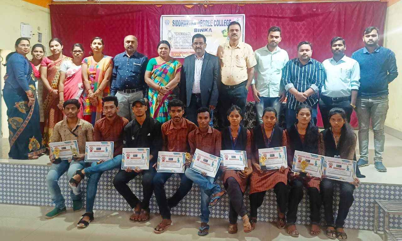 ବିନିକା(ହିମାଂଶୁ ଶେଖର ପୁଟେଲ)ରାଜ୍ୟରେ ସଦ୍ୟ ସମାପ୍ତ ହୋଇଥିବା ବିଶ୍ବସ୍ତରୀୟ ହକି ପ୍ରତିଯୋଗୀତା ପରିପ୍ରେକ୍ଷୀରେ ହକି ଖେଳର ପ୍ରଚାର ପ୍ରସାର ତଥା ଖେଳାଳି ମାନଙ୍କ ମନୋବଳ ଦୃଢ଼ କରିବା ନେଇ ବିନିକା ସିଦ୍ଧାର୍ଥ ଡିଗ୍ରୀ କଲେଜ ତରଫରୁ ବିଭିନ୍ନ ପ୍ରତିଯୋଗିତା ଅନୁଷ୍ଠିତ ହୋଇଥିଲା ।ଏଥିରେ ସଫଳତା ପାଇଥିବା ଛାତ୍ରଛାତ୍ରୀ ମାନଙ୍କୁ କଲେଜ ତରଫରୁ ଉତ୍ସାହିତ କରିବା ସହିତ ମାନପତ୍ର ପ୍ରଦାନ କରାଯାଇଛି ।ଡିଗ୍ରୀ କଲେଜ ଅଧ୍ୟକ୍ଷ ଡ଼ ଧୀରେନ୍ଦ୍ର କୁମାର ନାୟକଙ୍କ ସଭାପତିତ୍ବରେ ଅନୁଷ୍ଟିତ ପୁରସ୍କାର ବିତରଣୀ ଉତ୍ସବରେ ବିନିକା ବିଡିଓ ବ୍ୟାସଦେବ ବେହେରା ମୁଖ୍ୟଅତିଥି,ସିଦ୍ଧାର୍ଥ ଉଚ୍ଚ ମାଧ୍ୟମିକ ବିଦ୍ୟାଳୟ ଅଧ୍ୟକ୍ଷା ରେଖା ପ୍ରଧାନ,ଇତିହାସ ବିଭାଗ ମୁଖ୍ୟ ଗୋପାଳକୃଷ୍ଣ ଦାଶ ସମ୍ମାନିତ ଅତିଥି ଭାବେ ଯୋଗଦେଇ ବିଶ୍ୱକପ ହକିକୁ ନେଇ ଆୟୋଜିତ ଓଡ଼ିଆ ବକୃତା ପ୍ରତିଯୋଗୀତାରେ ଆଶିଷ କୁମାର ମେହେର ପ୍ରଥମ, ଉର୍ମିଳା କୁମ୍ଭାର ଦ୍ଵିତୀୟ, ପ୍ରିୟା ସୁନା ତୃତୀୟ,ଚିତ୍ର ଆଙ୍କିବାରେ ସୌମ୍ୟକନ୍ତ ମହଲା ପ୍ରଥମ, ହିମାଂଶୁ ବାଘ ଦ୍ଵିତୀୟ,ପ୍ରକାଶ