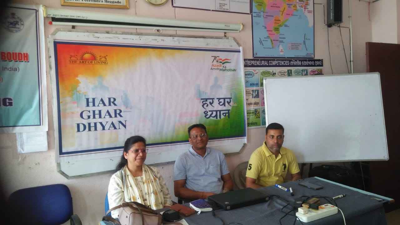 ମାଧ୍ୟମରେ ହର ଘର ଧ୍ୟାନ କାର୍ଯ୍ୟକ୍ରମ ସାରା ଦେଶରେ ଚାଲୁରହିଛି l ଏଥିରେ ମୁଖ୍ୟ ଅତିଥି ଭାବେ ଆର୍ଟ ଅଫ ଲିଭିଙ୍ଗ୍ ର ଟିଚର ଡ଼. ମମତା ମିଶ୍ର ଯୋଗଦେଇ ଶୁଭାରମ୍ଭ କରି ଉପସ୍ଥିତ ସମସ୍ତଙ୍କୁ ଯୋଗ, ଧ୍ୟାନ, ପ୍ରାଣାୟମ କରିବା ଦ୍ୱାରା କଣ ସବୁ ଲାଭ ହେଉଛି ବୁଝାଇଥିଲେ l ଧ୍ୟାନ କରିବା ଦ୍ଵାରା ଶାରୀରିକ ସୁସ୍ଥତା ଏବଂ ମାନସିକ ଶାନ୍ତି, ଏକାଗ୍ରତା, ଦୃଢ ଆତ୍ମ ବିଶ୍ବାସ, ଚିନ୍ତା ମୁକ୍ତ ଏବଂ ଆନନ୍ଦମୟ ଜୀବନ ଓ ସାଧାରଣ ମଣିଷ ଚାହୁଁ ଥିବା ଏକ ରୋଗ ମୁକ୍ତ ଶରୀର, ମାନସିକ ଦୁଶ୍ଚିନ୍ତା ଓ ବିଷାଦରୁ ମୁକ୍ତି, ଅବସାଦ ରୁ ମୁକ୍ତି ମିଳିବ ବୋଲି କହିଥିଲେ l 25 ମିନିଟ ର ଧ୍ୟାନ କଲାପରେ ସମସ୍ତେ ଆନନ୍ଦ ଉପଲବ୍ଧି କରିଥିବା ପ୍ରକାଶ କରିଥିଲେ l ଜୀବନରେ ପ୍ରତ୍ୱେକ୍ ଦିନ
