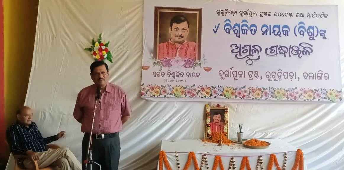 ବଲାଙ୍ଗୀର// ବିଶିଷ୍ଟ ସମାଜସେବୀ ପୂର୍ବତନ କ୍ରିକେଟ ଖେଳାଳୀ ରୁଗୁଡିପଡା ଦୁର୍ଗାପୂଜା ଟ୍ରଷ୍ଟ ର ଉପଦେଷ୍ଟା ପୂର୍ବତନ ଟେକ୍ସ ବାର ଆସୋସିଏସନର ସଭାପତି ସ୍ୱର୍ଗତ ବିଶ୍ୱଜିତ ନାୟକଙ୍କ ଦ୍ୱାଦଶାହରେ ବଲାଙ୍ଗିର ରୁଗୁଡିପଡା ଦୁର୍ଗାମଣ୍ଡପ ଠାରେ ଦୁର୍ଗାପୂଜା ଟ୍ରଷ୍ଟ ଆନୁକୂଲ୍ୟରେ ସ୍ୱର୍ଗତ ବିଶୁ ଦାଙ୍କୁ ଶୋକସଭା ମାଧ୍ୟମରେ ଅଶୃଳ ଶ୍ରଦ୍ଧାଞ୍ଜଳୀ ଜ୍ଞାପନ କରାଯାଇଥିଲା । ଏହି ସଭାରେ ସଭାପତିତ୍ୱ କରିଥିଲେ ଟ୍ରଷ୍ଟର ସଭାପତି ଚେତନାନନ୍ଦ ପଣ୍ଡା, ହରି ନାରାୟଣ ପୂଝାରୀଙ୍କ ଆବାହକତ୍ୱ ଏବଂ ବରିଷ୍ଠ ସାମ୍ବାଦିକ ସୁବାଷ ଚନ୍ଦ୍ର ପଣ୍ଡାଙ୍କ ସଂଯୋଜନାରେ ସଭା ଅନୁଷ୍ଠିତ ହୋଇଥିବା ବେଳେ ବିଶ୍ୱଜିତ ଦାଶ, କୃଷ୍ଣଚନ୍ଦ୍ର ମିଶ୍ର, ଗଣେଷ ଦୀକ୍ଷିତ, ରାଜୁ ଶର୍ମା, ସନାତନ ଠାକୁର, ଭବାନୀ ଶଙ୍କର ଶତପଥି, ରାହାସ ବିହାରୀ ମାଝି, ହିମାଂଶୁ ଶେଖର ପାଢି, ଲକ୍ଷ୍ମୀ ପଟ୍ଟନାୟକ,