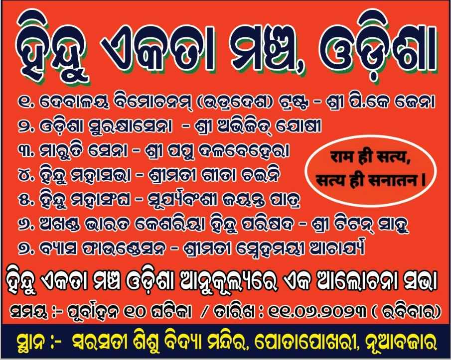 ନବରଙ୍ଗପୁର: ଓଡ଼ିଶାରେ ହିନ୍ଦୁ ଧର୍ମ ର ସୁରକ୍ଷା ପାଇଁ ଦେବାଳୟ ବିମୋଚନମ, ହିନ୍ଦୁ ମହାସଂଘ, ମାରୁତି ସେନା, ହିନ୍ଦୁ ମହାସଭା, କେଶରୀୟା ହିନ୍ଦୁ ପରିଷଦ, ଓଡ଼ିଶା ସୁରକ୍ଷା ସେନା ଏବଂ ବ୍ୟାସ ଫାଉଣ୍ଡେସନ ମିଳିତ ଭାବେ ହିନ୍ଦୁ ଏକତା ମଞ୍ଚ ଗଠନ କରିଛନ୍ତି। ହିନ୍ଦୁ ଧର୍ମ ଓ ଜଗନ୍ନାଥ ସଂସ୍କୃତିର ସୁରକ୍ଷା ଓ ସଂରକ୍ଷଣ ପାଇଁ ମିଳିତ ଭାବେ ଉଦ୍ୟମ କରାଯିବ । ଦେବାଳୟ ବିମୋଚନମ୍ ଟ୍ରଷ୍ଟ ର ମେନେଜିଂ ଟ୍ରଷ୍ଟି ଶ୍ରୀ ଟିକେ ଜେନା ଙ୍କ ଉଦ୍ୟମ କ୍ରମେ ଆସନ୍ତା ରବିବାର ଦିନ ଏକ ମିଳିତ ବୈଠକ କଟକ ଠାରେ ଅନୁଷ୍ଠିତ ହେବ । ସମସ୍ତ ସାତଟି ଓଡ଼ିଶାର ପ୍ରମୁଖ ସଂଗଠନ ର ମୁଖ୍ୟ କିମ୍ବା ସେମାନଙ୍କ ପ୍ରତିନିଧି ମାନେ ଯୋଗଦାନ କରିବେ । ଓଡ଼ିଶା, ଛତିଶଗଡ଼ ଓ ମଧ୍ୟ ପ୍ରଦେଶରେ ଦ୍ରୁତ ଗତିରେ ଅବିବୃଦ୍ଧି ହେଉଥିବା ହିନ୍ଦୁ ମହାସଂଘ ପାଇଁ ଏହା ଆହୁରି ଏକ ବଡ଼ ସଫଳତା ବୋଲି ମହାସଂଘ ପ୍ରମୁଖ ଜୟନ୍ତ କୁମାର ରାୟପାତ୍ର ମତବ୍ୟକ୍ତ କରିଛନ୍ତି। ବିଭିନ୍ନ ଅଞ୍ଚଳ ରେ ସକ୍ରିୟ ଥିବା ଏହି ସଂଗଠନ ଗୁଡ଼ିକ ମିଳିତ ଭାବେ ଏଥର ଧର୍ମ ରକ୍ଷା ପାଇଁ ଉଦ୍ୟମ କରିବେ। ସାତଟି ବୃହତ ହିନ୍ଦୁ ସଂଗଠନ ମିଳିତ ଭାବେ ଗୋଟିଏ ମଞ୍ଚରେ ଆସିବା ଆଗାମୀ ଦିନରେ ଓଡିଶା ପାଇଁ ଏକ ଶୁଭ ସଂକେତ ବୋଲି ହିନ୍ଦୁ ରାଷ୍ଟ୍ର ବାଦୀ ମାନେ ମତବ୍ୟକ୍ତ କରିଛନ୍ତି।