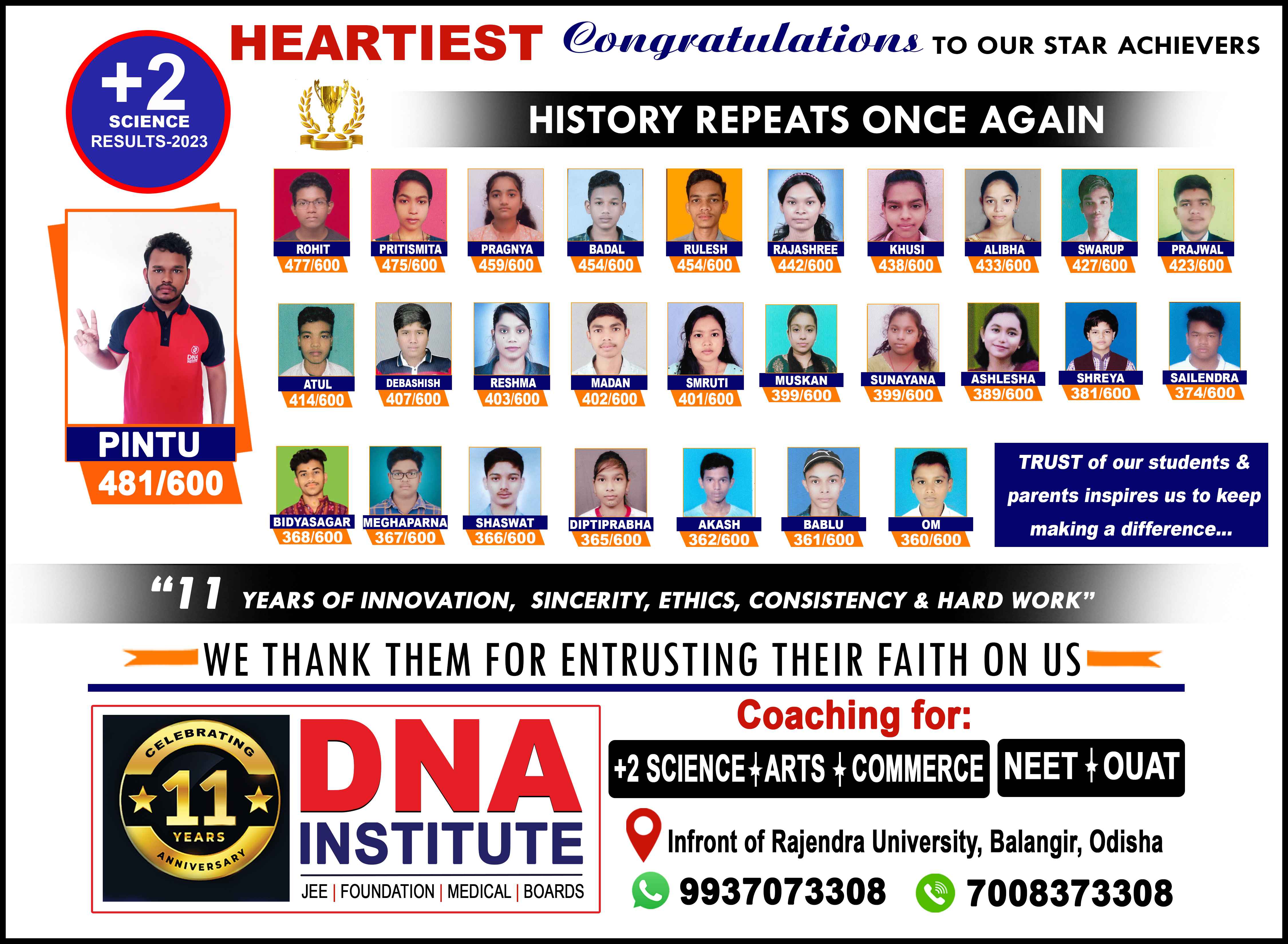 ବଲାଙ୍ଗିର, ଗତ ମେ ୩୧ ତାରିଖ ଦିନ +୨ ବିଜ୍ଞାନ ପରିକ୍ଷାଫଳ ପ୍ରକାଶିତ ହୋଇଛି । ଏଥିରେ ବଲାଙ୍ଗୀରର ଅଗ୍ରଣୀ ଘରୋଇ ଶିକ୍ଷାନୁଷ୍ଠାନ ଡିଏନ୍ଏର ଛାତ୍ରଛାତ୍ରୀ ମାନେ ଉଲ୍ଲେଖନୀୟ ସଫଳତା ହାସଲ କରି ଜିଲ୍ଲାର ଗୌରବ ବୃଦ୍ଧି କରିଛନ୍ତି । ଅନୁଷ୍ଠାନର ଛାତ୍ର ପିଣ୍ଟୁ ବାରିକ ମୋଟ ୬ଠଠ ରୁ ୪୮୧ ମାର୍କ ଆଣି ଡିଏନ୍ଏ ଇନ୍ଷ୍ଟିଚ୍ୟୁଟର ଟପ୍ପର ଛାତ୍ର ମାନ୍ୟତା ପାଇଛନ୍ତି । ଠିକ ସେହିପରି +୨ କଳା ପରୀକ୍ଷାରେ ଅନୁଷ୍ଠାନର ଆଉ ଜଣେ ମେଧାବୀ ଛାତ୍ର ଶୁଭମ୍ ସାହୁ ମୋଟ ୬ଠଠରୁ ୫୨୧ ମାର୍କ ଆଣି ଡିଏନ୍ଏ ଟପ୍ପର ହେବାର ଗୌରବ ହାସଲ କରିଛନ୍ତି । ଶୁଭମ୍ ତର୍କଶାସ୍ତ୍ରରେ ମୋଟ ୧ଠଠ ମାର୍କ ରୁ ୯୯ ମାର୍କ ଆଣି ଶତପ୍ରତିଶତ ସଫଳତା ହାସଲ କରିଛନ୍ତି । ପରୀକ୍ଷାରେ ସଫଳତା ହାସଲ କରିଥିବା ଛାତ୍ରଛାତ୍ରୀ ମାନଙ୍କୁ ଡିଏନ୍ଏ ଇନ୍ଷ୍ଟିଚ୍ୟୁଟର ନିର୍ଦ୍ଦେଶକ ବିନୀତ ଅଗ୍ରୱାଲ ଶୁଭେଚ୍ଛା ଜଣାଇଛନ୍ତି । ସୂଚନାଯୋଗ୍ୟ ଯେ, ଦୀର୍ଘ ୧୧ ବର୍ଷ ଧରି ବଲାଙ୍ଗୀର ଜିଲ୍ଲାରେ +୨ ବିଜ୍ଞାନ, କଳା ଓ ବାଣିଜ୍ୟରେ ଅଧ୍ୟୟନ କରୁଥିବା ଛାତ୍ରଛାତ୍ରୀଙ୍କ ପାଇଁ ଏକ ବିଶ୍ୱାସଯୋଗ୍ୟ ଶିକ୍ଷାନୁଷ୍ଠାନ ଡିଏନ୍ଏ ତାର ସଫଳତାର ଜୟଯାତ୍ରା ଜାରି ରଖିଛି ।