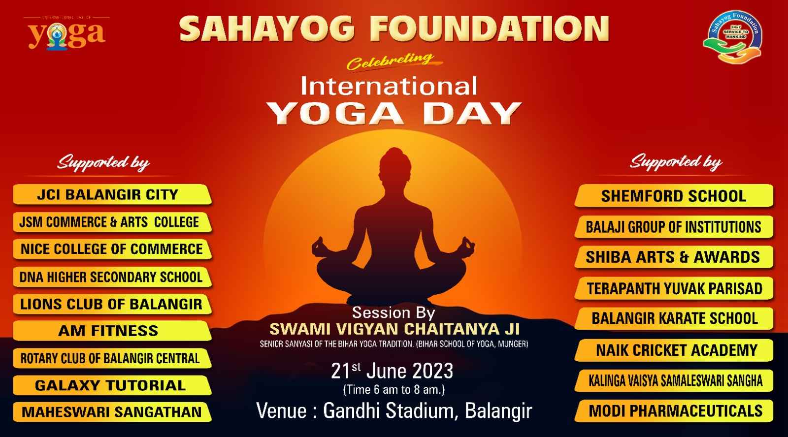 ମୁଙ୍ଗେର ଯୋଗଗୁରୁ ସ୍ୱାମୀ ବିଜ୍ଞାନ ଚୈତନ୍ୟ ଜୀ ଙ୍କ ଦ୍ୱାରା ଏହି ଯୋଗ ଶିବିର ପରିଚାଳିତ ହେବ | ଏହି ଦିବସରେ ବଲାଙ୍ଗିର ସାଂସଦ ଶ୍ରୀମତୀ ସଂଗୀତା ସିଂଦେଓ , ବଲାଙ୍ଗିର ଜିଲ୍ଲାପାଲ ଚଞ୍ଚଲ ରାଣା, ପୋଲିସ ଅଧୀକ୍ଷକ ଋଷିକେଶ ଖିଲାରୀ, ନଗରପାଳିକା ଅଧ୍ୟକ୍ଷ ଶ୍ରୀମତୀ ଲିକା ସାହୁ ଅତିଥି ଭାବରେ ଯୋଗଦେବେ। ଆନ୍ତର୍ଜାତୀୟ ଯୋଗ ଦିବସ ରେ ଅଧିକ ରୁ ଅଧିକ ଲୋକ ଉପସ୍ଥିତ ରହି କାର୍ଯ୍ୟକ୍ରମକୁ ସଫଳ କରିବା ପାଇଁ ଡ଼କ୍ଟର ପଞ୍ଚାନନ ପ୍ରଧାନ ,ଆର୍ତତ୍ରାଣ ପାଢ଼ୀ , ପୀୟୁଷ ଅଗ୍ରୱାଲ, ଅବ୍ନିଶ ଅଗ୍ରୱାଲ, ପରେଶ ଅଗ୍ରୱାଲ , ପ୍ରଭାତ ଶ୍ରୀବାସ୍ତବ ଏବଂ ସହଯୋଗ ଫାଉଣ୍ଡେସନର ସମ୍ପାଦିକା ପିଙ୍କି ମୋଦି ଅନୁରୋଧ କରିଛନ୍ତି l