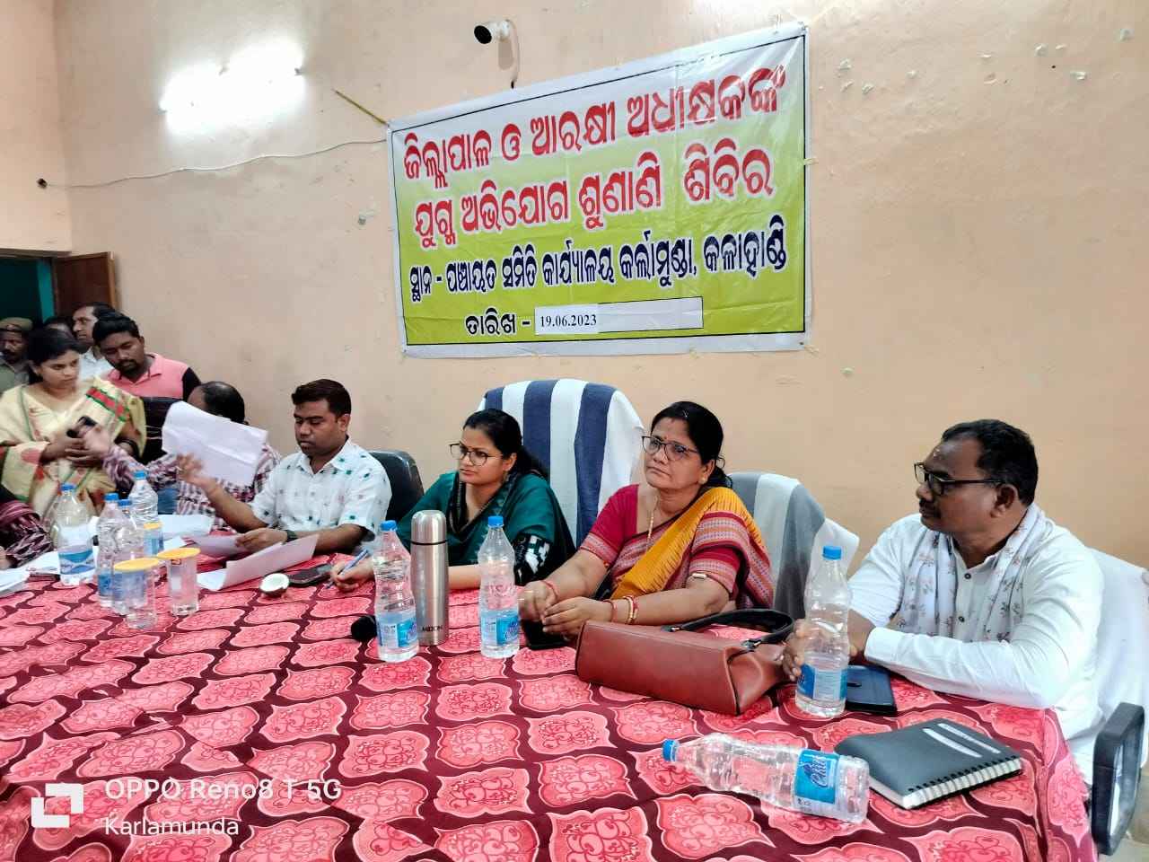 କଳାହାଣ୍ଡି(ଦୁଷ୍ମନ୍ତ କୁମାର ପଣ୍ଡା ): ଆଜି କର୍ଲାମୁଣ୍ଡା ବ୍ଲକ ସ୍ଥିତ ପଂଚାୟତ ସମିତି ସମ୍ମିଳନୀ ଗୃହରେ ଜିଲ୍ଲାପାଳ ପି ଅନ୍ୱେଷା ରେଡ୍ଡୀଙ୍କ ଅଧକ୍ଷତାରେ ଏକ ଜନ ଶୁଣାଣି ଶିବିର ଅନୁଷ୍ଠିତ ହୋଇଯାଇଛି। ଏଥିରେ ଉପ ଜିଲ୍ଲାପାଳ, ଭବାନୀପାଟଣାଡ ବିଶ୍ୱଜିତ୍ ଦାସ, ବ୍ଲକ ଅଧ୍ୟକ୍ଷା କୁନି ସାହୁଙ୍କ ସମେତ ସମସ୍ତ ଜିଲ୍ଲା ସ୍ତରୀୟ ବିଭାଗୀୟ ଅଧିକାରୀ ଉପସ୍ଥିତ ଥିଲେ।