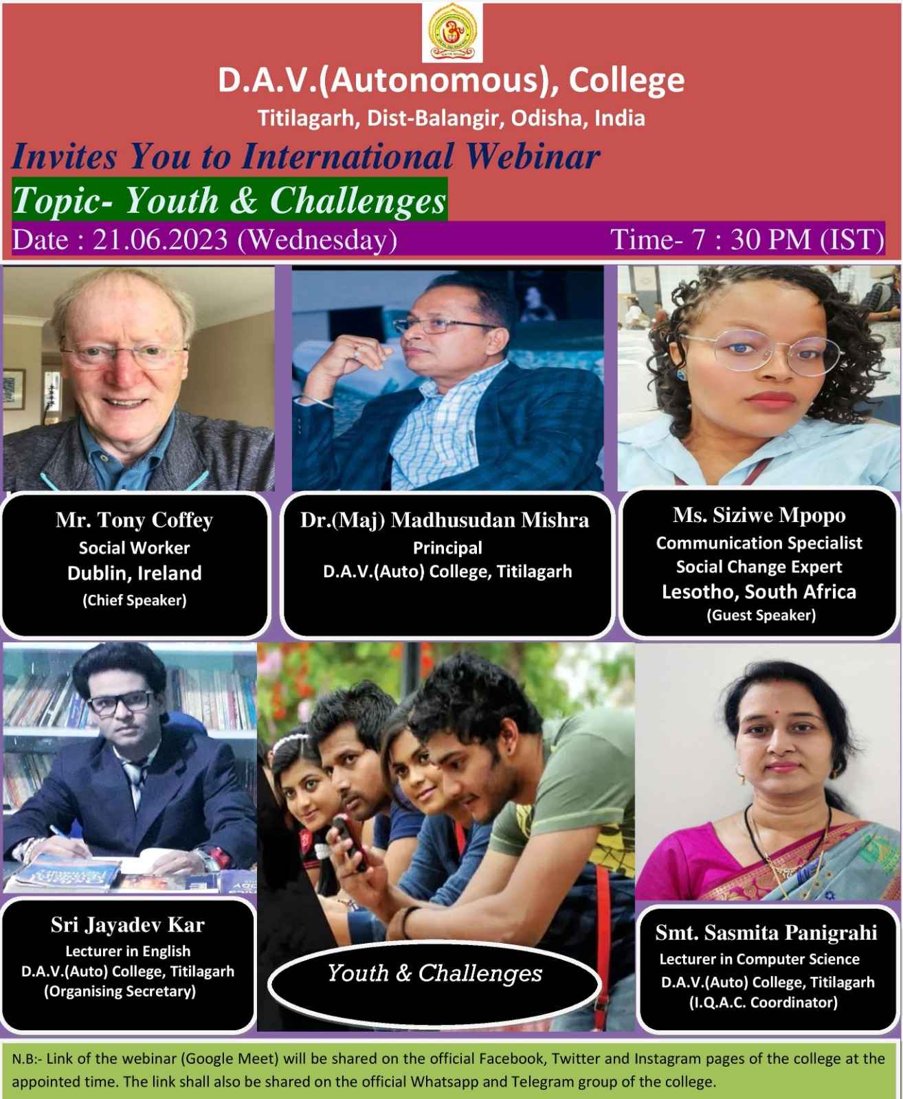 ଟିଟିଲାଗଡ଼ (ପ୍ରେରଣା ଖବର ):lଡି. ଏ. ଭି. (ସ୍ୱୟଂ ଶାସିତ) ମହାବିଦ୍ୟାଳୟ , ଟିଟିଲାଗଡ଼ ତରଫରୁ "ଯୁବାବସ୍ଥାରେ ସାମାଜିକ ଦାୟିତ୍ୱବୋଧ " ଉପରେ ଏକ ଆନ୍ତର୍ଜାତିକ ୱେବିନାର ଅନୁଷ୍ଠିତ ହୋଇଯାଇଛି I ଇଂରାଜୀ ଅଧ୍ୟାପକ ଜୟଦେବ କର ଙ୍କ ସଂଯୋଜନା ହୋଇଥିବା ଏହି ୱେବିନାର ରେ ଆୟରଲ୍ୟାଣ୍ଡ ସ୍ଥିତ ଡବ୍ଲିନ ସହର ର ବରିଷ୍ଠ ସମାଜ ସେବୀ ଶ୍ରୀଯୁକ୍ତ ଟୋନି କୋଫି ମୁଖ୍ୟ ବକ୍ତା ଏବଂ ଦକ୍ଷିଣ ଆଫ୍ରିକା ର ଲେଶିଥି ସହରର ନାରୀବାଦୀ ସମାଜସେବୀ ଶ୍ରୀମତୀ ସିଜୁ ମୁପୋ ଅତିଥି ବକ୍ତା ଭାବରେ ଯୋଗ ଦେଇଥିଲେ I କଲେଜ ଅଧ୍ୟକ୍ଷ ପ୍ରଫେସର ମେଜର ଡ. ମଧୁସୂଦନ ମିଶ୍ର ଏହି ୱେବିନାର କୁ ଆନୁଷ୍ଠାନିକ ଭାବେ ଉଦ୍ଘାଟନ କରି ସାରଗର୍ଭକ ସ୍ବାଗତ ଭାଷଣ ଦେଇଥିଲେ I କଲେଜ ର ଆଇ. କ୍ୟୁ. ଏ. ସି କୋର୍ଡିନେଟର ଅଧ୍ୟାପିକା ସସ୍ମିତା ପାଣିଗ୍ରାହୀ ନିମନ୍ତ୍ରିତ ଅତିଥି ଙ୍କ ପରିଚୟ ପ୍ରଦାନ କରିଥିଲେ I ପ୍ରଫେସର ବିଧାନ ଚନ୍ଦ୍ର ମିଶ୍ର ଡି ଏ ଭି ମହାବିଦ୍ୟାଳୟ ର ଗୌରବମୟ ଐତିହ୍ୟ ବାବଦରେ ସୂଚନା ଦେଇଥିଲେ I ମୁଖ୍ୟ ବକ୍ତା ଟୋନି କଫି ଯୁବକ ମାନଙ୍କୁ ପରିବେଶ ସନ୍ତୁଳନ ଦିଗରେ କାର୍ଯ୍ୟ କରି ଅଧିକରୁ ଅଧିକ ବୃକ୍ଷ ରୋପଣ ଏବଂ ଅଙ୍ଗାରକାମ୍ଳ ର ବିଶ ବଳୟ ରୁ ପୃଥିବୀକୁ ରକ୍ଷା କରିବାକୁ ପରାମର୍ଶ ଦେଇଥିଲେ I ସମ୍ମାନିତ ଅତିଥି ସିଜୁ ମୁପୋ ଦକ୍ଷିଣ ଏସିଆ ଏବଂ ଆଫ୍ରିକୀୟ ଦେଶ ମାନଙ୍କରେ ଯୁବତୀ ମାନେ ସାମ୍ନା କରୁଥିବା ସମସ୍ୟା ଏବଂ ତହିଁର ସମାଧାନ ଉପରେ ଆଲୋକପାତ କରିଥିଲେ I ପ୍ରଫେସର ଡ ରମାକାନ୍ତ ବେହେରା ନାଗରିକ ଦାୟିତ୍ଵ ବୋଧ ଉପରେ ବକ୍ତବ୍ୟ ରଖିଥିବା ବେଳେ ପ୍ରଫେସର କୃଷ୍ଣ ଚନ୍ଦ୍ର ଶତପଥି ସାଂପ୍ରତିକ ପରିସ୍ଥିି ଉପରେ ବକ୍ତବ୍ୟ ରଖିଥିଲେ I ଏହି ୱେବିନାର ରେ କଲେଜ ର ବରିଷ୍ଠ ପ୍ରାଧ୍ୟାପକ ଡ. ପ୍ରଣବ କିଶୋର ପୁରୋହିତ, ଡ. ନନ୍ଦ କିଶୋର ହୋତା, ଡ. ଉମେଶ ଚନ୍ଦ୍ର ସାହୁ, ଡ. ଉମାକାନ୍ତ ସାହୁ, ତଥା ଅଧ୍ୟାପକ ରାକେଶ ସେଠୀ, ମଳୟସେନ୍ ଜ୍ୟୋତିଷ, ବେଦ ବର ରଣା, ବୈଷ୍ଣବ କବାଟ,ସୁଶାନ୍ତ କୁମାର ପଟ୍ଟନାୟକ ତଥା ମାଲକାନଗିରି ଜିଲ୍ଲା ର ବରିଷ୍ଠ ଅଧ୍ୟାପକ ଡ. ରଞ୍ଜନ କୁମାର ସ୍ବାଇଁ ଯୋଗ ଦେଇଥିଲେ I ସେହିପରି ଟିଟିଲାଗଡ଼ କଲେଜର ଅଧ୍ୟାପିକା ଡ.ଦେବୀ କେ,ସବ୍ୟାରାଣୀ ସୁନା, ରୋଜାଲି ସେଠୀ, ବନ୍ଦନା କର, କର୍ମଚାରୀ ତଥା ସାହିତ୍ୟିକ ସଞ୍ଜୟ ଅଗସ୍ତି, ବିନୋଦ ପଟ୍ଟନାୟକ, ଚିର ପଟ୍ଟନାୟକ ବିବିବେକାନନ୍ଦ ପାଣିଗ୍ରାହୀ, ରିମନ୍ ରଣା, ଲାଇବ୍ରେରୀଆନ୍ ରତ୍ନାକର ନାୟକ, ତଥା ଅନେକ ଛାତ୍ର ଛାତ୍ରୀ ଯୋଗ ଦେଇଥିଲେ I ସଂଯୋଜକ ଜୟଦେବ କର ଧନ୍ୟବାଦ୍ ଅର୍ପଣ କରି ଅତିଥି ଦ୍ବୟ ଙ୍କୁ ଓଡ଼ିଶା ଆସିବା ପାଇଁ ଅନୁରୋଧ କରିଥିଲେ I