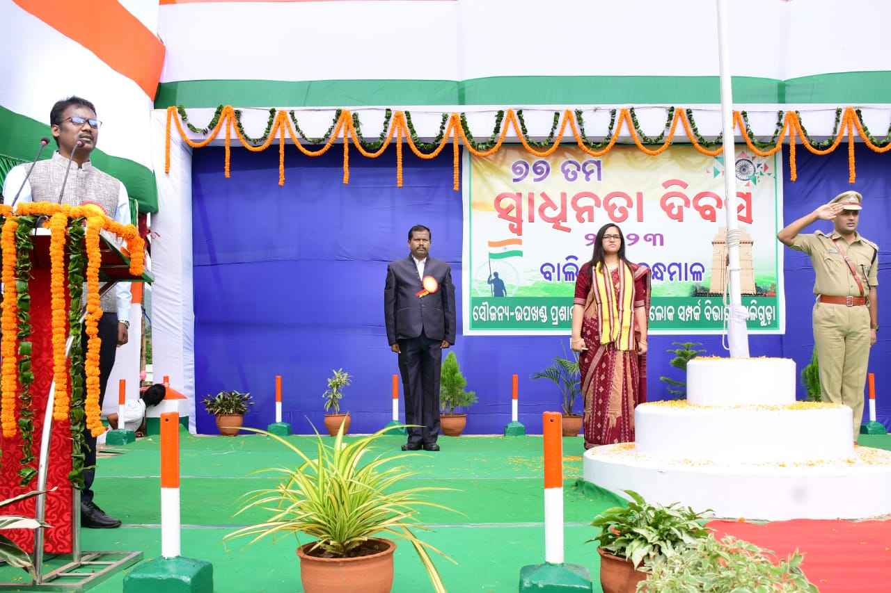 ତରଫରୁ ସମଗ୍ର ସହରରେ ରାମ ଧୂନ ପରିବେଷଣ, ସକାଳ ୭ ଟା ରେ ଉପଖଣ୍ଡ ର ସମସ୍ତ ସରକାରୀ ଓ ବେସରକାରୀ ଅନୁଷ୍ଠାନ ତଥା ଶିକ୍ଷାନୁଷ୍ଠାନ ମାନଙ୍କରେ ଜାତୀୟ ପତାକା ଉତ୍ତୋଳନ କରାଯାଇଥିଲା l ପରେ ପରେ ସ୍ଥାନୀୟ ଏନଏସି ଏବଂ ବିଭିନ୍ନ ଅନୁଷ୍ଠାନ ତଥା ବୁଦ୍ଧିଜୀବୀ ଙ୍କ ତରଫରୁ ଜାତିର ପିତା ମହାତ୍ମା ଗାନ୍ଧୀ ଓ ଜବାହର ଲାଲ ନେହେରୁ ଙ୍କ ପ୍ରତିମୂର୍ତ୍ତି ରେ ପୁଷ୍ପ ମାଲ୍ୟାର୍ପଣ କରିଥିଲେ l ବିଜୁ ପଟ୍ଟନାୟକ ମିନିଷ୍ଟାଡିୟମରେ ଆୟୋଜିତ ପ୍ୟାରେଡ ଉତ୍ସବ ରେ ସ୍ଥାନୀୟ ଉପଜିଲ୍ଲାପାଳ ଏମ.ଏସ. ମଧୁମିତା ମୁଖ୍ୟ ଅତିଥି ଭାବେ ଯୋଗ ଦେଇ ଜାତୀୟ ପତାକା ଉତ୍ତୋଳନ କରିବା ସହ ଅଭିବାଦନ ଗ୍ରହଣ କରି ସ୍ୱାଧୀନତାର ପରିଭାଷା ଭିନ୍ନ ଭିନ୍ନ ହୋଇଥାଏ ଯାହାକି, ସ୍ବାଧିନତା ପାଇବା ବହୁତ କଷ୍ଟକର କିନ୍ତୁ ସ୍ବାଧିନତାକୁ ସାଇତି ରଖିବା, ସ୍ବାଧିନତାକୁ ସୁରକ୍ଷିତ ରଖିବା ଏବଂ କିଛି ଦିନ ପରେ ସ୍ବାଧୀନତାକୁ ଆଉ କାହାକୁ ଦେବା ଅଧିକ କଷ୍ଟକର ବୋଲି ଉପଜିଲ୍ଲାପାଳ ନିଜ ବକ୍ତବ୍ୟ ରେ କହିଥିଲେ ।ଏଥିରେ ଅନ୍ୟ ଅତିଥି ମାନଙ୍କ ମଧ୍ୟରେ ଉପଖଣ୍ଡ ଆରକ୍ଷୀ ଅଧିକାରୀ ୟସ ପ୍ରତାପ ଶ୍ରୀମଲଙ୍କ ସମେତ ସହରର ବିଶିଷ୍ଠ ମାନ୍ୟଗଣ୍ୟ ବ୍ୟକ୍ତି, ବୁଦ୍ଧିଜୀବୀ ପ୍ରମୁଖ ଉପସ୍ଥିତ ଥିଲେ । ଉକ୍ତ ସାମୁହିକ ପ୍ୟାରେଡ଼ରେ ତିରିଶ ଗୋଟି ବିଦ୍ୟାଳୟର ପ୍ୟାରେଡ ଦଳ ଭାଗ ନେଇଥିବା ବେଳେ ବାଲିଗୁଡା ଉପଖଣ୍ଡରେ ଆୟୋଜିତ ବିଭିନ୍ନ ପ୍ରତିଯୋଗିତା ତଥା ବିଭିନ୍ନ କ୍ଷେତ୍ରରେ ପାରିଦର୍ଶିତା ଲାଭ କରିଥିବା ବ୍ୟକ୍ତି ବିଶେଷ ମାନଙ୍କୁ ମୁଖ୍ୟ ଅତିଥିଙ୍କ ଦ୍ବାରା ସମ୍ମାନିତ କରାଯାଇଥିଲା । ମଧ୍ୟାହ୍ନ ରେ ଉପଖଣ୍ଡ ଚିକିତ୍ସାଳୟରେ ରୋଗୀ ମାନଙ୍କୁ ଓ ସ୍ଥାନୀୟ କାରାଗାର ର ଅନ୍ତେବାସୀ ମାନଙ୍କୁ ଅତିଥି ମାନଙ୍କ ଦ୍ୱାରା ଫଳ ଓ ମିଷ୍ଟାନ ବଣ୍ଟନ କରାଯାଇଥିଲା l ଅପରାହ୍ନରେ ଏକ ଭଳିବଲ ମ୍ୟାଚର ଫାଇନାଲ ଖେଳ ଆୟୋଜିତ ହୋଇଥିଲା l ସନ୍ଧ୍ୟାରେ ଉପଜିଲ୍ଲାପାଳ ଙ୍କ ସମ୍ମିଳନୀ କକ୍ଷ ରେ ଏକ ବନ୍ଧୁ ମିଳନର କାର୍ଯ୍ୟକ୍ରମ ଆୟୋଜିତ ହୋଇଥିଲା l ଏହି ସମସ୍ତ କାର୍ଯ୍ୟକ୍ରମରେ ବାଲିଗୁଡ଼ା ଥାନା ଅଧିକାରୀ ବାବା ଶଙ୍କର