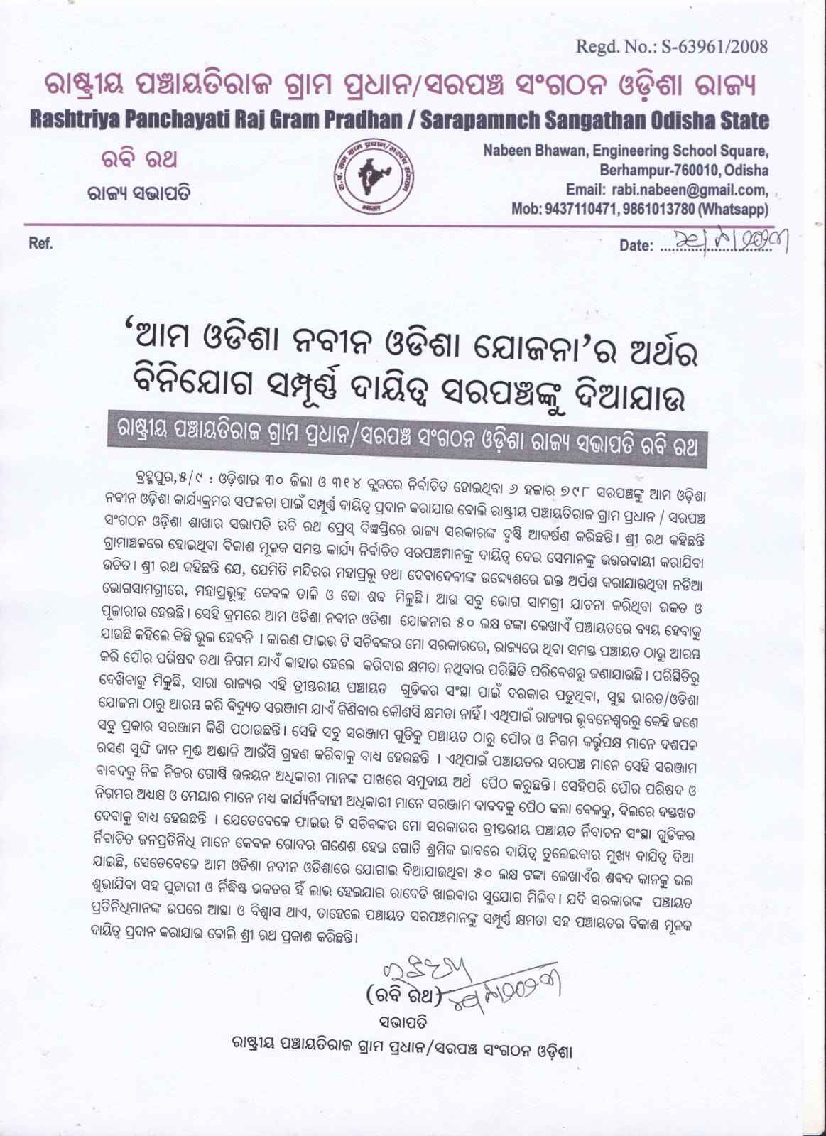 ସମ୍ବଲପୁର :(ସଂଜୀବକୁମାରପାଣିଗ୍ରାହୀ )ଓଡ଼ିଶାର ୩୦ ଜିଲା ଓ ୩୧୪ ବ୍ଲକରେ ନର୍ବାଚିତ ହୋଇଥିବା ୬ହଜାର ୭୯୮ ସରପଞ୍ଚଙ୍କୁ ଆମ ଓଡ଼ିଶା ନବୀନ ଓଡ଼ିଶା କାଯର୍ୟକ୍ରମର ସଫଳତା ପାଇଁ ସମ୍ପୂର୍ଣ୍ଣ ଦାୟିତ୍ବ ପ୍ରଦାନ କରାଯାଉ ବୋଲି ରାଷ୍ଟ୍ରୀୟ ପଞ୍ଚାୟତିରାଜ ଗ୍ରାମ ପ୍ରଧାନ / ସରପଞ୍ଚ ସଂଗଠନ ଓଡ଼ିଶା ଶାଖାର ସଭାପତି ରବି ରଥ ପ୍ରେସ୍ ବିଜ୍ଞପ୍ତିରେ ରାଜ୍ୟ ସରକାରଙ୍କ ଦୃଷ୍ଟି ଆକର୍ଷଣ କରିଛନ୍ତି ଶ୍ରୀ ରଥ କହିଛନ୍ତି ଗ୍ରାମାଞ୍ଚଳରେ ହୋଇଥିବା ବିକାଶ ମୂଳକ ସମସ୍ତ କାଯର୍ୟ ନର୍ବାଚିତ ସରପଞ୍ଚମାନଙ୍କୁ ଦାୟିତ୍ବ ଦେଇ ସେମାନଙ୍କୁ ଉତ୍ତରଦାୟୀ କରାଯିବା ଉଚିତ ଶ୍ରୀ ରଥ କହିଛନ୍ତି ଯେ, ଯେମିତି ମନ୍ଦିରର ମହାପ୍ରଭୂ ତଥା ଦେବାଦେବୀଙ୍କ ଉଦ୍ଦ୍ୟେଶରେ ଭକ୍ତ ଅର୍ପଣ କରାଯାଉଥିବା ନଡିଆ ଭୋଗସାମଗ୍ରୀରେ, ମହାପ୍ରଭୂଙ୍କୁ କେବଳ ତାଳି ଓ ଢୋ ଶବ୍ଦ ମିଳୁଛି ଆଉ ସବୁ ଭୋଗ ସାମଗ୍ରୀ ଯାଚନା କରିଥିବା ଭକତ ଓ ପୂଜାରୀର ହେଉଛି ସେହି କ୍ରମରେ ଆମ ଓଡିଶା ନବୀନ ଓଡିଶା ଯୋଜନାର ୫୦ ଲକ୍ଷ ଟଙ୍କା ଲେଖାଏଁ ପଞ୍ଚାୟତରେ ବ୍ୟୟ ହେବାକୁ ଯାଉଛି କହିଲେ କିଛି ଭୂଲ ହେବନି କାରଣ ଫାଇଭ ଟି ସଚିବଙ୍କର ମୋ ସରକାରରେ, ରାଜ୍ୟରେ ଥିବା ସମସ୍ତ ପଞ୍ଚାୟତ ଠାରୁ ଆରମ୍ଭ କରି ପୌର ପରିଷଦ ତଥା ନିଗମ ଯାଏଁ କାହାର ହେଲେ କରିବାର କ୍ଷମତା ନଥିବାର ପରିସ୍ଥିତି ପରିବେଶରୁ ଜଣାଯାଉଛି ପରିସ୍ଥିତିରୁ ଦେଖିବାକୁ ମିଳୁଛି, ସାରା ରାଜ୍ୟର ଏହି ତ୍ରୀସ୍ତରୀୟ ପଞ୍ଚାୟତ ଗୁଡିକର ସଂସ୍ଥା ପାଇଁ ଦରକାର ପଡୁଥିବା, ସୁସ୍ଥ ଭାରତ/ଓଡିଶା ଯୋଜନା ଠାରୁ ଆରମ୍ଭ କରି ବିଦୁ୍ୟତ ସରଞ୍ଜାମ ଯାଏଁ କିଣିବାର କୌଣସି କ୍ଷମତା ନାହିଁ ଏଥିପାଇଁ ରାଜ୍ୟର ଭୂବନେଶ୍ବରରୁ କେହି ଜଣେ ସବୁ ପ୍ରକାର ସରଞ୍ଜାମ କିଣି ପଠାଉଛନ୍ତି ସେହି ସବୁ ସରଞ୍ଜାମ ଗୁଡିକୁ ପଞ୍ଚାୟତ ଠାରୁ ପୌର ଓ ନିଗମ କର୍ତ୍ତୃପକ୍ଷ ମାନେ ଦଶପଳ ରସଣ ସୁଙ୍ଘି କାନ ମୁଣ୍ଡ ଅଣ୍ଡାଳି ଆଉଁସି ଗ୍ରହଣ କରିବାକୁ ବାଧ୍ୟ ହେଉଛନ୍ତି ଏଥିପାଇଁ ପଞ୍ଚାୟତର ସରପଞ୍ଚ ମାନେ ସେହି ସରଞ୍ଜାମ ବାବଦକୁ ନିଜ ନିଜର ଗୋଷ୍ଠି ଉନ୍ନୟନ ଅଧିକାରୀ ମାନଙ୍କ ପାଖରେ ସମୁଦାୟ ଅର୍ଥ ପୈଠ କରୁଛନ୍ତି ସେହିପରି ପୌର ପରିଷଦ ଓ ନିଗମର ଅଧ୍ୟକ୍ଷ ଓ ମେୟାର ମାନେ ମଧ୍ୟ କାଯର୍ୟନିର୍ବାହୀ ଅଧିକାରୀ ମାନେ ସରଞ୍ଜାମ ବାବଦକୁ ପୈଠ କଲା ବେଳକୁ, ବିଲରେ ଦସ୍ତଖତ ଦେବାକୁ ବାଧ୍ୟ ହେଉଛନ୍ତି ଯେତେବେଳେ ଫାଇଭ ଟି ସଚିବଙ୍କର ମୋ ସରକାରର ତ୍ରୀସ୍ତରୀୟ ପଞ୍ଚାୟତ ନିର୍ବାଚନ ସଂସ୍ଥା ଗୁଡିକର ନିର୍ବାଚିତ ଜନପ୍ରତିନିଧି ମାନେ କେବଳ ଗୋବର ଗଣେଶ ହେଇ ଗୋତି ଶ୍ରମିକ ଭାବରେ ଦାୟିତ୍ବ ତୁଲେଇବାର ମୁଖ୍ୟ ଦାଯିତ୍ବ ଦିଆ ଯାଇଛି, ସେତେବେଳେ ଆମ ଓଡିଶା ନବୀନ ଓଡିଶାରେ ଯୋଗାଇ ଦିଆଯାଉଥିବା ୫୦ ଲକ୍ଷ ଟଙ୍କା ଲେଖାଏଁର ଶବଦ କାନକୁ ଭଲ ଶୁଭାଯିବା ସହ ପୁଜାରୀ ଓ ନିର୍ଦ୍ଧିଷ୍ଟ ଭକତର ହିଁ ଲାଭ ହେଇଯାଇ ରାବେଡି ଖାଇବାର ସୁଯୋଗ ମିଳିବ ଯଦି ସରକାରଙ୍କ ପଞ୍ଚାୟତ ପ୍ରତିନିଧିମାନଙ୍କ ଉପରେ ଆସ୍ଥା ଓ ବିଶ୍ବାସ ଥାଏ, ତାହେଲେ ପଞ୍ଚାୟତ ସରପଞ୍ଚମାନଙ୍କୁ ସମ୍ପୂର୍ଣ୍ଣ କ୍ଷମତା ସହ ପଞ୍ଚାୟତର ବିକାଶ ମୂଳକ ଦାୟିତ୍ବ ପ୍ରଦାନ କରାଯାଉ ବୋଲି ଶ୍ରୀ ରଥ ପ୍ରକାଶ କରିଛନ୍ତି । ଶ୍ରୀ ରଥଙ୍କ ଏହି ଦାବି ଯୁକ୍ତିଯୁକ୍ତ ଓ ପଞ୍ଚାୟତ ରାଜ ସାମ୍ଭିଧାନିକ ବ୍ୟବସ୍ଥାକୁ ସରପଞ୍ଚ୍ ହାତରେ ନ୍ୟସ୍ତ କରି ସରକାର ତ୍ରିସ୍ତରୀୟ ପଞ୍ଚାୟତ ବ୍ୟବସ୍ଥା