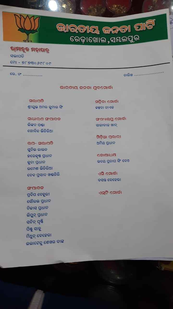 ରେଢ଼ାଖୋଲ ( ଅନିଲ କୁମାର ପୃଷ୍ଟି ) ଆଜି ଭାରତୀୟ ଜନତା ଯୁବ ମୋର୍ଚ୍ଚା ରେଢ଼ାଖୋଲ ନଗର ସଭାପତି ଶ୍ରୀଯୁକ୍ତ ଅମର କୁମାର ସିଂ ଙ୍କ ନେତୃତ୍ବରେ ଏକ ବୈଠକରେ ନିଜର ଯୁବ ଟିମ୍ ଘୋଷଣା କରିଛନ୍ତି । ଉକ୍ତ ବୈଠକରେ ବିଜେପି ରାଜ୍ୟ କାର୍ଯ୍ୟକାରିଣୀ ସଦସ୍ୟ ଦେବେନ୍ଦ୍ର ମହାପାତ୍ର , ଜିଲ୍ଲା ଉପସଭାପତି ବିଚିତ୍ରାନନ୍ଦ ସାହୁ , ସାଂସଦ ପ୍ରତିନିଧି ଶିବରାମ ସାହୁ, ନଗର ସଭାପତି ରାମାନୁଜ ମହାପାତ୍ର , ସାଧାରଣ ସଂପାଦକ ନରେନ୍ଦ୍ର ମଲ୍ଲିକ, ରାଜେନ୍ଦ୍ର ପ୍ରସାଦ ବୈଠାରୁଙ୍କ ଅନୁମୋଦନ କ୍ରମେ ସାଧାରଣ ସଂପାଦକ ଭାବେ - ଲିଙ୍କନ ପଣ୍ଡା ଓ ଗୋବିନ୍ଦ ଭିତିରିଆ , ଉପସଭାପତି ଭାବରେ ସୁନିଲ ରାଉତ , ହରେକୃଷ୍ଣ ପ୍ରଧାନ , କୁନା ପ୍ରଧାନ , ଉମେଶ ଭିତିରିଆ ଓ ଦେବପ୍ରସାଦ ଖଣ୍ଡଗିରି , ସଂପାଦକ ଭାବେ ପ୍ରଦୀପ ଦେହୁରୀ , ସୈାରଭ ପ୍ରଧାନ , ନିକାସ ପ୍ରଧାନ , ଲିପୁନ ପ୍ରଧାନ , ସଚିନ ପୃଷ୍ଟି , ପିଣ୍ଟୁ ସାହୁ , ମିଥୁନ ବେହେରା ଓ ଲଲାଟେନ୍ଦୁ ଶେଖର ବାଙ୍କ ଙ୍କୁ ମୋନନିତ କରାଯାଇଛି , କୋଷାଧ୍ୟକ୍ଷ ଭାବେ ଉଦୟ ପ୍ରତାପ ସିଂ ଦେଓ , ମିଡ଼ିଆ ସେଲ ଭାବେ ଅମିୟ ପ୍ରଧାନ ଙ୍କୁ ଦାୟିତ୍ଵ ଦିଆଯାଇଥିବା ବେଳେ ମହିଳା ମୋର୍ଚ୍ଚା ସଭାପତି ଭାବରେ କଳ୍ପନା ନାଏକ , ସଂଖ୍ୟାଲଘୁ ମୋର୍ଚ୍ଚା ସଭାପତି ଭାବରେ ସାହାବାଜ ଖାନ , ଅନୁସୂଚିତ ଜାତି ମୋର୍ଚ୍ଚା ସଭାପତି ଭାବରେ ବସନ୍ତ ବେହେରା ଙ୍କୁ ନଗର ସଭାପତି ଅମର କୁମାର ସିଂ ଘୋଷଣା କରିଛନ୍ତି ।