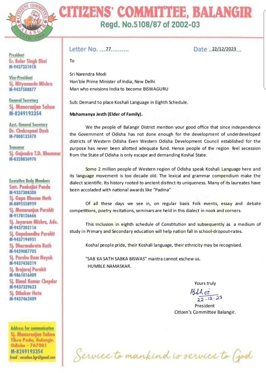 ବଲାଙ୍ଗୀର(ପ୍ରେରଣା ଖବର ): କୋଶଲୀ ଭାଷା ଏକ ସ୍ୱୟଂସଂପୂର୍ଣ୍ଣ ଭାଷା । କୋଶଳାଞ୍ଚଳର ପ୍ରାୟ ୧୧ଟି ଜିଲ୍ଲାରେ ଏହି ଭାଷା ପ୍ରଚଳିତ ଥିବା ବେଳେ ଦେଢ଼କୋଟି ଲୋକ ଏହି ଭାଷାକୁ ନିଜର ମାତୃଭାଷା ରୂପେ ବ୍ୟବହାର କରନ୍ତି । କୋଶଲୀ ଭାଷାରେ ଏ ପର୍ଯ୍ୟନ୍ତ ଅନେକ କାବ୍ୟ କବିତା ପ୍ରବନ୍ଧ, ଚଳଚ୍ଚିତ୍ର ଓ ଗଳ୍ପ ଆଦି ରଚନା ହୋଇ ସାରିଛି । ତେବେ ଲୋକଙ୍କ ଭାବାବେଗ ସହିତ ଜଡିତ କୋଶଲୀ ଭାଷାକୁ ଭାରତୀୟ ସମ୍ବିଧାନର ଅଷ୍ଟମ ଅନୁଚ୍ଛେଦରେ ସାମିଲ କରିବା ପାଇଁ ବଲାଙ୍ଗୀର ନାଗରିକ କମିଟି ପକ୍ଷରୁ ଭାରତର ମାନ୍ୟବର ପ୍ରଧାନମନ୍ତ୍ରୀ ନରେନ୍ଦ୍ର ମୋଦୀଙ୍କ ନିକଟରେ ଦାବି କରାଯାଇଛି । ଜାତୀୟ ଶିକ୍ଷା ନୀତି ଅନୁସାରେ ଛାତ୍ରଛାତ୍ରୀ ମାନଙ୍କୁ ପ୍ରାଥମିକ ସ୍ତର ପର୍ଯ୍ଯନ୍ତ ନିଜ ମାତୃଭାଷା /ସ୍ଥାନୀୟ ଭାଷାରେ ଶିକ୍ଷା ପ୍ରଦାନ କରିବା ପାଇଁ କୁହା ଯାଉଥିବା ବେଳେ ଭାଷା କ୍ଷେତ୍ରରେ ମଧ୍ଯ କୋଶଲୀ ଭାଷା ଚରମ ଅବହେଳାର ଶିକାର ହୋଇଛି ବୋଲି ନାଗରିକ କମିଟି କହିଛି l ନାଗରିକ କମିଟିର ସଭାପତି ଇଂ. ବେଲାରସିଂ ଭୋଇ ଓ ସଂପାଦକ ମନୋରଂଜନ ସାହୁ ଏକ ଚିଠି ମାଧ୍ୟମରେ ନିଜର ଦାବି ଉପସ୍ଥାପନ କରି ଓଡ଼ିଆ ଭାଷା ଠାରୁ ବି ପ୍ରାଚୀନ ତଥା ସମୃଦ୍ଧ କୋଶଲୀ ଭାଷାର ସାମ୍ବିଧାନିକ ମାନ୍ୟତା ସପକ୍ଷରେ ନିଜର ଯୁକ୍ତି ବାଢ଼ିଛନ୍ତି । କୋଶଲାଞ୍ଚଳକୁ ସବୁ କ୍ଷେତ୍ରରେ ଅବହେଳା କରଯାଇ ଥିବା ବେଳେ କୋଶଲୀ ଭାଷାର ମାନ୍ୟତା କ୍ଷେତ୍ରରେ ମଧ୍ଯ ଏହା ସରକାରଙ୍କ ହୀନମନ୍ୟତାର ଶିକାର ହୋଇଛି ବୋଲି ବଲାଙ୍ଗୀର ନାଗରିକ କମିଟି ଏହି ଚିଠି ରେ ଉଲ୍ଲେଖ କରିଛି l