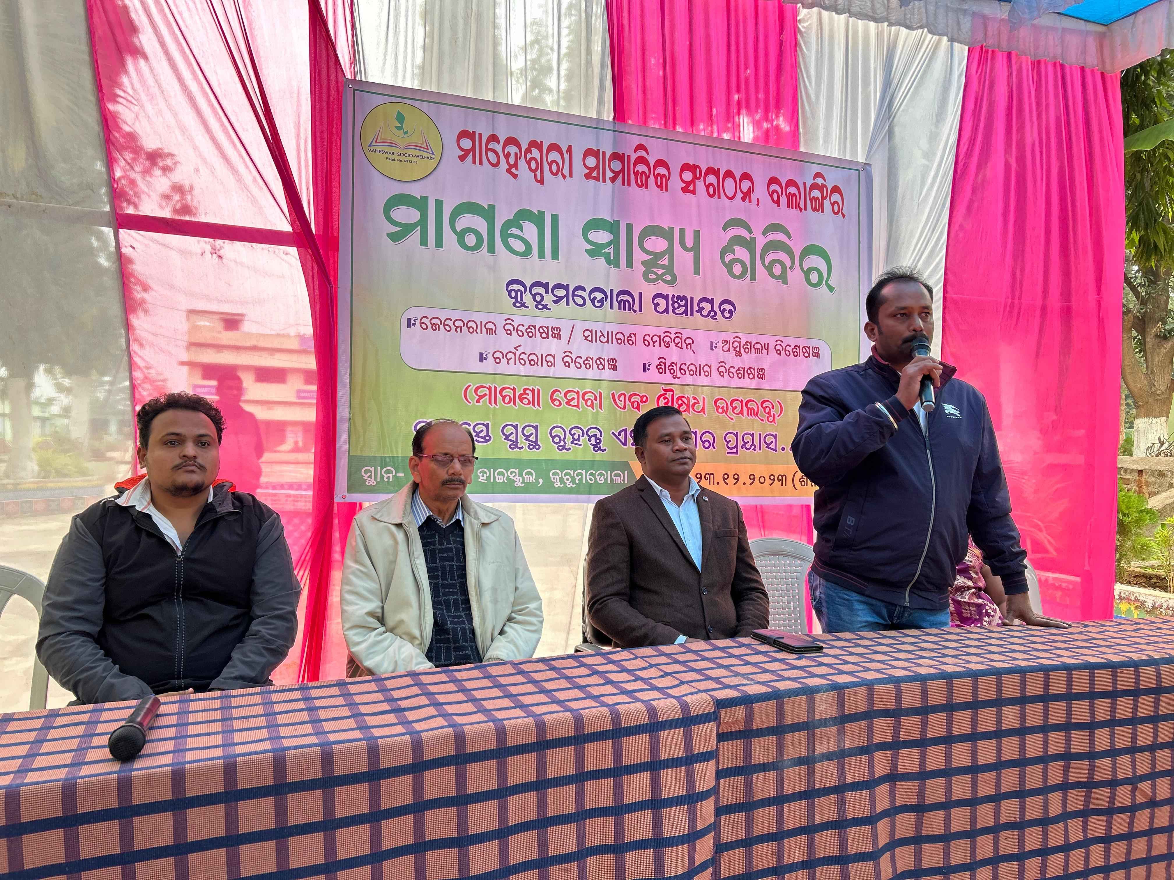 ବଲାଙ୍ଗିର (ପ୍ରେରଣା ଖବର): ପଶ୍ଚିମ ଓଡିଶାର ଜଣାଶୁଣା ଅଗ୍ରଣୀ ସ୍ବେଛାସେବୀ ସଂଗଠନ ମାହେଶ୍ୱରୀ ଦ୍ୱାରା କୁଟୁମଡୋଲା ହାଇସ୍କୁଲରେ ମାଗଣା ସ୍ୱାସ୍ଥ୍ୟ ଶିବିର ଏବଂ ଔଷଧ ବିତରଣ କାର୍ଯ୍ୟକ୍ରମ ଅନୁଷ୍ଠିତ ହୋଇଥିଲା l ଆଜିର ସ୍ୱାସ୍ଥ୍ୟ ଶିବିରକୁ ଯଗତପାଲ ସେଠ୍ (ବିତ୍ତ ଉପଦେଷ୍ଠା,ଲୋୟର ସୁକତେଲ) ମୁଖ୍ୟ ଅତିଥି ରୂପେ ଉତଘାଟନ କରିଥିଲେ । ମାହେଶ୍ୱରୀ ସଂଗଠନର ସଦସ୍ୟ ଦେବାଶିଷ ପାଣ୍ଡିଆ ସଭା ସଂଯୋଜନ କରିଥିଲେ ଏବଂ ସଂଗଠନର ପରିଚାଳନା ନିର୍ଦେଶକ ଅଙ୍କୁଶ କୁମାର ପାଣ୍ଡିଆ ମାହେଶ୍ୱରୀର କାର୍ଯ୍ୟକ୍ରମ ବିବରଣୀ ଦେଇଥିଲେ | ସଭାରେ ସରପଞ୍ଚ ସସ୍ମିତା ସିଂଦେଓ, ପୂର୍ବତନ ଶିକ୍ଷକ ବିଦୁଭୂଷଣ ସିଂହଦେଓ