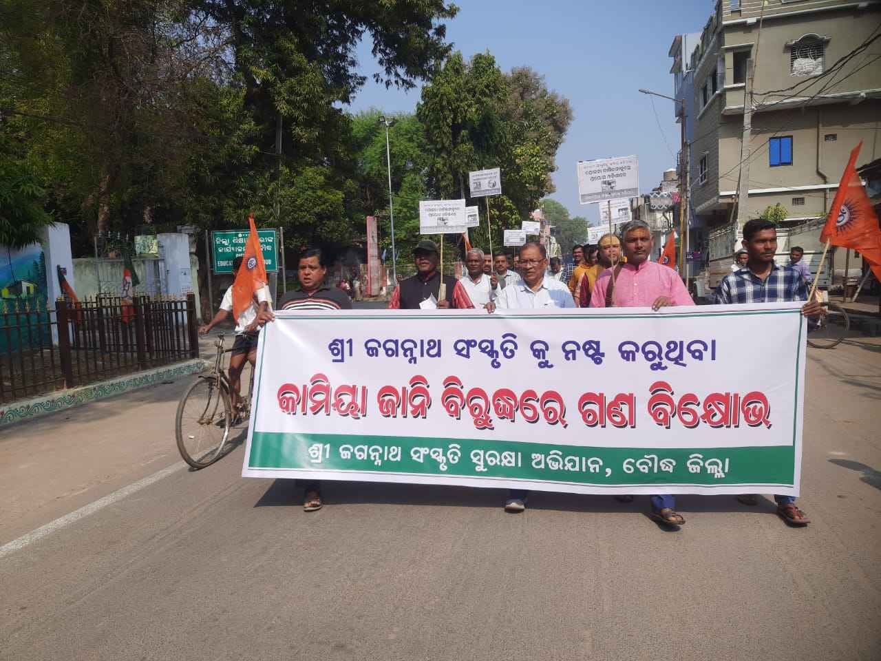 ବୌଦ୍ଧ(ଦୁର୍ଯ୍ଯୋଧନ ବିଶି): :ଶ୍ରୀକ୍ଷେତ୍ର ପୁରୀ ତଥା ଶ୍ରୀମନ୍ଦିର ସମଗ୍ର ହିନ୍ଦୁ ମାନଙ୍କ ପାଇଁ ଅତ୍ୟନ୍ତ ପବିତ୍ର ତଥା ପ୍ରମୁଖ ତୀର୍ଥସ୍ଥଳୀ । ଏହାର ପବିତ୍ରତା ତଥା ପରମ୍ପରାକୁ ନଷ୍ଟ କରୁଥିବା ବ୍ୟକ୍ତିଙ୍କ ବିରୋଧରେ ରାଜ୍ୟ ସରକାର ଦୃଢ କାର୍ଯ୍ୟାନୁଷ୍ଠାନ ଗ୍ରହଣ କରନ୍ତୁ ବୋଲି ଆଜି ଶ୍ରୀ ଜଗନ୍ନାଥ ସଂସ୍କୃତି ସୁରକ୍ଷା ଅଭିଯାନ ପକ୍ଷରୁ ଦାବି କରାଯାଇଛି । ଅଭିଯାନର ଜିଲ୍ଲା ସଂଯୋଜକ ରଘୁନାଥ ଷଡଙ୍ଗୀଙ୍କ ସଂଯୋଜନାରେ ଏହି ଦାବିକୁ ନେଇ ଏକ ବିକ୍ଷୋଭ ଶୋଭାଯାତ୍ରା ସ୍ଥାନିୟ ଜଗନ୍ନାଥ ମନ୍ଦିର ଠାରୁ ବାହାରି ମର୍ଯ୍ୟାକୁଦଛକ ନିକଟରେ ପହଞ୍ôଚଥିଲା । ସେଠାରେ ଆୟୋଜିତ ଏକ ସଭାରେ ବରିଷ୍ଠ ନାଗରୀକ ସୂର୍ଯ୍ୟକାନ୍ତ ଦଳବେହେରା, ସମାଜସେବୀ ଇନ୍ଦୁ ଭୁଷଣ ମହାକୁଳ, ଜିଲ୍ଲା ବ୍ରାହ୍ମଣ ସମାଜର ବରିଷ୍ଠ ସଦସ୍ୟ ଦେବବ୍ରତ ପାଣିଗ୍ରାହୀ, ଜିଲ୍ଲା ପଣ୍ଡିତ ସମାଜ ସଭାପତି ସଂଜିବ କୁମାର ପଣ୍ଡା, ବିଶ୍ୱ ହିନ୍ଦୁ