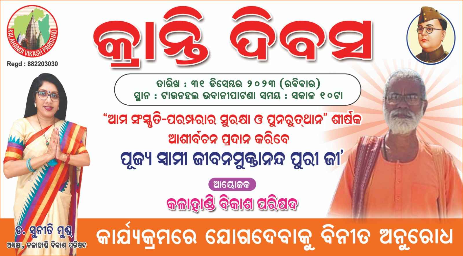 ନେତାଜୀ ସୁଭାଷ ଚନ୍ଦ୍ର ବୋଷଙ୍କର ଭାରତ ସ୍ୱାଧୀନତା ସଂଗ୍ରାମରେ କ୍ରାନ୍ତିକାରୀ ଭୂମିକାକୁ ସ୍ମରଣ କରିବା ନିମନ୍ତେ ଚଳିତ ମାସ ୩୧ ତାରିଖରେ କଳାହାଣ୍ଡି ବିକାଶ ପରିଷଦ ପକ୍ଷରୁ "କ୍ରାନ୍ତି ଦିବସ" ପାଳନ ସମାରୋହ ଆୟୋଜନ କରାଯାଉଛି। ଭବାନୀପାଟଣା ଟାଉନହଲ ଠାରେ ପୂର୍ବାହ୍ନ ୧୦ଟାରୁ ଏହି କାର୍ଯ୍ୟକ୍ରମ ଆରମ୍ଭ ହେବ। ଏଥିରେ ପୂଜ୍ୟ ସ୍ୱାମୀ ଜୀବନମୁକ୍ତାନନ୍ଦ ପୁରୀ ଜୀ ମୁଖ୍ୟ ଅତିଥି ଭାବରେ ଯୋଗ ଦେବେ। ଏହି ଅବସରରେ ନେତୃବୃନ୍ଦ ତଥା ଯୁବ ନେତୃତ୍ୱଙ୍କୁ ସମ୍ମାନିତ କରାଯିବ। ତତ୍ପରେ କ୍ରାନ୍ତି ପତାକା ଉତ୍ତୋଳନ ଓ ଶୋଭାଯାତ୍ରା ଅନୁଷ୍ଠିତ ହେବ। ଏଥିରେ କଳାହାଣ୍ଡି ଓ ସଂସ୍କୃତି ଐତିହ୍ୟପ୍ରେମୀ ଜନସାଧାରଣ ବହୁ ସଂଖ୍ୟାରେ ଯୋଗଗଦେବାକୁ କଳାହାଣ୍ଡି ବିକାଶ ପରିଷଦ ଅଧ୍ୟକ୍ଷା ଡ଼ ସୁନୀତି ମୁଣ୍ଡ ନିବେଦନ କରିଛନ୍ତି।