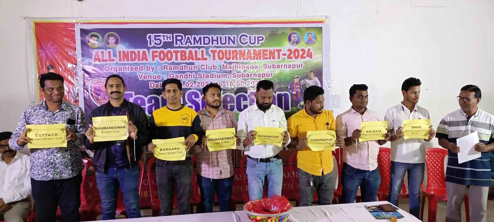 ସୋନପୁର ରାମଧୂନ୍ କ୍ଲବ୍ ଦ୍ବାରା ଆୟୋଜିତ ହେବାକୁ ଥିବା ୧୫ ତମ ଅଲ୍ ଇଣ୍ଡିଆ ଫୁଟବଲ୍ ଟୁର୍ଣlମେଣ୍ଟ ପାଇଁ ଆଜି ଜିଲ୍ଲା କ୍ରୀଡା ସଂଘ ଅଫିସ୍ ଗାନ୍ଧୀ ଷ୍ଟାଡିୟମ ଠାରେ ଫ୍ରାଞ୍ଚାଇଜ୍ (ପ୍ରlଯୋଜକ) ମାନଙ୍କୁ ଲଟେରୀ ମାଧ୍ୟମ ରେ ଟିମ ଡିଷ୍ଟ୍ରିବୁସନ୍ କରାଯାଇଥିଲl l ସଭା ଓ ଲଟେରୀ କାର୍ଯ୍ୟକ୍ରମ କୁ ରାମଧୁନ କ୍ଲବ୍ ର ଉପଦେଷ୍ଟl ତଥା କ୍ରୀଡାସଂଘ ଉପ- ସଭାପତି ଚିତ୍ତ ରଞ୍ଜନ ତରାସିଆ ପରିଚାଳନା କରିଥିବା ବେଳେ କ୍ଲବ୍ ର ସମ୍ପାଦକ ପୀୟୂଷ ପଣ୍ଡା ପ୍ରଯୋଜକ ଙ୍କ ପରିଚୟ ପ୍ରଦାନ୍ କରି ସ୍ଵାଗତ କରିଥିଲେ l ଲଟେରୀ ମାଧ୍ୟମ ରେ ସୋନପୁର ର ଅର୍ଜ୍ଜୁନ ରିଶୋର୍ଟ ସଂସ୍ଥା ର ପ୍ରୋପାଇଟର ଗୌତମ ସାହୁ କିଶୋର କ୍ଲବ୍ ଭୁବନେଶ୍ୱର କୁ ଚୟନ କରିଥିବା ବେଳେ ସଂସ୍କାର ଏଗ୍ରୋ ସଂସ୍ଥା ପ୍ରୋପାଇଟର ଲୋକନାଥ ରଥ ବରଗଡ ୟୁନାଇଟେଡ ସ୍ପୋର୍ସ କ୍ଲବ୍ କୁ ଚୟନ କରିଛନ୍ତି l ସୋନପୁର ନାଇସେଟ ସଂସ୍ଥା ପ୍ରୋପାଇଟର ରମଣ ପ୍ରଧାନ ଭୁବନେଶ୍ୱର ଜଗା ୟୁନାଇଟେଡ଼ କୁ ଚୟନ କରିଥିବା ବେଳେ ମା ବଗଳl ଜ୍ୱେଲର ପ୍ରୋପାଇଟର ରୂପେଶ ଅଗ୍ରୱାଲା କଲିକତା ବେଲଘରିଆ ଏଥଲେଟିକ କ୍ଲବ୍ କୁ ଚୟନ କରିଛନ୍ତି l ସୋନପୁର ଯତୀନ ଫାଇଟର୍ସ ପ୍ରୋପାଇଟର ହରିହର ପଟ୍ଟନାୟକ ରିଭର୍ସ କ୍ଳବ୍ କଟକ କୁ ଚୟନ କରିଥିବା ବେଳେ ମହାନଦୀ ଧାରା ଶିକ୍ଷାନୁଷ୍ଠାନ ର ପ୍ରୋପାଇଟର ପ୍ଲାବନ ମହାପାତ୍ର ପି ୱା ସି ସୁନାବେଡ଼ା ଦଳ କୁ ଚୟନ କରିଥିଲେ l ହୋତା ମୋଟର୍ସ ପ୍ରୋପାଇଟର ଯୋଗେନ୍ଦ୍ର ହୋତା ବିହାର ର ମା କାମାକ୍ଷା କ୍ଳବ୍ ବକ୍ସର୍ସ କ୍ଳବ୍ କୁ ଚୟନ କରିଥିବା ବେଳେ ସୋନପୁର ର ଆଲ୍ଫା ଏଜୁକେଶନ ସଂସ୍ଥା ସୋନପୁର ରାମଧୂନ୍ କ୍ଳବ୍ କୁ ଚୟନ କରି ଏହି ଟୁର୍ଣ୍ଣlମେଣ୍ଟ ର ପ୍ରୟାସ କୁ ପ୍ରଶଂସା କରିଥିଲେ ଓ ଏହା କୁ ସଫଳ କରିବାକୁ ସମସ୍ତ ସହଯୋଗ କରିବାକୁ ପ୍ରତିଶୁତି ଦେଇ ଥିଲେ l
