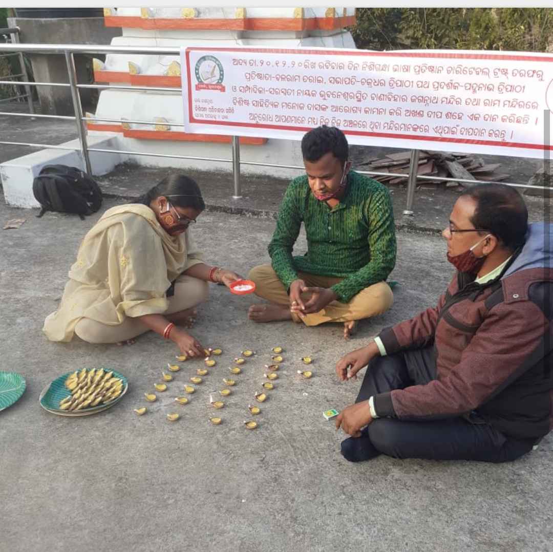 କଟକ, (ଦୀପକ କୁମାର ଷଡଙ୍ଗୀ) -"ନିଶିଗନ୍ଧା" ଭାଷା ପ୍ରତିଷ୍ଠାନ ଏବଂ ଚାରିଟେବୁଲ୍ ଟ୍ରଷ୍ଟ ଆନୁକୁଲ୍ୟରେ ଆଜି ଏକ ଦୀପଦାନ ଓ ପ୍ରାର୍ଥନା ସଭା ଅନୁଷ୍ଠିତ ହୋଇଯାଇଛି l ଅନୁଷ୍ଠାନର ମୁଖ୍ୟ ଉପଦେଷ୍ଟା ତଥା ପୁରୋଧା ପଦ୍ମଶ୍ରୀ ରମାକାନ୍ତ ରଥ ,ଉପଦେଷ୍ଟା ବିଶିଷ୍ଟ ଔପନ୍ୟାସିକ ଡଃ ବିଭୁତି ପଟ୍ଟନାୟକଙ୍କ ତତ୍ୱାବଧାନରେ ଅନୁଷ୍ଠାନର ମାର୍ଗଦର୍ଶକ ବିଶିଷ୍ଟ କବି ଡକ୍ଟର ପ୍ରସନ୍ନ କୁମାର ପାଟ୍ଟଶାଣୀ,ଉପଦେଷ୍ଟା ପ୍ରସନ୍ନ କୁମାର ନାୟକ,ନିଶିଗନ୍ଧାର ପ୍ରତିଷ୍ଠାତା ସୁନାମଧନ୍ୟ ସାହିତ୍ୟ ସଂଗଠକ ବଳରାମ ତରାଇ , ସଭାପତି ଚକ୍ରଧର ତ୍ରିପାଠୀ , ପଥ ପ୍ରଦର୍ଶକ ସାହିତ୍ୟିକ ପଦ୍ମନାଭ ତ୍ରିପାଠୀ, ସମ୍ପାଦିକା ସରସ୍ବତୀ ନାୟକ ଓ କରୁଣାକର ମଲ୍ଲିକ ପ୍ରମୁଖ ଭୁବନେଶ୍ୱର ସ୍ଥିତ ଶ୍ରୀ ଜଗନ୍ନାଥ ମନ୍ଦିର ଏବ° ଶ୍ରୀ ରାମ ମନ୍ଦିରରେ ଶହେ ଏକ(୧0୧) ଦୀପ ପ୍ରଜ୍ବଳନ କରି ବିଶ୍ୱର ଖ୍ୟାତି ସମ୍ପନ୍ନ ସାହିତ୍ୟିକ ବରେଣ୍ୟ ମନୋଜ ଦାସଙ୍କ ଆଶୁ ଆରୋଗ୍ୟ ପାଇଁ ପ୍ରାର୍ଥନା କରିଥିଲେ l