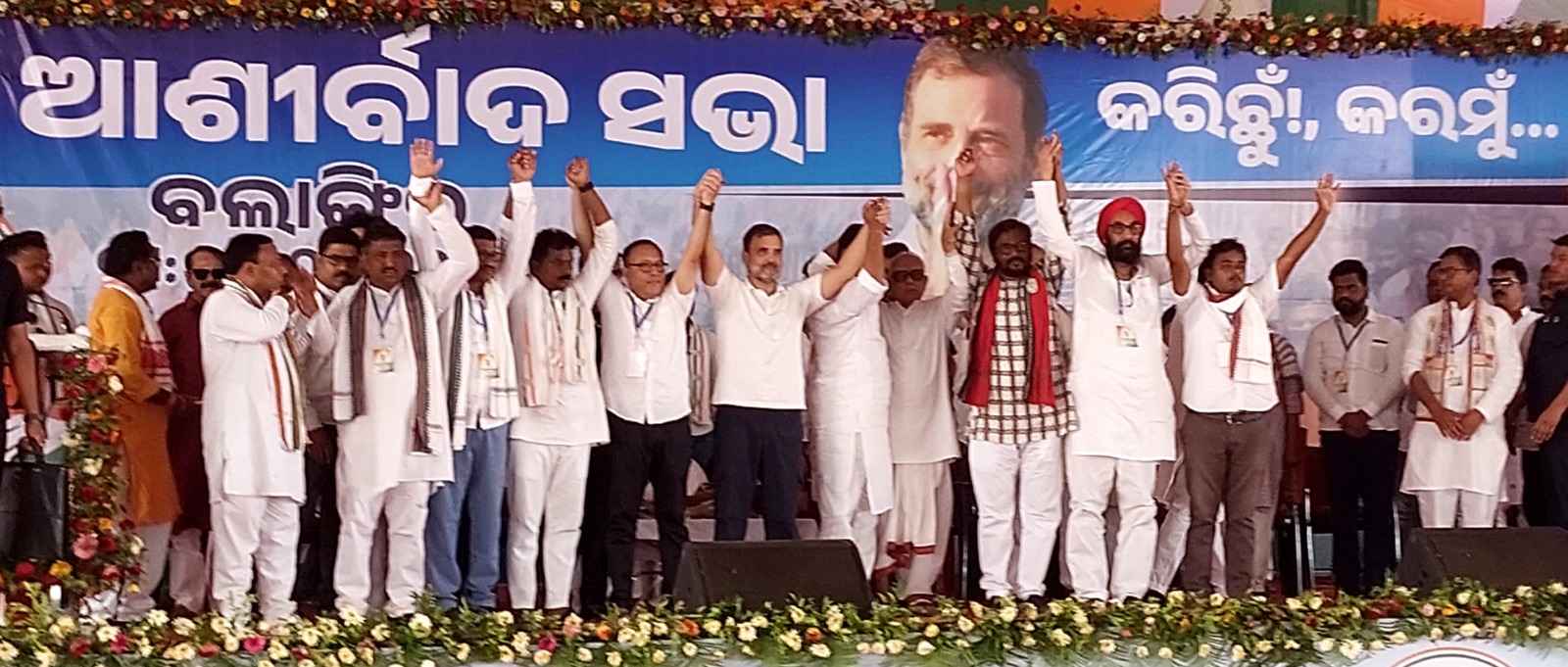 କରିବେ,କୃଷିଋଣ ଓ ଏସଏଚଜି ଋଣଛାଡ କରାଯିବ,ଚାଷିଙ୍କ ଉତ୍ପାଦିତ ଧାନର ଉଚିତ ସହାୟକମୁଲ୍ୟ ପ୍ରଦାନ କରିବେ, ମନରେଗା ଶ୍ରମିକଙ୍କ ମଜୁରି ଦୈନିକ ୪୦୦ଟଙ୍କାକୁ ବୃଦ୍ଧି, ଖାଲିଥିବା ୨୦ଲକ୍ଷ ଚାକିରି ଦେବା ତଥା ବେରୋଜଗାର ଯୁବକମାନଙ୍କୁ ମାସିକ ୮୫୦୦ ଟଙ୍କା ଲେଖାଏଁ ଦେବାକୁ ରାହୁଲ ଘୋଷଣା କରିଥିଲେ । ଆଜି ରାହୁଲ ପ୍ରାୟ ଦିନ ୧୨ଟାରେ ମନୋହରପୁର ହେଲିପେଡରେ ଓହ୍ଲାଇଥିଲେ । ସେଠାରେ ପ୍ରଦେଶ କଂଗ୍ରେସ ସଭାପତି ଶରତ ପଟ୍ଟନାୟକ,ବଲାଙ୍ଗୀର କଂଗ୍ରେସପ୍ରାର୍ଥି ସମରେନ୍ଦ୍ର ମିଶ୍ର,କଂଗ୍ରେସର ବରିଷ୍ଠନେତା ଭକ୍ତଚରଣ ଦାସ, ବଲାଙ୍ଗୀର ଜିଲ୍ଲା କଂଗ୍ରେସ କାର୍ଯ୍ୟକାରୀ ସଭାପତି ମନିଷ ମିଶ୍ର, ସେବାଦଳମୁଖ୍ୟ ଅସୀତ ମିଶ୍ର, ଉମାଶଙ୍କର ପଣ୍ଡା ରାହୁଲଙ୍କୁ ଫୁଲତୋଡା ଦେଇ ସ୍ୱାଗତ କରିଥିଲେ । ସେଠାରୁ କଂଗ୍ରେସ କର୍ମିମାନେ ଏକ ବିଶାଳ ମୋଟରସାଇକେଲ ରାଲିରେ ମନୋହରପୁର ଛକରୁ କୋସଳକଳାମଣ୍ଡଳ ପଡିଆ ପର୍ଯ୍ୟନ୍ତ ରାହୁଲଙ୍କୁ ଆଣିଥିଲେ । କୋସଲକଳାମଣ୍ଡଳ ପଡିଆଠାରେ ଆୟୋଜିତ ଜନଆଶୀର୍ବାଦ ନିର୍ବାଚନୀ ସଭାରେ ରାହୁଲ ଗାନ୍ଧୀଙ୍କ ସହିତ କଂଗ୍ରେସ ବିଧାୟକ ଦଳର ନେତା ନରସିଂହ ମିଶ୍ର, ରାଜ୍ୟକଂଗ୍ରେସ ପ୍ରଭାରୀ ଅଜୟ କୁମାର, ପିସିସି ସଭାପତି ଶରତ ପଟ୍ଟନାୟକ, କୋରାପୁଟ ସାଂସଦ ସପ୍ତଗିରୀ ଉଲାକା,ବିଧାୟକ ତାରାପ୍ରସାଦ ବାହିନୀ ପତି, କଣ୍ଟାବାଞ୍ଜି ବିଧାୟକ ସନ୍ତୋଷ ସିଂସାଲୁଜା, ବଲାଙ୍ଗୀର ବିଧାୟକ ପ୍ରାର୍ଥି ସମରେନ୍ଦ୍ର ମିଶ୍ର,ପାଟଣାଗଡ ବିଧାୟକ ପ୍ରାର୍ଥି ଅନିଳ ମେହେର,ଟିଟିଲାଗଡ ବିଧାୟକ ପ୍ରାର୍ଥି ବୀରେନ୍ଦ୍ର ବାଗ, ଲୋଇସିଂହା ବିଧାୟକ ପ୍ରାର୍ଥି ଓମପ୍ରକାଶ କୁମ୍ଭାର, ସୋନପୁର ବିଧାୟକ ପ୍ରାର୍ଥି ପ୍ରୀୟବ୍ରତ ସାହୁ, ବୀରମହାରାଜପୁର ବିଧାୟକ ପ୍ରାର୍ଥି ପ୍ରଦୀପ ସେଠୀ ପ୍ରମୁଖ ମଞ୍ଚାସୀନ ଥିଲେ । ବଲାଙ୍ଗୀର କଂଗ୍ରେସ ସାଂସଦ ପ୍ରାର୍ଥି ମନୋଜ ମିଶ୍ର କାର୍ଯ୍ୟକ୍ରମକୁ ପରିଚାଳନା କରିଥିବା ବେଳେ ବଲାଙ୍ଗୀର ଜିଲ୍ଲା ସଭାପତି ଅଶୋକ ନନ୍ଦ ଶେଷରେ ଧନ୍ୟବାଦ ଅର୍ପଣ କରିଥିଲେ । ଏହି କାର୍ଯ୍ୟକ୍ରମରେ ହଜାର ହଜାର କଂଗ୍ରେସ କାର୍ଯ୍ୟକର୍ତ୍ତା ଯୋଗ ଦେଇଥିଲେ ।