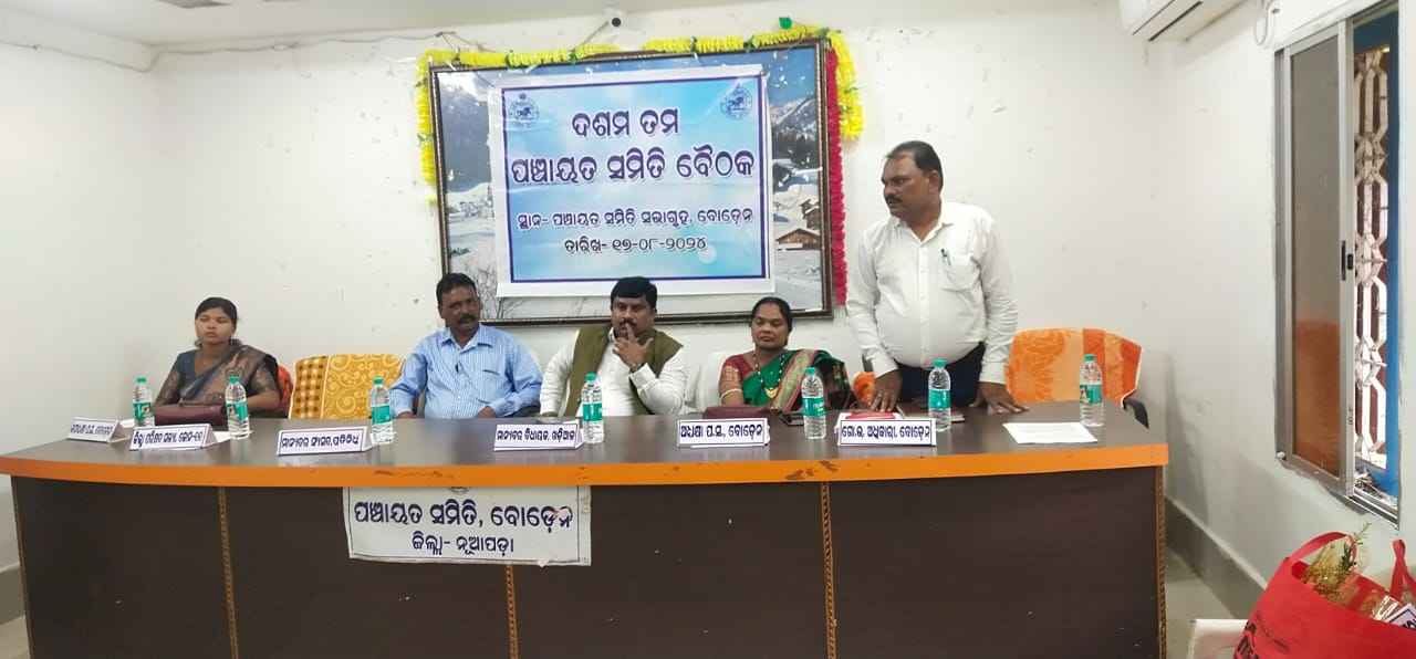 ନୂଆପଡା ଜିଲ୍ଲା ବୋଡେନ ବ୍ଳକ ସଭାଗୃହ ଠାରେ ଆଜି ଦଶମ ତମ ପଞ୍ଚାୟତ ସମିତି ବୈଠକ ଅନୁଷ୍ଠିତ ହୋଇଯାଇଛି । ପଞ୍ଚାୟତ ସମିତି ଅଧ୍ୟକ୍ଷା ପ୍ରେମ ଶିଳା ନାଗଙ୍କ ଅଧ୍ୟକ୍ଷତାରେ ଆୟୋଜିତ ବୈଠକରେ ଖଡିଆଳ ବିଧାୟକ ଅଧିରାଜ ମୋହନ ପାଣିଗ୍ରାହୀ, ଗୋଷ୍ଠି ଉନ୍ନୟନ ଅଧିକାରୀ ପ୍ରିୟ ରଞ୍ଜନ କୁମାର, ଉପାଧ୍ୟାକ୍ଷା ସଙ୍ଗିତା ମାଝୀ, ସାସଂଦ ପ୍ରତିନିଧି ବିଜୟ ବେହେରା, ପ୍ରମୁଖ ଉପସ୍ଥିତ ଥିଲେ । ବୈଠକରେ ୧୫ଟି ପଞ୍ଚାୟତର ସରପଞ୍ଚ ଓ ସମିତି ସଭ୍ୟ ସଭ୍ଯା ଉପସ୍ଥିତ ରହି ନିଜ ନିଜ ଅଞ୍ଚଳର ବିଭିନ୍ନ ସମସ୍ୟା ଉପରେ ଆଲୋଚନା କରିଥିଲେ ।ବିଶେଷ କରି ପାନୀୟ ଜଳ, ଶିକ୍ଷା,ବିଜୁଳି, ସମ୍ମାନ୍ବିତ ଶିଶୁ ବିକାଶ, ଉଦ୍ୟାନ ବିଭାଗ, ମନରେଗା, ଯୋଗାଣ ବିଭାଗ , ପ୍ରାଣି ସମ୍ପଦ, ସ୍ବାସ୍ଥ୍ଯ ବିଭାଗ, ପ୍ରାଣୀ ସମ୍ପଦ ବିଷୟରେ ଆଲୋଚନା ହୋଇଥିଲା । ଗ୍ରାମ ମାନଙ୍କରେ ଥିବା ସମସ୍ୟା ଉପରେ କିପରି ଶୀଘ୍ର ସମାଧାନ କରାଯିବ ଏନେଇ ଉପସ୍ଥିତ ଥିବା ସମସ୍ତ ବିଭାଗର କର୍ମଚାରୀ ମାନଙ୍କୁ ନିର୍ଦ୍ଦଶ ଦେଇଥିଲେ । ଗ୍ରାମ ପଞ୍ଚାୟତ ଅଧିକାରୀ ପ୍ରଫୁଲ୍ଲ ନାଏକ ,ଏପିଓ ରବିନାରାୟଣ ରାଉତ, କନିଷ୍ଠ ଯନ୍ତ୍ରୀ ଯୁଗେଶ୍ଵର ନାଏକ ସ୍ୱାସ୍ଥ୍ୟ ବିଭାଗ ପକ୍ଷ ରୁ ସଂଜୀବ କୁମାର ନାୟକ ଙ୍କ ସମେତ ସମସ୍ତ ବିଭାଗର ବିଭାଗୀୟ ଅଧିକାରୀ ଉପସ୍ଥିତ ଥିଲେ ।