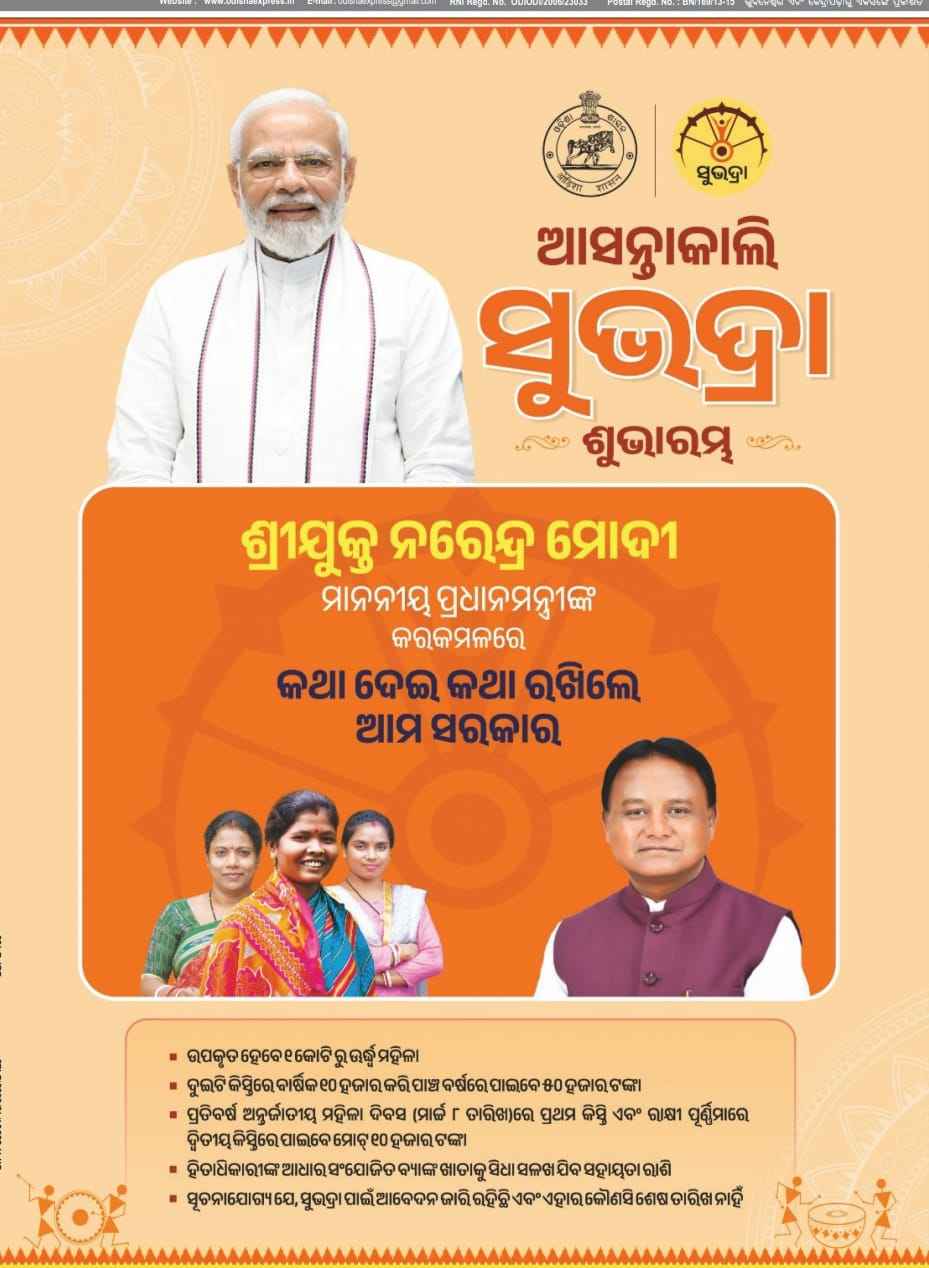ଫୁଲବାଣୀ ( ଶ୍ରୀ କ୍ଷୀରୋଦ କୁମାର ସାହାଣୀ) ରାଜ୍ୟରେ ଗତ ସାଧାରଣ ନିର୍ବାଚନ ସମୟରେ ଭାରତୀୟ ଜନତା ପାର୍ଟି ନିର୍ବାଚନ ପ୍ରତିଶୃତି ଅନୁଯାଇ ପ୍ରଥମ କରି ମହିଳା ମାନଙ୍କ ବିକାଶ ତଥା ମହିଳା ଭୋଟ ବ୍ୟାଙ୍କ କୁ ହାତ ମୁଠାରେ ରଖିବା ପାଇଁ ସୁଭଦ୍ରା ଯୋଜନା ମଧ୍ୟରେ ପାଞ୍ଚ ବର୍ଷରେ 50 ହଜାର ଟଙ୍କା ଦେବାପାଇଁ ନିଷ୍ପତ୍ତି ନେଇଛନ୍ତି | ବର୍ଷକୁ ଦୁଇଟି କିସ୍ତିରେ ମହିଳା ମାନଙ୍କ ଜମା ଖାତାକୁ ସୁଭଦ୍ରା ଯୋଜନା ଟଙ୍କା ଜୀବ ବୋଲି ମାନ୍ୟବର ଉପମୁଖ୍ୟମନ୍ତ୍ରୀ ଶ୍ରୀମତୀ ପ୍ରତିଭା ପରିଡା ଘୋଷଣା କରିଛନ୍ତି | ଏବଂ ଆସନ୍ତାକାଲି ମାନ୍ୟବର ପ୍ରଧାନମନ୍ତ୍ରୀ ଶ୍ରୀ ନରେନ୍ଦ୍ର ଦାମୋଦର ଦାସ ମୋଦି ଜିଙ୍କ ଜନ୍ମଦିନ ରେ ଭୁବନେଶ୍ୱର ରେ ସୁଭଦ୍ରା ଯୋଜନା ର ଶୁଭାରମ୍ଭ କରିବେ ସ୍ୱୟଂ ନିଜେ ପ୍ରଧାନମନ୍ତ୍ରୀ ମୋଦିଜୀ, ସେଇଥିପାଇଁ ରାଜ୍ୟସରକାର ଙ୍କ ତରଫରୁ ସମସ୍ତ ପ୍ରକାର କାର୍ଯ୍ୟକ୍ରମ ପ୍ରସ୍ତୁତ କରାଯାଇ ସାରିଥିବା ଜଣାପଡିଛି | ଓଡିଶା ବାସୀଙ୍କୁ ପ୍ରଧାନମନ୍ତ୍ରୀ ଙ୍କ ଜନ୍ମଦିନ ରେ ରାଜ୍ୟରେ ମୋହନ ସରକାର ଙ୍କର ପ୍ରଥମ ଭେଟି ଭାବେ ସୁଭଦ୍ରା ଯୋଜନା ଅର୍ଥ 5000 ଟଙ୍କା ଲେଖାଏଁ ପ୍ରଦାନ କରାଯିବ ବୋଲି ସରକାର ସମସ୍ତ ପ୍ରସ୍ତୁତି ଶେଷ କରିଛି |