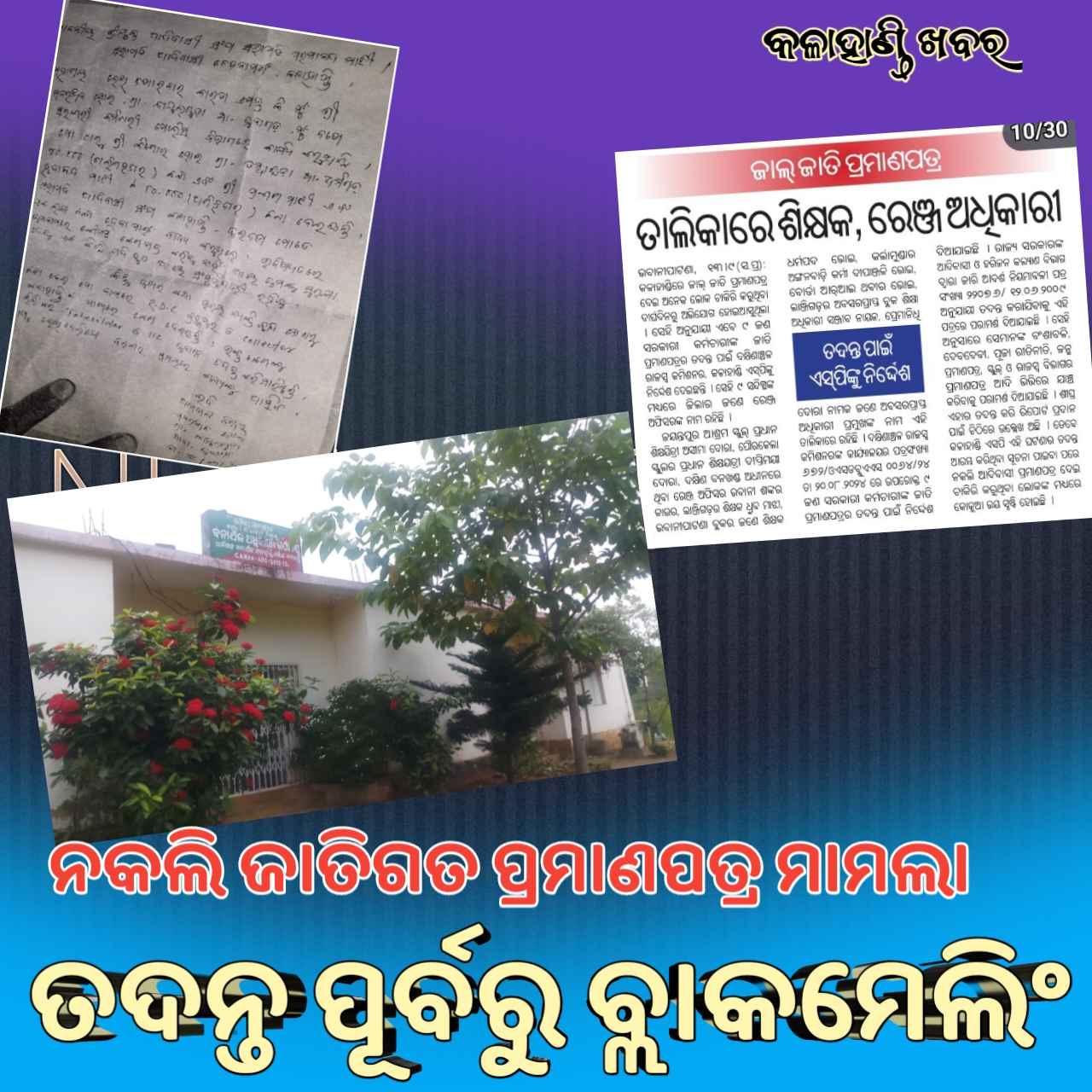 ଉଲ୍ଲେଖନୀୟ ଯେ , ଦକ୍ଷିଣାଞ୍ଚଳ ରାଜସ୍ୱ କମିଶନରଙ୍କ ନିକଟରେ ଜିଲ୍ଲାର ଏଭଳି ନକଲି ଜାତିଗତ ପ୍ରମାଣ ପତ୍ର ବଳରେ ସରକାରୀ ଚାକିରୀ କରୁଥିବା ଅଭିଯୋଗ ହୋଇଥିଲା । ସେଇ ଅଭିଯୋଗ କ୍ରମେ ଜିଲ୍ଲାର ୯ ଜଣ ଶିକ୍ଷକ/ଶିକ୍ଷୟିତ୍ରୀ, ଅଙ୍ଗନବାଡି କର୍ମୀ, ଅବସରପ୍ରାପ୍ତ ବ୍ଲକ୍ ଶିକ୍ଷା ଅଧିକାରୀ ଓ ଜଣେ ବନ ବିଭାଗର ରେଞ୍ଜ ଅଧିକାରୀଙ୍କ ନାମରେ ଉକ୍ତ ଚିଠି ନମ୍ବର ଆଦି ଉଲ୍ଲେଖ କରାଯାଇ କଳାହାଣ୍ଡି ଏସ୍ ପି ଙ୍କ ପକ୍ଷରୁ ମଧ୍ୟ ତଦନ୍ତ କରାଯାଉଥିବା ପ୍ରକାଶ ପାଇଛି । ଏହାପରେ ଆମ ଟିମ୍ ପକ୍ଷରୁ ଏମାନଙ୍କ ମଧ୍ୟରୁ କେତେକଙ୍କୁ ଭେଟି ଏ ସମ୍ପର୍କରେ ପଚରାଯିବାରୁ ସେମାନେ ଏହା ପଛରେ କେତେକ ସ୍ବାର୍ଥନିଷ୍ଠ ବ୍ୟକ୍ତିବିଶେଷଙ୍କର ଟଙ୍କା ଦାବି କରି ବ୍ଲାକ୍ ମେଲିଂ କରୁଥିବା ଅଭିଯୋଗ ଆମର ହସ୍ତଗତ ହୋଇଛି ।