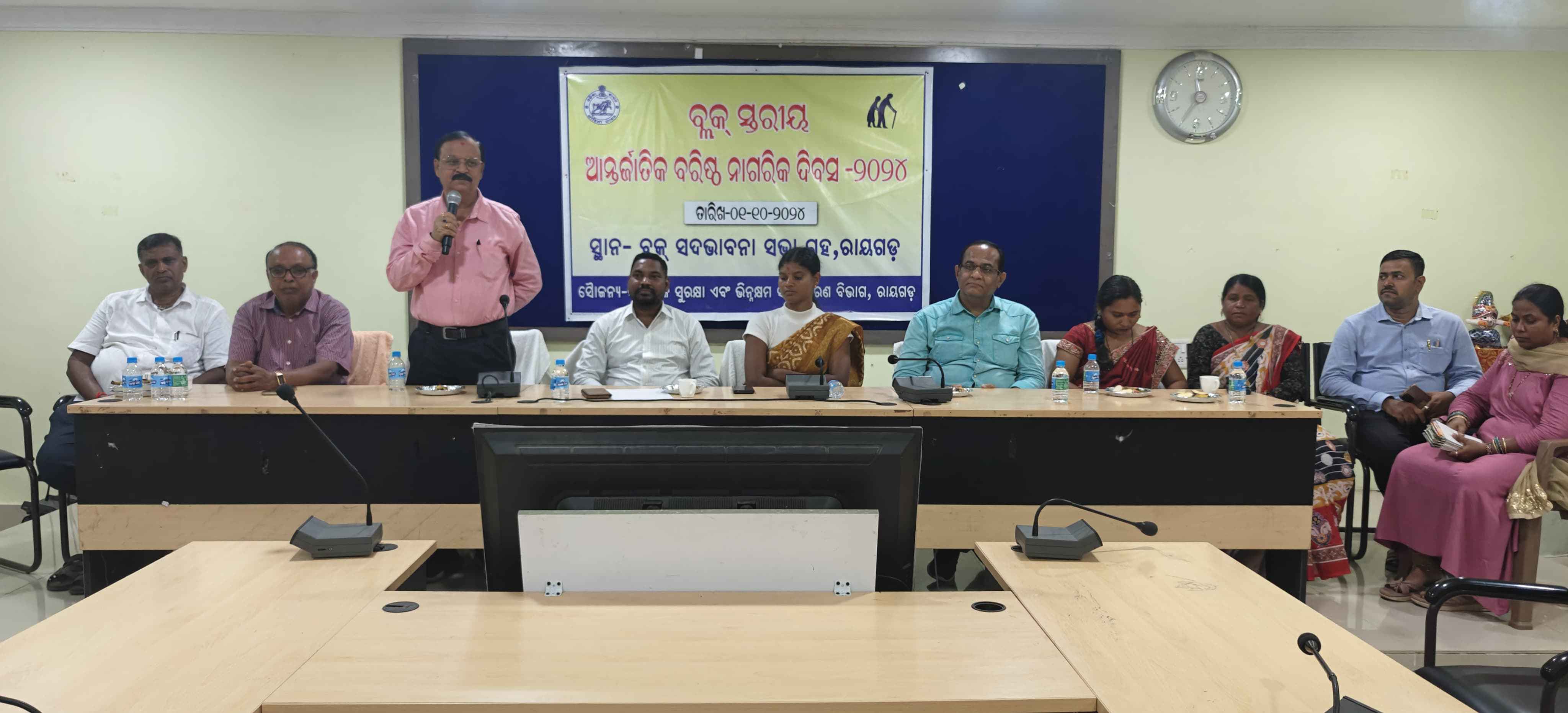 ରାୟଗଡା(ସୁନୀତା ଷଡଙ୍ଗୀ): ସାମାଜିକ ସୁରକ୍ଷା ଓ ଭିନ୍ନକ୍ଷମ ସଶକ୍ତିକରଣ ବିଭାଗ ତରଫରୁ ବ୍ଲକସ୍ତରୀୟ ଆନ୍ତର୍ଜାତୀୟ ବରିଷ୍ଠ ନାଗରିକ ଦିବସ, ରାୟଗଡ଼ ବ୍ଲକ ସଦଭାବନା ସଭା ଗୃହରେ ଅନୁଷ୍ଠିତ ହୋଇଅଛି । ଉକ୍ତ ଦିବସରେ ପୂର୍ବାହ୍ନ ୮ ଘଟିକା ସମୟରେ ବରିଷ୍ଠ ନାଗରିକମାନଙ୍କ ନିମନ୍ତେ ଯୋଗାଭ୍ୟାସ କରାଯିବା ସହ ସେମାନଙ୍କୁ ଡା. ସୁନୀଲ ମହାପାତ୍ରଙ୍କ ଦ୍ଵାରା ମାଗଣା ସ୍ୱାସ୍ଥ୍ୟ ପରୀକ୍ଷା କରାଯାଇଥିଲା । ଏହା ପରେ ୧୦ ଘଟିକା ସମୟରେ ଏକ ସାଧାରଣ ସଭାର ଆୟୋଜନ ହୋଇଥିଲା । ଏଥିରେ ମୁଖ୍ୟ ଅତିଥି ରୂପେ ଅବସରପ୍ରାପ୍ତ ପ୍ରାଧ୍ୟାପକ ଡା. ଡି. କେ ମହାନ୍ତି, ଏବଂ ସମ୍ମାନିତ ଅତିଥି ରୂପେ ଅବସରପ୍ରାପ୍ତ ଜିଲ୍ଲା ମଙ୍ଗଳ ଅଧିକାରୀ ଗଣେଶ୍ଵର ଭାରିମଲ, ଅବସରପ୍ରାପ୍ତ ଜିଲ୍ଲା ସାମାଜିକ ସୁରକ୍ଷା ଅଧିକାରୀ ସିମାଞ୍ଚଳ ମହାପାତ୍ର, ଅବସରପ୍ରାପ୍ତ ଉପଖଣ୍ଡ ସାମାଜିକ ସୁରକ୍ଷା ଅଧିକାରୀ ସି. ବି. ଏନ. ମୂର୍ତ୍ତି, ଡା. ଲକ୍ଷ୍ମୀ ନାରାୟଣ ସାହୁ, ଅମୂଲ୍ୟ କୁମାର ସାହୁ, ଗୋଷ୍ଠୀ ଉନ୍ନୟନ ଅଧିକାରୀ, ରାୟଗଡ଼ କାଳୁ ଚରଣ ନାୟକ, ଅତିରିକ୍ତ ଗୋଷ୍ଠୀ ଉନ୍ନୟନ ଅଧିକାରୀ, ରାୟଗଡ଼, ଜିଲ୍ଲା ପରିଷଦ ସଭ୍ୟା ଜୋନ ଶ୍ରୀମତୀ ସନ୍ଧ୍ୟା ପୁଲାକା, ଜିଲ୍ଲା ପରିଷଦ ସଭ୍ୟା ଜୋନ-ଖ, ଶ୍ରୀମତୀ. ପଦ୍ମାବତୀ ମାଣ୍ଡାଙ୍ଗି, ଅଧ୍ୟକ୍ଷ।, ପଞ୍ଚାୟତ ସମିତି, ରାୟଗଡ଼, ସୁଶ୍ରୀ ଟୁନି ହୁଇକା, ଭାରପ୍ରାପ୍ତ ଜିଲ୍ଲା ସାମାଜିକ ସୁରକ୍ଷା ଅଧିକାରୀ, ଶ୍ରୀକାନ୍ତ କୁମାର ପାଣିଗ୍ରାହୀ ସଭାରେ ଉପସ୍ଥିତ ଥିଲେ । କାଳୁ ଚରଣ ନାୟକ, ଅତିରିକ୍ତ ଗୋଷ୍ଠୀ ଉନ୍ନୟନ ଅଧିକାରୀ,