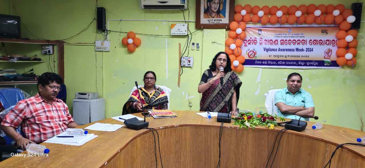 କେନ୍ଦ୍ରୀୟ ଦୁର୍ନୀତି ନିବାରଣ ଆୟୋଗ ତରଫରୁ ସମଗ୍ର ଦେଶରେ ୨୮ଅକ୍ଟୋବର ରୁ ୩ ନଭେମ୍ବର ପର୍ୟ୍ୟନ୍ତ ଦୁର୍ନୀତି ନିବାରଣ ସଚେତନତା ସପ୍ତାହ ପାଳନ କରାଯାଉଛି l ଏହି ପରିପ୍ରେକ୍ଷୀରେ ଆଜି ଜିଲ୍ଲା ସ୍ତରୀୟ ଦୁର୍ନୀତି ନିବାରଣ ସଚେତନତା ଓ ପୁରସ୍କାର ବିତରଣ ସଭା ସୁବର୍ଣ୍ଣପୁର ଜିଲ୍ଲାପରିଷଦ ସମ୍ମିଳନୀ କକ୍ଷରେ ଅନୁଷ୍ଠିତ ହୋଇଯାଇଛି I ଉପ ଆରକ୍ଷୀ ଅଧିକ୍ଷକ ଦୁର୍ନୀତି ନିବାରଣ ବିଭାଗ ଶ୍ରୀମତୀ ରିତାଞ୍ଜଳୀ ପ୍ରଧାନ ଙ୍କ ସଭାପତିତ୍ୱରେ ଅନୁଷ୍ଠିତ ଏହି କାର୍ଯ୍ୟକ୍ରମରେ ଜିଲ୍ଲା ମୁଖ୍ୟ ଉନ୍ନୟନ ଅଧିକାରୀ ତଥା ନିର୍ବାହୀ ଅଧିକାରୀ ଜିଲ୍ଲାପରିଷଦ ଶ୍ରୀଯୁକ୍ତ ଅଶ୍ୱିନୀ କୁମାର ମେହେର ମୁଖ୍ୟ ଅତିଥିଭାବେ ଯୋଗଦାନ କରିଥିବା ବେଳେ ସମ୍ମାନିତ ଅତିଥି ଭାବରେ ଉପଜିଲ୍ଲାପାଳ ସୋନପୁର ସୌମ୍ୟାରୁପା ରଥ, ଜିଲ୍ଲା ମଙ୍ଗଳ ଅଧିକାରୀ ଅଚ୍ୟୁତାନନ୍ଦ ସିଂ ପ୍ରମୁଖ ଯୋଗଦେଇଥିଲେ l ଜିଲ୍ଲା ମୁଖ୍ୟ ଉନ୍ନୟନ ଅଧିକାରୀ ଶ୍ରୀ ମେହେର ସମସ୍ତଙ୍କୁ ଦୁର୍ନୀତି ବିରୁଦ୍ଧରେ ସଂଗ୍ରାମ କରିବା ପାଇଁ ଉଦ୍ଦିଷ୍ଟ ନାଗରିକ ଙ୍କ ପାଇଁ ସାଧୁତାର ଶପଥପାଠ କରାଇଥିଲେI