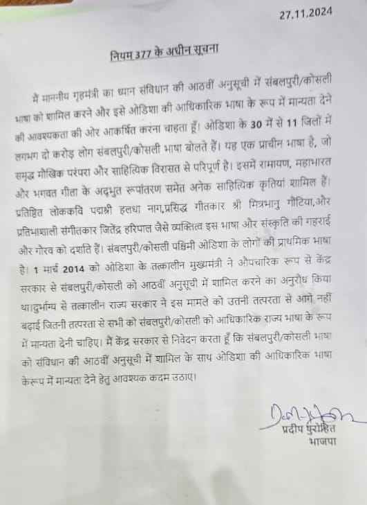 ଲୋକସଭାରେ ଶୀତକାଳୀନ ଅଧିବେଶନ ଚାଲିଥିବା ବେଳେ ଆଜି ଦ୍ବିତୀୟ ଦିନରେ ସମ୍ବଲପୁରୀ - କୋଶଳି ଭାଷାକୁ ସମ୍ବିଧାନର ଅଷ୍ଟମ ଅନୁଚ୍ଛେଦରେ ସାମିଲ କରିବା ସହ ଓଡିଶା ସରକାରଙ୍କ ସରକାରୀ ଭାଷାର ମାନ୍ଯତା ଦେବାପାଇଁ ଲୋକସଭାରେ ବରଗଡ ସାଂସଦ ଶ୍ରୀ ପ୍ରଦୀପ ପୁରୋହିତ ପ୍ରସଙ୍ଗ ଉଠାଇ କେନ୍ଦ୍ର ସରକାରଙ୍କ ଦୃଷ୍ଟି ଆକର୍ଷଣ କରିଛନ୍ତି । ନିୟମ ୩୭୭ ର ଅଧି ସୂଚନା ଅନୁଯାଇ ଲୋକସଭାରେ ସାଂସଦ ଶ୍ରୀ ପୁରୋହିତ ଏହି ପ୍ରସଙ୍ଗ ଉଠାଇ ଉଲ୍ଲେଖ କରିଛନ୍ତି ଯେ ଓଡିଶାର ଜିଲ୍ଲାରୁ ୩୦ଟି ରୁ ୧୧ଟି ଜିଲ୍ଲାର ଲୋକେ କୋଶଳି - ସମ୍ବଲପୁରୀ ଭାଷା କହନ୍ତି । ଏହା ଏକ ପ୍ରାଚୀନ ଭାଷା ସହ ଏହି ଭାଷାରେ ରାମାୟଣ,ମହାଭାରତ ଏବଂ ଭଗବତ ଗୀତା ଭଲି ହିନ୍ଦୁ ଧର୍ମ ଗ୍ରନ୍ଥ ଅନୁବାଦିତ ହୋଇ ସାରିଛି । ସମ୍ବଲପୁରୀ - କୋଶଳି ଭାଷା ପଶ୍ଚିମ ଓଡିଶାର ପ୍ରାଥମିକ ଭାଷା ଅଟେ ବୋଲି ଶ୍ରୀ ପୁରୋହିତ ଉଲ୍ଲେଖ କରି ସମ୍ବିଧାନର ଅଷ୍ଟମ ଅନୁଚ୍ଛେଦରେ ସାମିଲ ସହ ଏହି ଭାଷାକୁ ଓଡିଶା ସରକାରଙ୍କ ସରକାରୀ ଭାଷାରେ ମାନ୍ଯତା ଦେବାକୁ ଦାବୀ କରିଛନ୍ତି