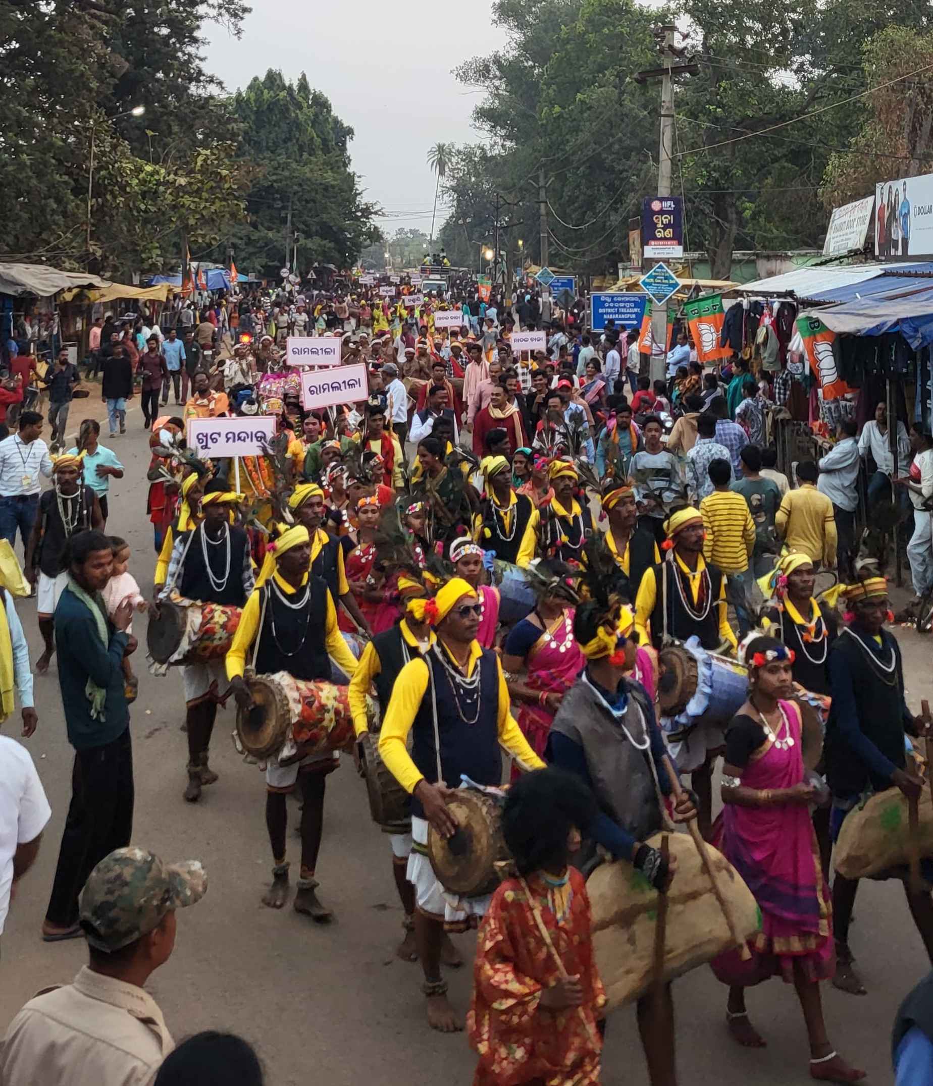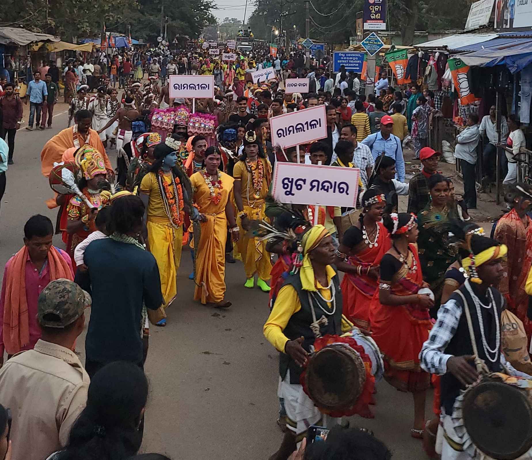 ଏଥିସହିତ ଜିଲ୍ଲାର ବିଭିନ୍ନ ଅଞ୍ଚଳରୁ ଆସିଥିବା କଳାକାର, ସ୍ବୟଂ ସହାୟକ ଗୋଷ୍ଠୀ ର ମହିଳା ମାନେ ଉକ୍ତ ଶୋଭାଯାତ୍ରା ରେ ବାହାରି ମଣ୍ଡେଇ ପଡିଆ ଠାରେ ପହଞ୍ଚିଥିଲେ | ଶୋଭାଯାତ୍ରା ରେ ମଶାଲ ସମେତ ପ୍ରତୀକ ଦେବୀ ଲାଠି, ଚୌକି, ବାଲି ବିହନ ଚାଙ୍ଗୁଡି, ପ୍ରତୀକ ଭୀମ ଭିମାଣି, ପାରମ୍ପରିକ ଢେମଶା, ସାଇଲଡି, ବିଭିନ୍ନ ପାରମ୍ପରିକ ବାଜା ଧ୍ୱନି ତାଳ ଦ୍ବାରା ନବରଙ୍ଗପୁର ସହର ର ମୁଖ୍ୟ ରାସ୍ତା ଦୁଲକି ଥିଲା | ଶାନ୍ତି ଶୃଙ୍ଖଳା ରକ୍ଷା ନିମନ୍ତେ ବ୍ୟାପକ ପୋଲିସ ର ବ୍ୟବସ୍ଥା କରାଯାଇଥିଲା।
