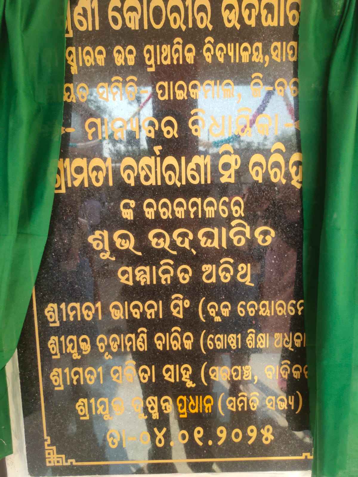 ବରଗଡ:(ନିରଞ୍ଜନ ତ୍ରିପାଠୀ)- ଆଜି ଶନିବାର ଦିନ ପୂର୍ବାହ୍ନ ୧୧ଘଟିକା ସମୟରେ ପାଇକମାଲ ବ୍ଲକ ଅନ୍ତର୍ଗତ ସାପଲହର ଗ୍ରାମର ଗାନ୍ଧୀ ସ୍ମାରକ ସରକାରୀ ଉଚ୍ଚ ପ୍ରାଥମିକ ବିଦ୍ୟାଳୟର ନୂତନ ଶ୍ରେଣୀ କୋଠରୀ ଶୁଭ ଉଦଘାଟନ ପଦ୍ମପୁର ବିଧାୟିକା ଶ୍ରୀମତୀ ବର୍ଷା ସିଂ ବରିହାଙ୍କ କରକମଳରେ ଉଦଘାଟିତ ହୋଇଯାଇଛି। ଉକ୍ତ ଉତ୍ସବରେ ନିମନ୍ତ୍ରିତ ଅତିଥି ଭାବରେ ପାଇକମାଲ ବ୍ଲକ ଭାଇସ ଚେୟାରମେନ ଶ୍ରୀଯୁକ୍ତ ସଞ୍ଜିବ ବରିହା,ଵାଦୀକଟା ସରପଞ୍ଚ ଶ୍ରୀମତୀ ସବିତା ସାହୁ,ବାଦିକଟା ସମିତି ସଭ୍ୟ ଶ୍ରୀଯୁକ୍ତ ଦୁଷ୍ମନ୍ତ ପ୍ରଧାନ, ଗୋଷ୍ଠୀ ଶିକ୍ଷା ଅଧିକାରୀ ପାଇକମାଲ ଶ୍ରୀଯୁକ୍ତ ଚୂଡାମଣି ବାରିକ, ଗୋଷ୍ଠୀ ଶିକ୍ଷା ଅଧିକାରୀ ରାଜବୋଡାସମ୍ଵର ଶ୍ରୀଯୁକ୍ତ ଲୋକନାଥ ଭୋଇ, ଝାରବନ୍ଧ ଗୋଷ୍ଠୀ ଶିକ୍ଷା ଅଧିକାରୀ ଶ୍ରୀଯୁକ୍ତ ଶୁଭମ ପତି , ଭୋଲାନାଥ ମେହେର, କ୍ଷମାନିଧି ବାରିକ ଏବଂ କ୍ଷୀତି ସାହୁ । ଉକ୍ତ ଉଦଘାଟନ ଉତ୍ସବରେ ଗ୍ରାମର ଶତାଧିକ ପୁରୁଷ ଓ ମହିଳା ଉପସ୍ଥିତ ଥିଲେ। ଉଦ୍ ଘାଟନ ଉତ୍ସବ ରେ ସର୍ଵ ପ୍ରଥମେ ବିଦ୍ୟାଳୟ ପ୍ରଧାନ ଶିକ୍ଷକ ଶ୍ରୀ ଯୁକ୍ତ ଶୋଭା ସାଗର ମେହେର ସ୍ଵାଗତ ଭାଷଣ ଦେବା ପରେ ଅତିଥି ଗଣ ନିଜ ନିଜ ବକ୍ତବ୍ୟ ରଖିଥିଲେ । ମଞ୍ଚ ପରିଚାଳନା ସହକାରୀ ଶିକ୍ଷକ ଶ୍ରୀ ଯୁକ୍ତ ପୁରୁଷୋତ୍ତମ ରାଉତ କରିଥିବା ବେଳେ ଶିକ୍ଷୟିତ୍ରୀ ତନୟା ମେହେର,ଆଶାରାଣୀ ବରିହା ଶିକ୍ଷକ ଶ୍ରୀଯୁକ୍ତ ଜିତେନ୍ଦ୍ର ସାହୁ ଅତିଥି ଗଣଙ୍କୁ ମାଲ୍ୟାର୍ପଣ ଓ ପୁଷ୍ପଗୁଚ୍ଛ ପ୍ରଦାନ କରିଥିଲେ। ଉକ୍ତ ଉତ୍ସବରେ ଵାଦିକଟା ଆଞ୍ଚଳିକ ସାଧନ କେନ୍ଦ୍ର ସଂଯୋଜକ ଶ୍ରୀଯୁକ୍ତ ରୁଷଭ ସାହୁ , ବିଦ୍ୟାଳୟରୁ ଡେପୁଟେସନ ରେ ଥିବା ଶିକ୍ଷୟିତ୍ରୀ ଶ୍ରୀମତୀ ସସ୍ମିତା ସେଠ ଉପସ୍ଥିତ ଥିଲେ। ପରିଶେଷରେ ଶିକ୍ଷକ ଶ୍ରୀ ରାଉତ ଧନ୍ୟବାଦ ଅର୍ପଣ କରିଥିଲେ ।
