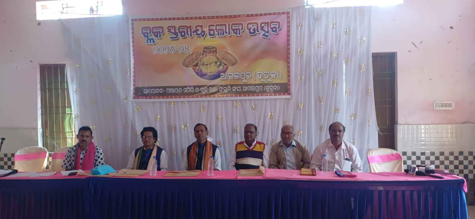 ଆଗଲପୁର, (ବିନୋଦ ଦୀପ) ଆଗଲପୁର ବ୍ଲକ ର ଆଗଲପୁର ସ୍ଥିତ କଲ୍ୟାଣ ମଣ୍ଡପ ରେ ବ୍ଲକ୍ ସ୍ତରୀୟ ଲୋକ ଉତ୍ସବ ଅନୁଷ୍ଠିତ ହୋଇ ଯାଇଛି l ଏଥିରେ ମୁଖ୍ୟ ଅତିଥି ଭାବରେ ଶ୍ରୀଯୁକ୍ତ ବଂଶୀଧର ବେହେରା ଯୋଗ ଦେଇଥିଲେ l ସମ୍ମାନିତ ଅତିଥି ଭାବରେ ଶ୍ରୀଯୁକ୍ତ ନନ୍ଦଳାଲ ପଟେଲ୍, ବ୍ରଜକିଶୋର ଘିବେଲା, ବରୁଣ ଶତପଥୀ ଓ ଅଭିମନ୍ୟୁ ମିଶ୍ର ଯୋଗ ଦେଇଥିଲେ l ବ୍ଲକ କଳାକାର ସଂଘ ର ଉପ ସଭାପତି ଶ୍ରୀ ସୂର୍ଯ୍ୟକାନ୍ତ ବେହେରା ଓ ଗୋଷ୍ଠୀ ସାମାଜିକ ସୁରକ୍ଷା ଅଧିକାରୀ ଶ୍ରୀ ସୁଶାନ୍ତ ମହାକୁର ଙ୍କ ପ୍ରତ୍ୟକ୍ଷ ତତ୍ତ୍ଵାବଧାନରେ ଆଜିର ଲୋକ ଉତ୍ସବ ଅତି ସୁନ୍ଦର ଭାବରେ ପରିଚାଳିତ ହୋଇଥିଲା l ଆଜିର ଲୋକ ଉତ୍ସବ ରେ ସର୍ବ ମୋଟ 41 ଗୋଟି ଦଳ ନିଜ ନିଜ କଳା ପ୍ରଦର୍ଶନ କରିଥିଲେ।ବିଶେଷ କରି ଗଣ୍ଡା ବାଜା, ନଚନିଆ, କୀର୍ତ୍ତନ, ସମ୍ପ୍ରଦା, ହୁମୋ ଗୀତ, ବାଦ୍ୟ, ନୃତ୍ୟ ଇତ୍ୟାଦି ପରିବେଷଣ ହୋଇଥିଲା l କଳାକାର ମାନେ ଅତି ଉତ୍ସାହ ର ସହିତ ନିଜ ନିଜ କଳା ପ୍ରଦର୍ଶନ କରିଥିଲେ l