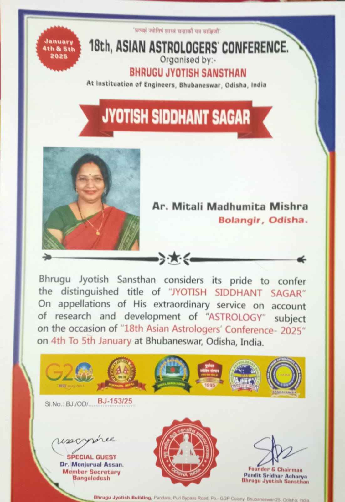 ବଲାଙ୍ଗୀର(ପ୍ରେରଣା ଖବର): ବଲାଙ୍ଗୀରର ମିତାଲି ମଧୁମିତା ମିଶ୍ରଙ୍କୁ 'ଭୃଗୁ ଜ୍ୟୋତିଷ ସଂସ୍ଥାନ' ପକ୍ଷରୁ ' ୧୮ ତମ ଏସିଆନ୍ ଆଷ୍ଟ୍ରୋଲୋଜରସ୍ କନ୍ ଫରେନ୍ ସ- ୨୦୨୫ ' ରେ ' ଜ୍ୟୋତିଷ ସିଦ୍ଧାନ୍ତସାଗର ' ସମ୍ମାନ ପ୍ରଦାନ କରାଯାଇଛି । ଗତ ଜାନୁଆରୀ ୪ ଓ ୫ ତାରିଖରେ ଭୁବନେଶ୍ଵରର ଇନଷ୍ଟିଚ୍ୟୁଟ୍ ଅଫ୍ ଇଞ୍ଜିନିୟରସ୍ ଠାରେ ଅନୁଷ୍ଠିତ ଏହି ଆନ୍ତର୍ଜାତୀୟ ଜ୍ୟୋତିଷ ସମ୍ମେଳନରେ ଜ୍ୟୋତିଷଶାସ୍ତ୍ରରେ ଉଚ୍ଚସ୍ତରୀୟ ଗବେଷଣା ଓ ଉଲ୍ଲେଖନୀୟସେବା ସକାଶେ ତାଙ୍କୁ ଉପଢୌକନ , ମାନପତ୍ର ଓ ଟ୍ରଫି ପ୍ରଦାନ କରାଯାଇଛି । ଏହି ସମ୍ମିଳନୀରେ ଏସିଆ ମହାଦେଶର ଭାରତ ସମେତ ଥାଇଲାଣ୍ଡ , ମିଆଁମାର , ଭୁଟାନ ଇତ୍ୟାଦି ୬ଟିଦେଶ ଓ ଭାରତର ବିଭିନ୍ନ ପ୍ରାନ୍ତରୁ ପ୍ରାୟ ୩୫୦ ରୁ ଉର୍ଦ୍ଧ୍ବ ଜ୍ୟୋତିଷ ପଣ୍ଡିତମାନେ ଅଂଶଗ୍ରହଣ କରିଥିଲେ । ସଂସ୍ଥାନର ଅଧ୍ୟକ୍ଷ