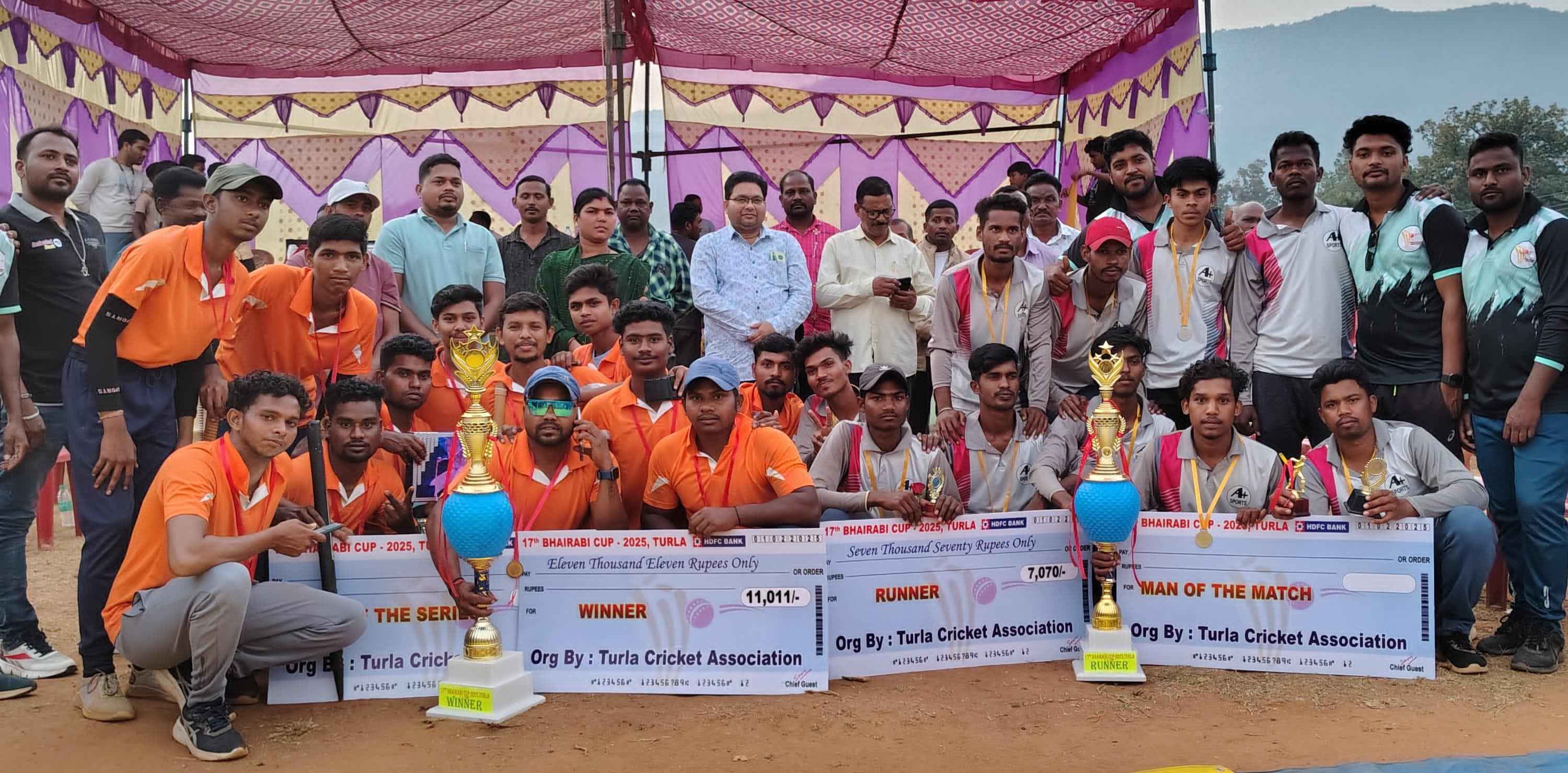 (ପୂର୍ଣ୍ଣ ଶଶୀ ଶେଖର ରାଓ ) ବଲାଙ୍ଗିର ଜିଲ୍ଲା ଖପ୍ରାଖୋଲ ବ୍ଲକ୍ ଭାନପୁର ପଞ୍ଚାୟତ ଅନ୍ତର୍ଗତ ତୁର୍ଲା ଠାରେ ଚାଲିଥିବା ୧୭ ତମ ଭୈରବୀ କପ୍ କ୍ରିକେଟ ଟୁର୍ଣ୍ଣାମେଣ୍ଟ ଉଦଯାପିତ ହୋଇଯାଇଛି । ଫାଇନାଲ ଖେଳ ଧଣ୍ଡାମୁଣ୍ଡା ଓ ବନ୍ଦେପଦର ମଧ୍ୟରେ ଅନୁଷ୍ଠିତ ହୋଇଥିଲା । ବନ୍ଦେପଦର ଦଳ ପ୍ରଥମେ ବ୍ୟାଟିଙ୍ଗ କରି ନିର୍ଦ୍ଧାରିତ ୧୬ ଓଭର ରେ ୮ ୱିକେଟ୍ ହରାଇ ୧୦୮ ରନ୍ ସଂଗ୍ରହ କରିଥିଲା। ଏହାର ଜବାବ ରେ ଧଣ୍ଡାମୁଣ୍ଡା ଦଳ ୧୨.୪ ଓଭର ରେ ୪ ୱିକେଟ ହରାଇ ୧୦୯ ରନ ସଂଗ୍ରହ କରି ନେଇଥିଲା । ଯାହା ଫଳରେ ଧଣ୍ଡାମୁଣ୍ଡା ଦଳ ଚାମ୍ପିୟନ ହୋଇଥିଲା । ଆୟୋଜିତ ପୁରସ୍କାର ବିତରଣ ଉତ୍ସବରେ ଭୈରବୀ କ୍ରିକେଟ୍ କ୍ଲବ ସଭାପତି ଜ୍ୟୋତି ରଞ୍ଜନ ପଣ୍ଡା ଅଧ୍ୟକ୍ଷତା କରିଥିବା ବେଳେ ମୁଖ୍ୟ ଅତିଥି ଭାବେ ପାଟଣାଗଡ ପୂର୍ବତନ ବିଧାୟକ ସରୋଜ ମେହେର ଯୋଗ ଦେଇଥିଲେ । ସମ୍ମାନିତ ଅତିଥି ଭାବେ ପାଟଣାଗଡ ଏନ୍ଏସି ଉପାଧ୍ୟକ୍ଷ ପ୍ରଫୁଲ୍ଲ ମେହେର, ଭାନପୁର ସରପଞ୍ଚ ରୀନା ଜାଲ, ଅମିତ୍ ସୁନା, ଡିଲେଶ୍ୱର ଜାଲ, ଶୋଭନମୟ ମିଶ୍ର, ତୁର୍ଲା ଆଶ୍ରମ ସ୍କୁଲ ପ୍ରଧାନ ଶିକ୍ଷକ ଭୂପିନ୍ଦ୍ର ବନଗୁଲା, ବୃନ୍ଦାବନ ସେଠ୍, ଗୋପାଲ ପାତ୍ର, ବ୍ରହ୍ମା ନନ୍ଦ ସାହୁ, ଟିକେଲାଲ ପାତ୍ର ଯୋଗ ଦେଇଥିଲେ। ଚାମ୍ପିୟନ ଦଳକୁ ଟ୍ରଫି ସହ ୧୧୦୧୧ ଟଙ୍କା ଏବଂ ରନର୍ସ ଅପ ଦଳ କୁ ଟ୍ରଫି ସହ ୭୦୭୦ ଟଙ୍କା ଅତିଥି ମାନେ ପ୍ରଦାନ କରିଥିଲେ। ଅମ୍ପାୟାର ରୁପେ ନିକୁ ଶବର ଓ ଆଶିଷ ପାଣିଗ୍ରାହୀ ଖେଳକୁ ପରିଚାଳନା କରିଥିବା ବେଳେ ସ୍କୋରର ରୁପେ ପ୍ରଶାନ୍ତ ମେହେର ଦାୟିତ୍ଵ ତୁଲାଇଥିଲେ। ସୁଦାମ ସାହୁ ଓ ରଞ୍ଜିତ ମେହେର ଖେଳର ଧାରା ବିବରଣୀ ପ୍ରଦାନ କରିଥିଲେ। ଅନ୍ୟ ମାନଙ୍କ ମଧ୍ୟରେ ଧର୍ମେନ୍ଦ୍ର ଭୋଇ, ସଞ୍ଜୀବ ପାଣିଗ୍ରାହୀ, ମନିଲାଲ ଛତର, ଗୋପାଲ ବାରିକ, ନିରଞ୍ଜନ ଭୋଇ, ରାମଚନ୍ଦ୍ର ବରିହା, କୁଶ ରଞ୍ଜନ ଭୋଇ, ସୁବନ୍ ଶବର, ବାବାଜୀ ଭୁଏ, ଜଗତ ଦୀପ, ଆକାଶ ପାଣଗ୍ରାହୀ, ଧନଞ୍ଜୟ ବାରିକ, କେଦାର ବାରିକ, ଓଁକାର ଭୋଇ, ସୁବିତ ଭୋଇ, ସ୍ଵାଧୀନ ପଣ୍ଡା, ଦେବାଶିଷ ପାଣିଗ୍ରାହୀ, ନବୀନ ଭୁଏ, ଛବିଲ ପଧାନ ପ୍ରମୁଖ କ୍ଳବ୍ ସଦସ୍ୟ ଉପସ୍ଥିତ ଥିଲେ। ଟୁର୍ଣ୍ଣାମେଣ୍ଟ ଟି ଆଠ ଦିନ ଧରି ଚାଲିଥିବା ବେଳେ ୧୬ ଟି ଦଳ ଭାଗ ନେଇଥିଲେ ।