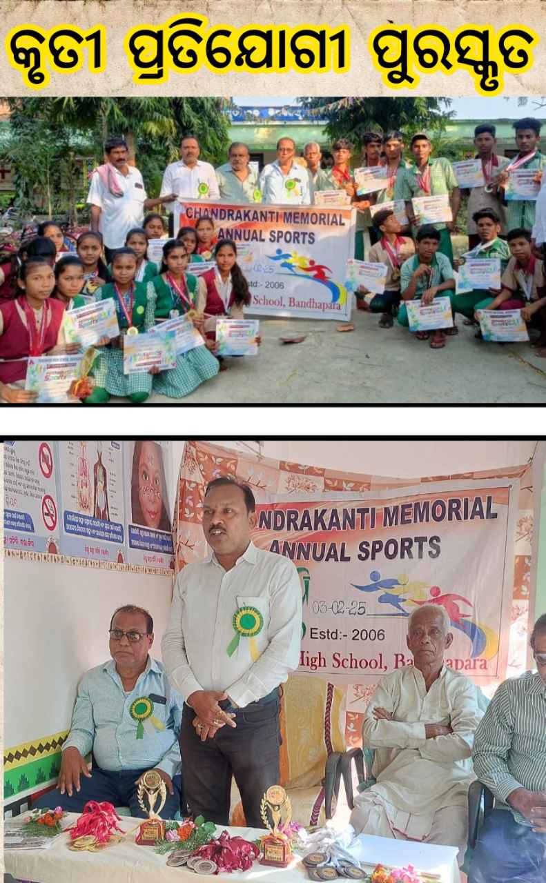 ଆଜି ପୁଇଁତଲା ବ୍ଲକ ଅନ୍ତର୍ଗତ ପଂଚାୟତ ଉଚ୍ଚ ବିଦ୍ୟାଳୟ, ବନ୍ଧପଡାଠାରେ ଅଠରତମ ଚନ୍ଦ୍ରକାନ୍ତି ମେମୋରିଆଲ ବାର୍ଷିକ କ୍ରୀଡାର ଉଦଯାପନୀ ଉତ୍ସବରେ ବିଦ୍ୟାଳୟର ପ୍ରଧାନ ଶିକ୍ଷକ ଆନନ୍ଦ ବଡ଼ପଣ୍ଡାଙ୍କ ସଭାପତିତ୍ୱରେ ଖେଳ ଶିକ୍ଷକ ପ୍ରବୀଣ ନାରାୟଣ ପଣ୍ଡା ଉତ୍ସବର ଲକ୍ଷ୍ୟ ତଥା ବିବରଣୀ ପାଠ କରିଥିଲେ | ପୂର୍ବତନ ପ୍ରଧାନ ଶିକ୍ଷକ ଯୋଗୀନ୍ଦ୍ର ମହାପାତ୍ର ମୁଖ୍ୟ ଅତିଥି ଭାବେ ଯୋଗଦେଇ ଶିକ୍ଷା ଓ କ୍ରୀଡା ପ୍ରତ୍ୟେକ ଛାତ୍ର ଛାତ୍ରୀଙ୍କ ଅଭିବୃଦ୍ଧି ପାଇଁ ଆବଶ୍ୟକ ବୋଲି ବକ୍ତବ୍ୟ ରଖିଥିଲେ | ଗ୍ରାମର ବରିଷ୍ଠ ନାଗରିକ ମିତ୍ରଭାନୁ ପଧାନ ସମ୍ମାନୀୟ ଅତିଥି ଭାବେ ଯୋଗ ଦେଇ ଅନ୍ତର୍ନିହିତ ଗୁଣର ବିକାଶ, ପରିବେଶକୁ ସ୍ଵଚ୍ଚ ରଖିଵା ଉପରେ ଛାତ୍ର ଛାତ୍ରୀମାନଙ୍କୁ ଦିଗଦର୍ଶନ ଦେଇଥିଲେ | ପ୍ରଧାନ ଶିକ୍ଷକ ଶ୍ରୀ ବଡ଼ପଣ୍ଡା ଶୃଙ୍ଖଳା ଓ ସମୟାନୁବର୍ତ୍ତିତା ରହିବା ସହ ସ୍ୱାସ୍ଥ୍ୟକୁ ଠିକ ରଖିବା ପାଇଁ