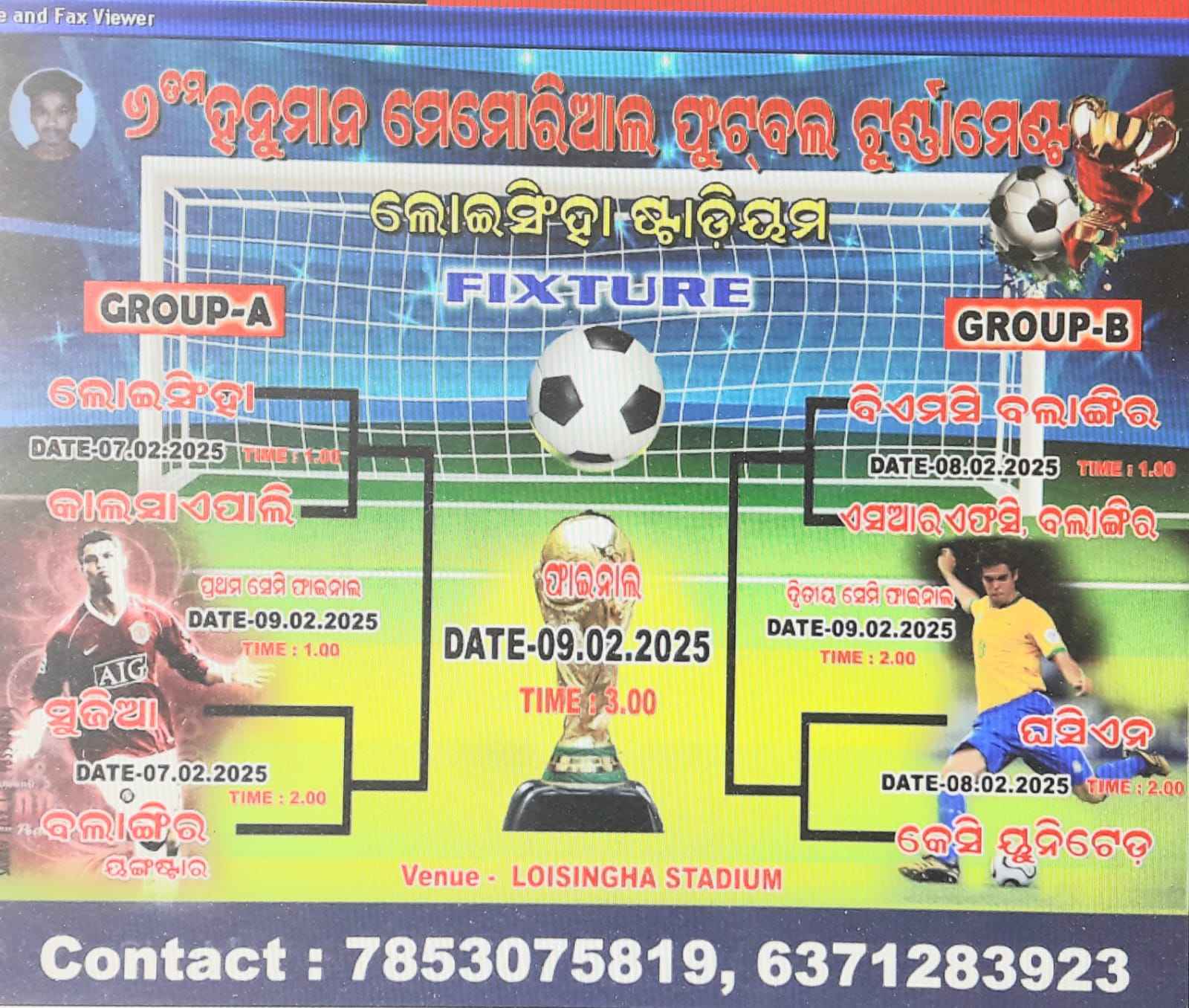 ଲୋଇସିଂହା, (ବିନୋଦ ଦୀପ) ଲୋଇସିଂହା ଷ୍ଟାଡିୟମ ଠାରେ ଫୁଟବଲ ସଂଘ ତରଫରୁ ଷଷ୍ଠ ତମ ହନୁମାନ ମେମୋରିଏଲ ଫୁଟବଲ ଟୁର୍ନାମେଣ୍ଟ ଅନୁଷ୍ଠିତ ହୋଇଯାଇଛି l ତିନି ଦିନ ଚାଲିଥିବା ଟୁର୍ନାମେଣ୍ଟ ରେ ଆଠ ଟି ଦଳ ଭାଗ ନେଇଥିବା ବେଲେ ପ୍ରଥମ ଦିନ ରେ ଲୋଇସିଂହା ଓ କାଳସାଏ ପାଲି ଦଳ ମଧ୍ୟରେ ରେ ଅନୁଷ୍ଠିତ ହୋଇଥିବା ବେଲେ ପ୍ରଥମ ଦିନ ରେ ମୁଖ୍ୟ ଅତିଥି ଭାବେ ଲୋଇସିଂହା ସରପଞ୍ଚ ନବକିଶୋର ନାଏକ, ଯୋଗ ଦେଇଥିବା ବେଲେ ସମ୍ମାନିତ ଅତିଥି ପୂର୍ବତନ ଖେଳ ଶିକ୍ଷକ ତଥା ଟ୍ରଷ୍ଟ ବୋର୍ଡ ସଭ୍ୟ ବିଭୁତି ଭୂଷଣ ସାହାଣୀ, ବିଶ୍ଵନାଥ ଭୂୟାଁ, ଲୋଇସିଂହା ଷ୍ଟାଡିୟମ ସମ୍ପାଦକ ଶିବ କୁମାର ଅଗ୍ରୱାଲ ମଂଚାସୀନ ରହିଥିଲେ l ଦ୍ୱିତୀୟ ଦିନରେ ଅତିଥି ଭାବେ ବୁର୍ଡl ସରପଞ୍ଚ ସୁଦିପ ସା, ହୀରାପୁର ସରପଞ୍ଚ ରମାକାନ୍ତ ବିଶ୍ଵାଳ ଯୋଗ ଦେବା କାର୍ଯ୍ୟକ୍ରମ ରହିଥିବା ବେଲେ ଆସନ୍ତା 9ତାରିଖ ଦିନ ଫାଇନାଲ ଖେଳ ଅନୁଷ୍ଠିତ ହେବ ବୋଲି ଫୁଟବଲ ଟୁର୍ନାମେଣ୍ଟ କମିଟି ନଜୁ ଖାନ ଙ୍କ ପ୍ରକାଶ କରିଛନ୍ତି l