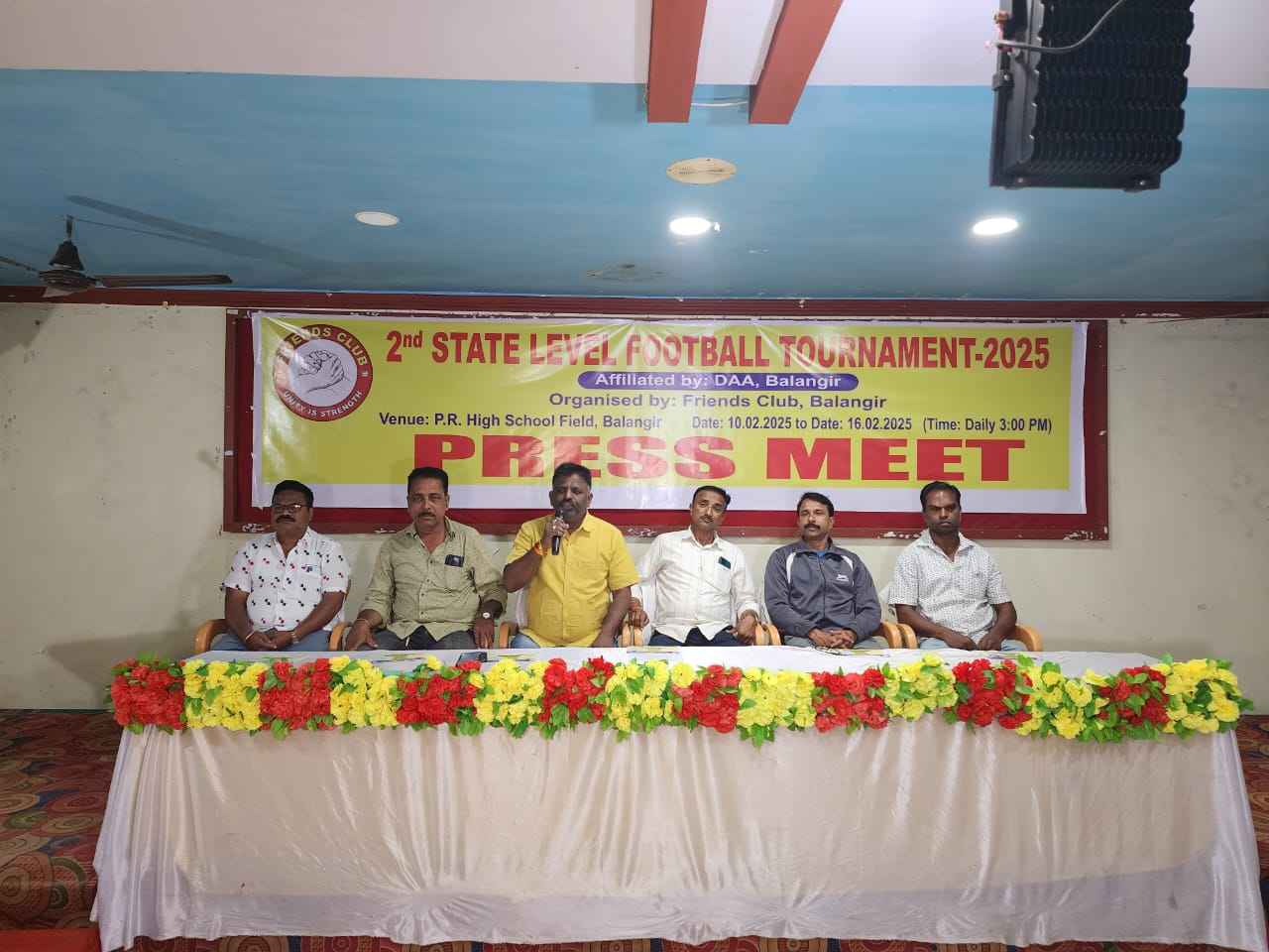 ବଲାଙ୍ଗିର(ପ୍ରେରଣା ଖବର) ବଲାଙ୍ଗିର ସୁପରିଚିତ ଅନୁଷ୍ଠାନ ଫ୍ରେଣ୍ଡସ କ୍ଳବ ତରଫରୁ ଦ୍ଵିତୀୟ ରାଜ୍ୟ ସ୍ତରୀୟ ଫୁଟବଲ ଟୁର୍ନାମେଣ୍ଟ ଆସନ୍ତା ଫେବୃଆରୀ ୧୦ ତାରିଖ ରୁ ୧୬ ତାରିଖ ପର୍ଯ୍ୟନ୍ତ ସ୍ଥାନୀୟ ପୃଥ୍ୱୀରାଜ ହାଇସ୍କୁଲ ଖେଳ ପଡିଆ ରେ ଆୟୋଜିତ ହେବାକୁ ଯାଉଛି l ଆଜି ଏହି ସଂକ୍ରାନ୍ତରେ ଏକ ସାମ୍ବାଦିକ ସମ୍ମିଳନୀ ସ୍ଥାନୀୟ ସାମ୍ବାଦିକ ଭବନ ଠାରେ ଆୟୋଜିତ ହୋଇଥିଲା l