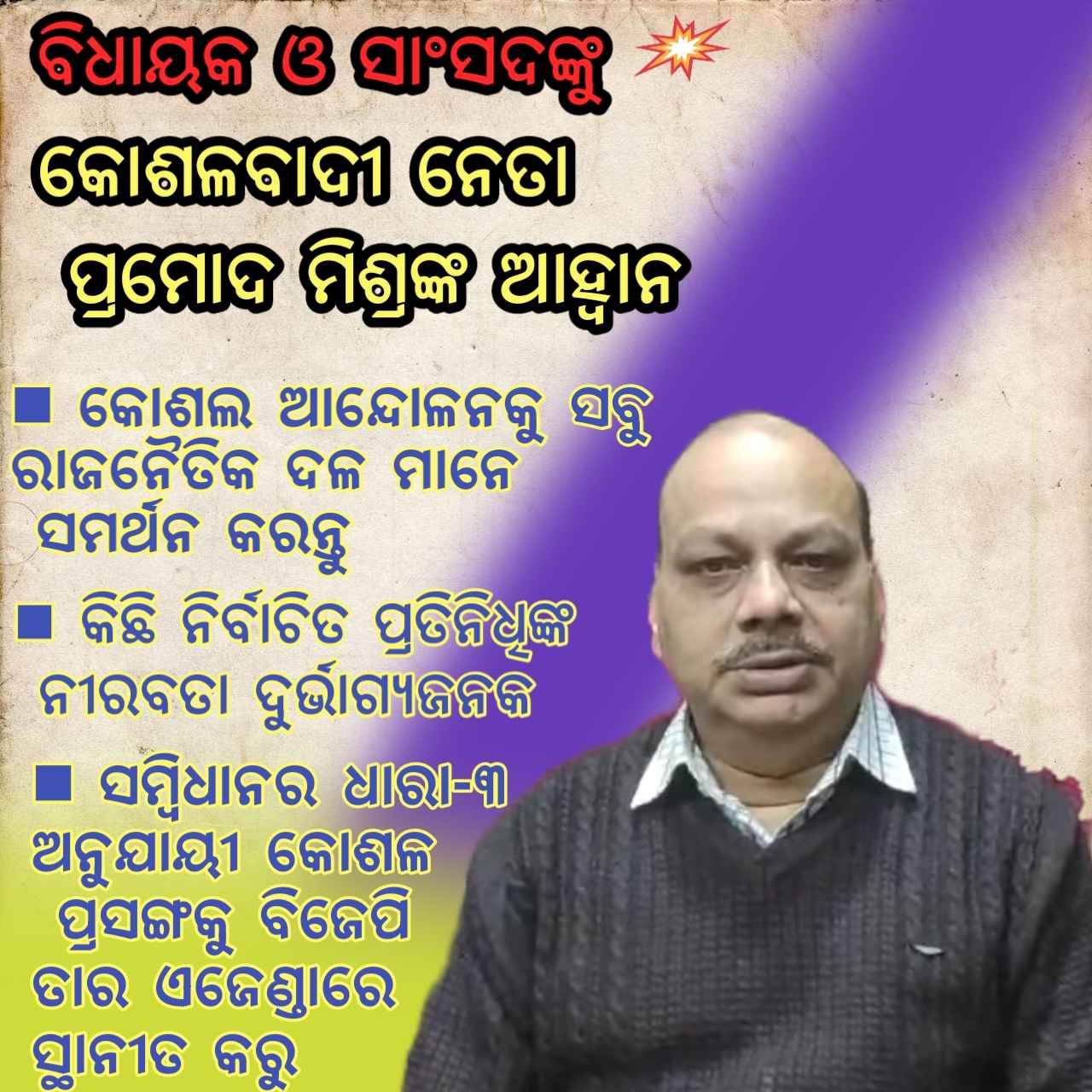 ଏ ଅଞ୍ଚଳର ୨ ଜଣ କେନ୍ଦ୍ର ମନ୍ତ୍ରୀ, ଜଣେ ଉପମୁଖ୍ୟମନ୍ତ୍ରୀଙ୍କ ସମେତ ବହୁ ମନ୍ତ୍ରୀ ଏଥର କ୍ୟାବିନେଟ ରେ ସ୍ଥାନୀତ ହୋଇ ଛନ୍ତି । ତେଣୁ କୋସଳ ଦାବୀ ଆମ ଦଳର ଏଜେଣ୍ଡାରେ ନାହିଁ ବୋଲି କହିବା ପରିବର୍ତ୍ତେ ସେମାନେ କୋସଲ ରାଜ୍ୟ କିଭଳି ଭାବରେ ଗଠନ କରାଯାଇପାରିବ ତା ପାଇଁ ବିଧିବଦ୍ଧ ପଦକ୍ଷେପ ନିଅନ୍ତୁ । ରାଜନୈତିକ ଓଡିଶାରେ କୋସଳାଂଚଳ ହେଉଛି ବିଜେପି ର କେନ୍ଦ୍ରସ୍ଥଳୀ । ବିଜେପିର ଦୁର୍ବିପାକ ସମୟରେ କୋସଳାଂଚଳ ବିଜେପିକୁ ବହୁତ ସହଯୋଗ କରିଛି । ତେଣୁ ଏବେ ଡବଲ ଇଂଜିନ ସରକାର ଚାଲିଥିବା ବେଳେ ସଂବିଧାନର ଧାରା-୩ ଅନୁଯାୟୀ ସ୍ୱତନ୍ତ୍ର କୋସଳ ରାଜ୍ୟ ଦାବୀକୁ ବିଜେପି ସମର୍ଥନ କରି ନିଜର ରାଜନୈତିକ ଏଜେଣ୍ଡାରେ ସ୍ଥାନୀତ କରୁ । ଏହାଛଡା ଯଦି ରାଜନୈତିକ ଦୁର୍ବିପାକରୁ ରକ୍ଷା ପାଇବାକୁ ଚାହୁଁଛନ୍ତି ତେବେ ଉଭୟ ବିଜେଡି ଓ କଂଗ୍ରେସ ଦଳ ତଥା ଅନ୍ୟାନ୍ୟ ରାଜନୈତିକ ଦଳମାନେ ମଧ୍ୟ ସ୍ୱତନ୍ତ୍ର କୋସଳ ରାଜ୍ୟ ଦାବୀକୁ ଖୋଲାଖୋଲି ଭାବରେ ସମର୍ଥନ କରନ୍ତୁ। ଏହା ଛଡା କୋସଲ ଦାବୀ ବିରୁଦ୍ଧରେ ମତ ଦେଉଥିବା ନେତା ମନ୍ତ୍ରୀମାନଙ୍କୁ କୋସଳାଂଚଳରେ ଜନସାଧାରଣ ରାଜରାସ୍ତାରେ ବିରୋଧ କରନ୍ତୁ ବୋଲି କୋସଳ ଆନ୍ଦୋଳନର ନେତା ଶ୍ରୀ ପ୍ରମୋଦ ମିଶ୍ର ଆହ୍ୱାନ ଦେଇଛନ୍ତି ।