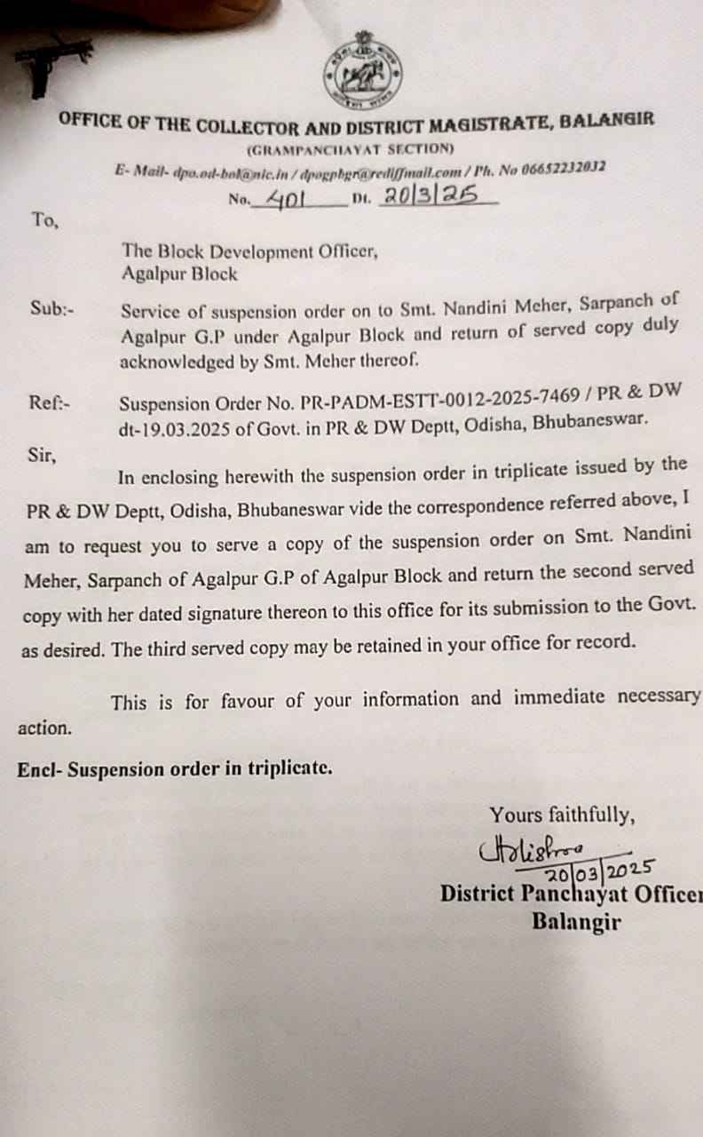 ଏହି ପତ୍ର ଗତ 19-3-2025 ରେ ପ୍ରକାଶ ପାଇଥିବା ଜଣା ପଡିଛି। ପଞ୍ଚାୟତ ର ବିଭିନ୍ନ ଉନ୍ନୟନମୂଳକ କାର୍ଯ୍ୟ ପାଇଁ ଆସିଥିବା ଅର୍ଥ କୁ ପୂର୍ବତନ କାର୍ଯ୍ୟନିର୍ବାହୀ ଅଧିକାରୀ ଶ୍ରୀ ରାଜ୍ କିଶୋର ପୋଢ଼ ଙ୍କ ସହିତ ମିଶି ଅର୍ଥ ହେରଫେର ହୋଇଥିବା ଅଭିଯୋଗ ରେ ତାଙ୍କୁ ନିଲମ୍ବନ କରା ଯାଇଛି l ଏହା ପୂର୍ବରୁ କାର୍ଯ୍ୟନିର୍ବାହୀ ଅଧିକାରୀ ଶ୍ରୀ ରାଜ୍ କିଶୋର ପୋଢ଼ ଙ୍କୁ ଜେଲ ଯିବାକୁ ମଧ୍ୟ ପଡ଼ିଥିଲା l