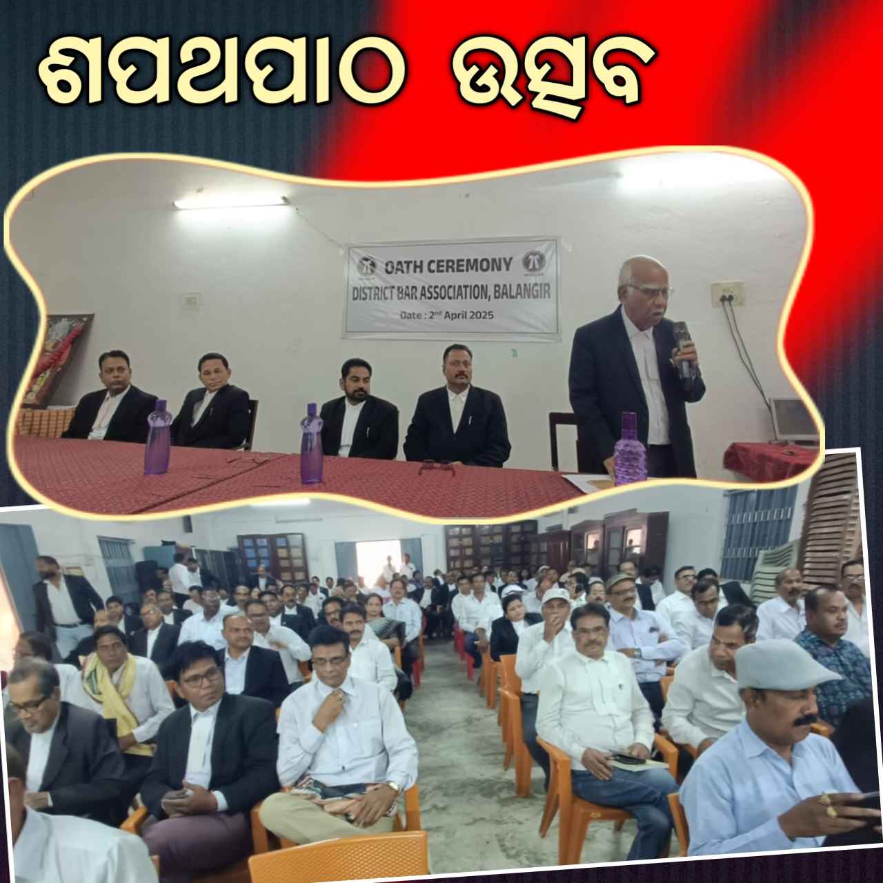 ବଲାଙ୍ଗିର(ପ୍ରେରଣା ଖବର): ବଲାଙ୍ଗିର ଜିଲ୍ଲା ଓକିଲ ସଂଘ ର ନବ ନିର୍ବାଚିତ ପଦାଧିକାରୀ ଙ୍କ ଶପଥ ଗ୍ରହଣ ଉତ୍ସବ ସିଭିଲ କୋର୍ଟ ପରିସରରେ ଥିବା ସଭାଗୃହ ରେ ଅନୁଷ୍ଠିତ ହୋଇଯାଇଛି।୨୦୨୫-୨୬ ବର୍ଷ ପାଇଁ ସଭାପତି ଭାବେ ଶ୍ରୀଯୁକ୍ତ ବାସୁଦେବ ରଥ,ଉପସଭାପତି ଶ୍ରୀଯୁକ୍ତ ସୁଧାଂଶୁ ଶେଖର ଦେଓ,ସମ୍ପାଦକ ଶ୍ରୀଯୁକ୍ତ ସଞ୍ଜୟ କୁମାର ବଗର୍ତ୍ତି, ସହ ସମ୍ପାଦକ ଶ୍ରୀଯୁକ୍ତ ସୁମିତ୍ କୁମାର ଖୁଆସ୍,କୋଷାଧ୍ୟକ୍ଷ ଶ୍ରୀଯୁକ୍ତ ସମୀର କୁମାର ମିଶ୍ର,କାର୍ଯ୍ୟକାରୀ ସଦସ୍ୟ ଭାବେ ପ୍ରମୋଦ କୁମାର ତ୍ରିପାଠୀ, ଶଙ୍କର ପ୍ରସାଦ ମିଶ୍ର, ଆର୍ତ୍ତତ୍ରାଣ ପୁରୋହିତ, ସରୋଜ କୁମାର ଗୁପ୍ତା, ରାଜେନ୍ଦ୍ର ମିଶ୍ର, ମଳୟ ରଞ୍ଜନ ଗଡ଼ତ୍ୟା,ଶ୍ରୀମତୀ ଦୀପ୍ତି ଶର୍ମା, ପ୍ରଦୀପ କୁମାର ମହାପାତ୍ର, ଗୋବିନ୍ଦ ଚନ୍ଦ୍ର ମହାନ୍ତି, ଶିବ ଦତ୍ତ ଦ୍ବିବେଦୀ, ଭବାନୀ ଶଙ୍କର ଭୋଇ, ସବିତା ରାଣୀ ମିଶ୍ର ପ୍ରମୁଖଙ୍କୁ ବରିଷ୍ଟ ଆଇନଜୀବୀ ଆନନ୍ଦ ଚନ୍ଦ୍ର ପାଣିଗ୍ରାହୀ ଶପଥ ପାଠ କରାଇଥିଲେ।