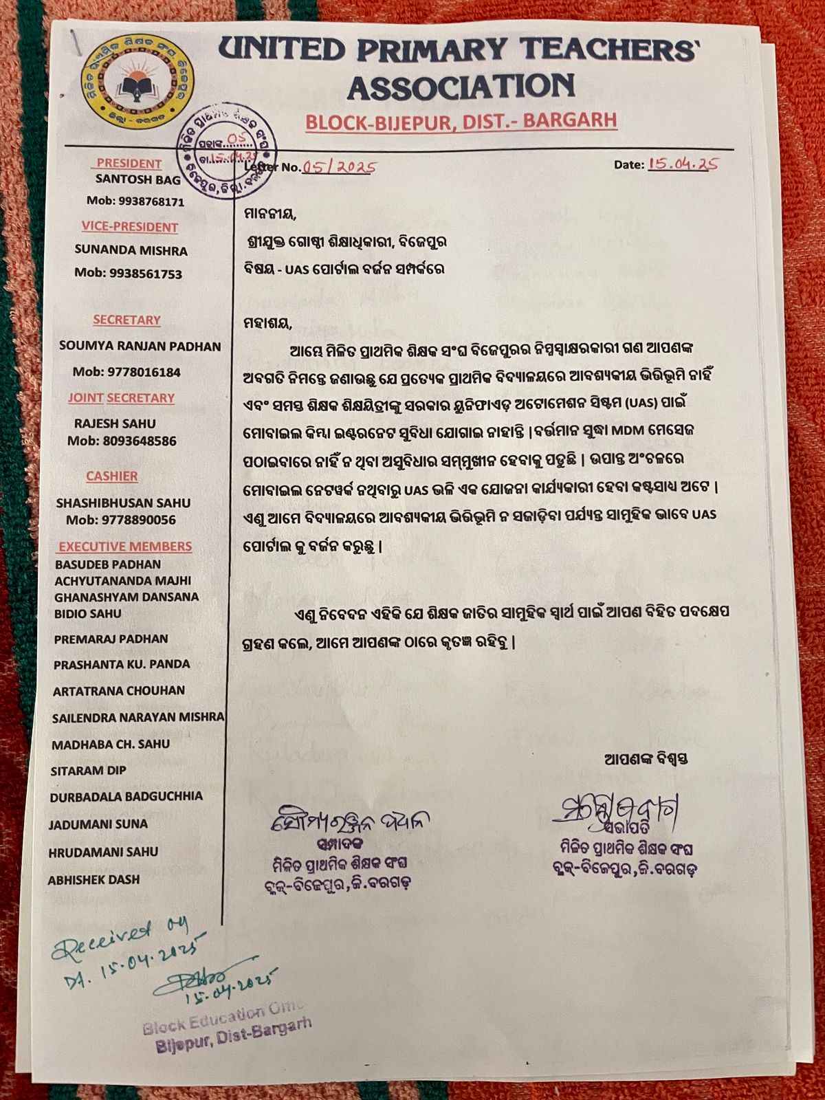 ବରଗଡ଼:(ନିରଞ୍ଜନ ତ୍ରିପାଠୀ)-ଆଜି ବିଜେପୁର ମିଳିତ ପ୍ରାଥମିକ ଶିକ୍ଷକ ସଂଘ ତରଫ ରୁ ବିଜେପୁର ବ୍ଲକ ଶିକ୍ଷା ଅଧିକାରୀ ଙ୍କୁ Unified Automation System (UAS) portal ବର୍ଜନ ସମ୍ପର୍କ ରେ ଏକ ଦାବି ପତ୍ର ପ୍ରଦାନ କରାଯାଇଛି। ପ୍ରାଥମିକ ବିଦ୍ୟାଳୟରେ ଆବଶ୍ୟକୀୟ ଭିତ୍ତିଭୂମିର ଅଭାବ, ଉପାନ୍ତ ଅଞ୍ଚଳରେ ମୋବାଇଲ ନେଟୱର୍କ, ଇଣ୍ଟରନେଟ ସମସ୍ୟା ସହ ଶିକ୍ଷକ ଶିକ୍ଷୟିତ୍ରୀ ଙ୍କୁ ଅନାବଶ୍ୟକ କାର୍ଯ୍ୟଭାର ଦେଇ ଶିକ୍ଷାଦାନ ପ୍ରକ୍ରିୟାରେ ସମସ୍ୟା ସୃଷ୍ଟି ହେବା ଭଳି ଏକ ପୋର୍ଟାଲ ଲାଗୁ କରାଯାଇଥିବାରୁ ଶିକ୍ଷକ ମହଲରେ ଅସନ୍ତୋଷ ପ୍ରକାଶ ପାଇଛି। ଏହାକୁ ଶିକ୍ଷକ ସମାଜ ତୀବ୍ର ବିରୋଧ କରୁଛି।