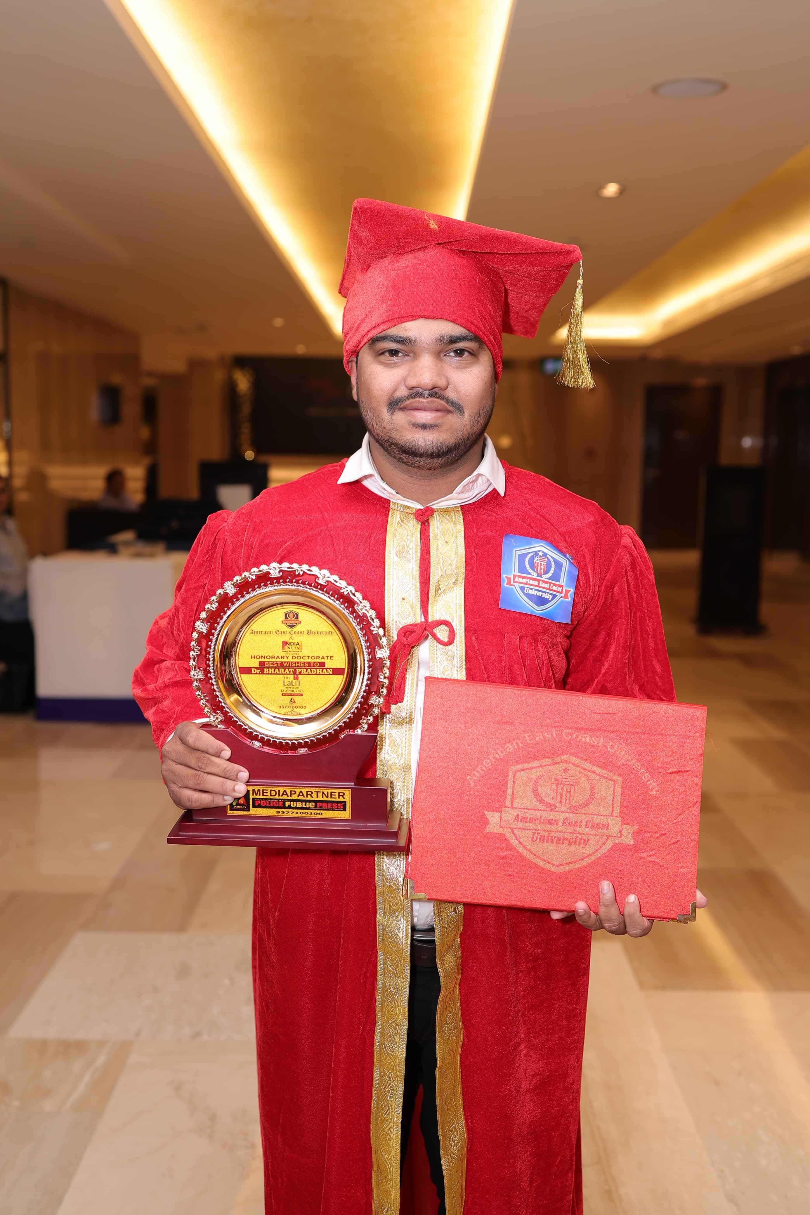 ବିଭିନ୍ନ ବ୍ୟବସାୟିକ ସଫଳତା ପାଇଁ ଗଣମାଧ୍ୟମର ସହଯୋଗୀତାରେ ତାଙ୍କୁ ସହାୟକ ହେବା, ସମାଜସେବା ପାଇଁ ନିଜ ହାତ ଗଢ଼ା ଅନୁଷ୍ଠାନ ନିର୍ବାଣ ଫାଉଣ୍ଡେସନ ଦ୍ୱାରା ଗରିବ ଛାତ୍ରଛାତ୍ରୀମାନଙ୍କୁ ପାଠ ପଢିବା ପାଇଁ ସମସ୍ତ ସୁବିଧା ସୁଯୋଗ ଯୋଗାଇଦେବା କ୍ଷେତ୍ରରେ ଭରତଙ୍କର ଅତୁଳନୀୟ ଅବଦାନ ପାଇଁ ତାଙ୍କୁ ଏହି ସମ୍ମାନଜନକ ଡ଼କ୍ଟରେଟ ଉପାଧି ମିଳିଛି l ଭରତ ମୋସନ ଇଭେଣ୍ଟସ ମାଧ୍ୟମରେ ବହୁବାର ବ୍ୟବସାୟୀକ ସମ୍ମାନ ପ୍ରଦାନ କାର୍ଯ୍ୟକ୍ରମ କରି ଡକ୍ଟର ଭରତ ଚର୍ଚ୍ଚାରେ ରହିଛନ୍ତି l ଡକ୍ଟର ଭରତ ପ୍ରଧାନ ସମାଜିକ ଗଣମାଧ୍ୟମ ତଥା ବ୍ୟବସାୟ କ୍ଷେତ୍ରରେ ବିଶିଷ୍ଟ ବ୍ୟକ୍ତି ଭାବେ ନିଜର ପରିଚୟ ସୃଷ୍ଟି କରିଥିବା ଯୋଗୁଁ ଆମେରିକାର ପୂର୍ବ ତଟ ବିଶ୍ୱବିଦ୍ୟାଳୟରୁ ସମ୍ମାନଜନକ ଡକ୍ଟରେଟ ପାଇଛନ୍ତି। ତାଙ୍କର ଅତୁଳନୀୟ ଅବଦାନ, ମାନବିକତା ପ୍ରତି ତାଙ୍କର ନିରନ୍ତର ଉତ୍ସର୍ଗୀକୃତତା ଏବଂ ରାଜ୍ୟ ତଥା ଦେଶର ବିକାଶ ଦିଗରେ ତାଙ୍କର ଅକ୍ଲାନ୍ତ ଉଦ୍ୟମର ଏହା ପ୍ରମାଣର