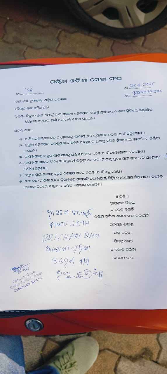 ବଲାଙ୍ଗିର(ପ୍ରେରଣା ଖବର): ପଶ୍ଚିମ ଓଡିଶା ସେବା ସଂଘ ପକ୍ଷରୁ ମାନ୍ୟବର ମୁଖ୍ୟମନ୍ତ୍ରୀଙ୍କୁ ବଲାଙ୍ଗିର ଜିଲ୍ଲାପାଳଙ୍କ ଜରିଆରେ ଏକ ୬ ଦଫା ଦାବିପତ୍ର ପ୍ରଦାନ କରାଯାଇଛି । ଜିଲ୍ଲାରେ ବିଦ୍ୟୁତ ସମସ୍ୟା ଯୋଗୁଁ ଜଳ ଯୋଗାଣ ବାଧାପ୍ରାପ୍ତ ହେଇଛି ଫଳରେ ଜିଲ୍ଲାବାସୀ ନାଇନଥିବା ସମସ୍ୟାର ସମ୍ମୁଖିନ ହେଉଛନ୍ତି । ଏହାକୁ ଗୁରୁତ୍ୱସହ ନେଇ ଯଥା ଶିଘ୍ର ସମସ୍ୟାର ସମାଧାନ ପାଇଁ ପଶ୍ଚିମ ଓଡିଶା ସେବା ସଂଘ ଦାବି କରିଛି । ସଂଘ ଦ୍ୱାରା ୬ ଦଫା ଦାବିପତ୍ର ରେ ପାଣି ଟେଙ୍କର ରେ ଜନସାଧାରଣଙ୍କ ପାନୀୟ ଜଳ ଯୋଗାଇ ଦେବା, ପୁରୁଣା ଅଚଳ ନଳକୂପମାନଙ୍କୁ କାର୍ୟ୍ୟକ୍ଷମ କରିବା, ଗାଁମାନଙ୍କରେ ଗ୍ରାମବାସୀଙ୍କୁ ଘରକୁ ଘର ପାଣି ଯୋଗାଇ ଦେବା, ସେମାନଙ୍କ ନିତ୍ୟ ବ୍ୟବହାର୍ୟ୍ୟ ପାଇଁ ଜରୁରୀ ପୋଖରୀ ଗୁଡିକର ପୁନଃ ମାଟିକାମ ଓ ସଫେଇ କରିବା, ଆବଶ୍ୟକୀୟ ସ୍ଥାନମାଙ୍କୁ ନୂତନ ନଳକୂପ ଖନନ କରିବା ତଥା ନଦୀନାଳମାନଙ୍କୁ ନୂତନ