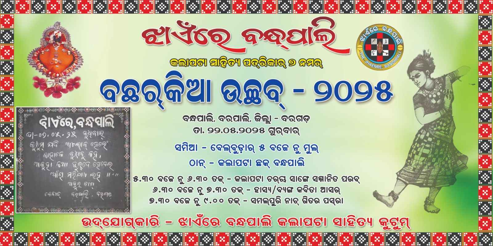ବରଗଡ଼:(ନିରଞ୍ଜନ ତ୍ରିପାଠୀ)-ବରଗଡ଼ ଜିଲ୍ଲା ବରପାଲି ବ୍ଲକ ଅନ୍ତର୍ଗତ ବନ୍ଧପାଲି ଠାରେ ଗଢି ଉଠିଥିବା ଝାଏଁରେ କଲାପଟାର ବାର୍ଷିକୋତ୍ସବର ପ୍ରସ୍ତୁତି ବୈଠକ ଅନୁଷ୍ଠିତ ହୋଇଯାଇଛି।ଝାଏଁରେ ବନ୍ଧପାଲି କଲାପଟା ସାହିତ୍ୟ ଆନୁକୁଲ୍ୟରେ ସଭାପତି ଭରତ ମେହେର ଙ୍କର ତତ୍ବାବଧାନରେ ତାର ସପ୍ତମ ବାର୍ଷିକ ମହୋତ୍ସବ ଆସନ୍ତା ତା-୨୨/୦୫/୨୫ ଗୁରୁବାର ସନ୍ଧ୍ୟାରେ ଅନୁଷ୍ଠିତ ହେବାପାଇଁ ଅନ୍ତିମ ବୈଠକ ଅନୁଷ୍ଠିତ ହୋଇଥିଲା। ଝାଏଁରେ ବନ୍ଧପାଲି କଲାପଟା ସାହିତ୍ୟ କୁଟୁମ୍ ର ସହମତିରେ ଗୁରୁବାର ସନ୍ଧ୍ୟାରେ କଲାପଟା ପୁଜନ ଓ ମଞ୍ଚ ପୁଜନ ପରେ ସମ୍ମାନିତ ପର୍ବ ହାସ୍ୟ/ବ୍ୟଙ୍ଗ କବି ସମ୍ମିଳନୀ ସାଙ୍ଗରେ ସମଲ୍ପୁରି ନାଚଗିତର ଆସର ହେବ । ବୈଠକରେ ସଂସଦର ସମ୍ପାଦକ ଭରତ ନାଏକ, କୋଷାଧ୍ୟକ୍ଷ ଉମାକାନ୍ତ ସାହୁ,ମୋତିରାମ୍ ମେହେର, ଭାଗିରଥି ବିଭାର୍ ,ହରି ମେହେର୍, ଲଲିତ ମେହେର, ରୋହିତ ସାହୁ, ପ୍ରଦୀପ ମେହେର,ଚିନୁ ଚେଟି,ଯୋଗେଶ ବର୍ଗାଏ,,ପ୍ରଦିପ ରାଉତ୍, ଅଶ୍ଵିନୀ ସେଠ୍,ମୁକେଶ ଦାଶ, ଅନନ୍ତ ମହାପାତ୍ର, ବୈଦ୍ୟନାଥ ସାହୁ, ବାଳକୃଷ୍ଣ ମେହେର, କ୍ଷିରସିନ୍ଧୁ ଭୋଇ,,କ୍ଷିର ସେଠ୍ ,ଓମ୍ପ୍ରକାଶ ମେହେର୍ ସମସ୍ତ ସଦସ୍ୟ ଉପସ୍ଥିତ ଥିଲେ।