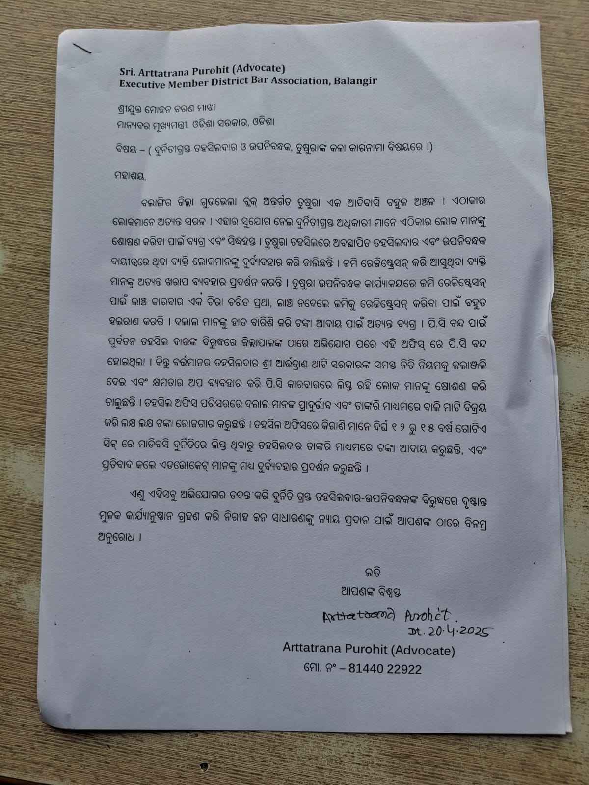 ତୁଷୁରା(ପଞ୍ଚାନନ ନାଏକ) ବଲାଙ୍ଗୀରର ଏକ ପଛୁଆ ବ୍ଲକ ତଥା ନିରୀହ ଆଦିବାସୀମାନଙ୍କ ଅଞ୍ଚଳ ଭାବେ ଗୁଡଭେଲା ବ୍ଲକ ପରିଚିତ। ଏହି ବ୍ଲକର ତହସିଲ ଅଫିସ ତୁଷୁରାରେ ରହିଥିବା ବେଳେ ତୁଷୁରା ତହସିଲଦାର ଆର୍ତ୍ତତ୍ରାଣ ଥାର୍ଟିଙ୍କ ଦୁର୍ନୀତି ଚରମ ସୀମାରେ ପହଞ୍ଚି ଥିବା ନେଇ ମୁଖ୍ୟମନ୍ତ୍ରୀଙ୍କୁ ଚିଠି ଲେଖି ଅଭିଯୋଗ କଲେ ବରିଷ୍ଠ ଆଇନଜୀବୀ ଅର୍ତ୍ତତ୍ରାଣ ପୁରୋହିତ। ଏପରିକି ବର୍ତ୍ତମାନ ଦୁର୍ନୀତି ଚରମ ସୀମାରେ ପହଞ୍ଚି ଥିଲେ ମଧ୍ୟ ଭୟରେ ନିରୀହ ଜନତା ଭାଗ୍ୟକୁ ଆଦରି ଚୁପ୍ ରହୁଛନ୍ତି। କିଛି ବର୍ଷ ଆଗରୁ ତୁଷୁରା ତହସିଲ ଅଫିସ ଠାରେ ଦୁର୍ନୀତି ଏବଂ ପିସି କରାବାର ବଢିଥିବାରୁ ଜିଲ୍ଲାପାଳଙ୍କ ଠାରେ ଅଭିଯୋଗ ହୋଇଥିଲା। ଏହା ପରେ ବଲାଙ୍ଗୀର ଜିଲ୍ଲାପାଳ କଠୋର ପଦକ୍ଷେପ ନେବାରୁ ପି. ସି କାରାବାର ବନ୍ଦ ରହିଥିଲା । ଏବେ ତହସିଲଦାର ଭାବେ ଆର୍ତ୍ତତ୍ରାଣ ଥାର୍ଟି ଯୋଗଦାନ କରିବା ପରେ ପୁଣି ଦୁର୍ନୀତି ସହିତ ପିସି କାରବାର ବଢ଼ିଚାଲିଛି। ଖଣିଲୁଟ, ବାଲି ଲୁଟ ସହିତ ପିସି ନ ଦେଲେ ଜମି ରେଜିଷ୍ଟ୍ରେସନ ହେଉନଥିବା ବେଳେ ଜବରଦଖଲ ଉଛେଦରେ ମଧ୍ୟ ଗରିବ ମାନଙ୍କୁ ହଟାଉଥିବା ବେଳେ ଧନୀ ମାନଙ୍କୁ କୋହଳ କରୁଥିବା ଅଭିଯୋଗ ହେଉଛି। ସେହିପରି ଧାନଘରା ର ତେଲ ନଦୀ ପାଖରେ ଖଣିକୁ ଟଙ୍କା ନେଇ ମାଫିଆ ମାନଙ୍କ ହାତରେ ଟେକି ଦେଉଥିବା ନଜିର ରହିଛି । ଏହି ସବୁ ବିଷୟ ଲୋକଲୋଚନରେ ଆସିବା ପରେ ତହସିଲଦାର ନିଜର ଭୁଲ ଲୁଚାଇବା ପାଇଁ ବେଆଇନ ଭାବେ ଅଳ୍ପ ପରିମାଣର ରାଜସ୍ବ ଆଦାୟ କରି ନିରବ ସାଜିଛନ୍ତି। ଏପରିକି ତହସିଲଦାର ମହାଶୟ ଉପନିବନ୍ଧକ ଭାବେ ଅତିରିକ୍ତ ଦାୟିତ୍ବ ଥିବାରୁ ଜମି ରେଜିଷ୍ଟ୍ରେସନ କରିବାକୁ ଆସୁଥିବା ଲୋକମାନଙ୍କ ଠାରୁ ଦଳାଲ ମାଧ୍ୟମରେ ମୋଟା ଅଙ୍କର ଟଙ୍କା ଆଦାୟ କରୁଥିବା ଅଭିଯୋଗ କରିଛନ୍ତି। ଅନ୍ୟ ପକ୍ଷରେ ଅଫିସ ବହୁ କିରାଣି ୧୨ରୁ ୧୫ ବର୍ଷ ହେଲାଣି ଏହି ଅଫିସରେ ନିଜ ଆଡ୍ଡା ଜମାଇ ରହିଯାଉଥିବାରୁ ଏପରି ସମସ୍ୟା ହେଉ ଥିବା ଶ୍ରା ପୁରୋହିତ ନିଜ ଅଭିଯୋଗ ପତ୍ରରେ ଦର୍ଶାଇଛନ୍ତି । ଏନେଇ ତୁଷୁରା ତହସିଲଦାର ଆର୍ତ୍ତତ୍ରାଣ ଥାର୍ଟିଙ୍କୁ ପଚାରିବାରୁ ଅଭିଯୋଗ ଅସ୍ବୀକାର କରିଥିଲେ। ଏଠାରେ ସୂଚନାଯୋଗ୍ଯ ଯେ, ତୁଷୁରା ତହସିଲଦାରଙ୍କୁ ଉପନିବନ୍ଧକ ଓ ତୁଷୁରା ଏନଏସିର ଅତିରିକ୍ତ ଦାୟିତ୍ବ ଦିଆଯାଇ ଥିବାରୁ ମଧ୍ଯ ଏପରି ସମସ୍ୟା ଉପୁଜିଥିବା ନେଇ ସାଧାରଣରେ ମତପ୍ରକାଶ ପାଉଛି। ଏଥିପ୍ରତି ବିଭାଗୀୟ ଉଚ୍ଚ କର୍ତ୍ତୃପକ୍ଷ ତୁରନ୍ତ ଦୃଷ୍ଟି ଦେଇ ବିହିତ ପଦକ୍ଷେପ ନେବାକୁ ସାଧାରଣରେ ଦାବୀ ହେଉଛି ।