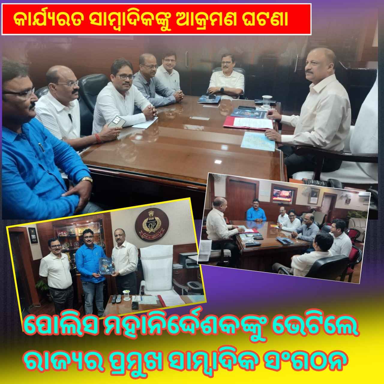 ବଲାଙ୍ଗୀର(ପ୍ରେରଣା ଖବର): ବଲାଙ୍ଗୀର ଜିଲ୍ଲା ପୁଇଁତଳାର ସାମ୍ବାଦିକ ବିଜୟ ପ୍ରଧାନଙ୍କୁ ଆକ୍ରମଣ ଘଟଣା ରେ ଆଜି "ଏସୟୁଜେ ଓଡ଼ିଶା" ସଭାପତି କୈଳାଶ ଚନ୍ଦ୍ର ନାୟକ, ବଡ଼ ଖବର ର ମୁଖ୍ୟ ସମ୍ପାଦକ ଅର୍ଧେନ୍ଦୁ ଦାସ, ଉତ୍କଳ ସାମ୍ବାଦିକ ସଙ୍ଘ ର ସଭାପତି ବିଭୂତି ଭୂଷଣ କର, ବରିଷ୍ଠ ସାମ୍ବାଦିକ ଅକ୍ଷୟ କୁମାର ସାହୁ ଏବ ଏ.କେ. ରାୟ ଙ୍କ ସମେତ ବିଭିନ୍ନ ପ୍ରମୁଖ ସାମ୍ବାଦିକ ସଂଗଠନ କଟକ ଠାରେ ପୋଲିସ ମୁଖ୍ୟାଳୟରେ ରାଜ୍ୟ ପୋଲିସ ମହାନିର୍ଦ୍ଦେଶକ ଆଇ ପି ଏସ୍ ୱାଇ. ବି ଖୁରାନିଆଙ୍କୁ ଭେଟି ମୁଖ୍ୟ ଅଭିଯୁକ୍ତ ଗଜେନ୍ଦ୍ର ଦଳାଇ କୁ ଅବିଳମ୍ବେ ଗିରଫ କରିବାକୁ ଦାବି କରିଥିଲେ। ରାଜ୍ୟର ବିଭିନ୍ନ ଅଞ୍ଚଳରେ ସାମ୍ବାଦିକ ମାନଙ୍କ ଉପରେ ଆକ୍ରମଣ ପରେ