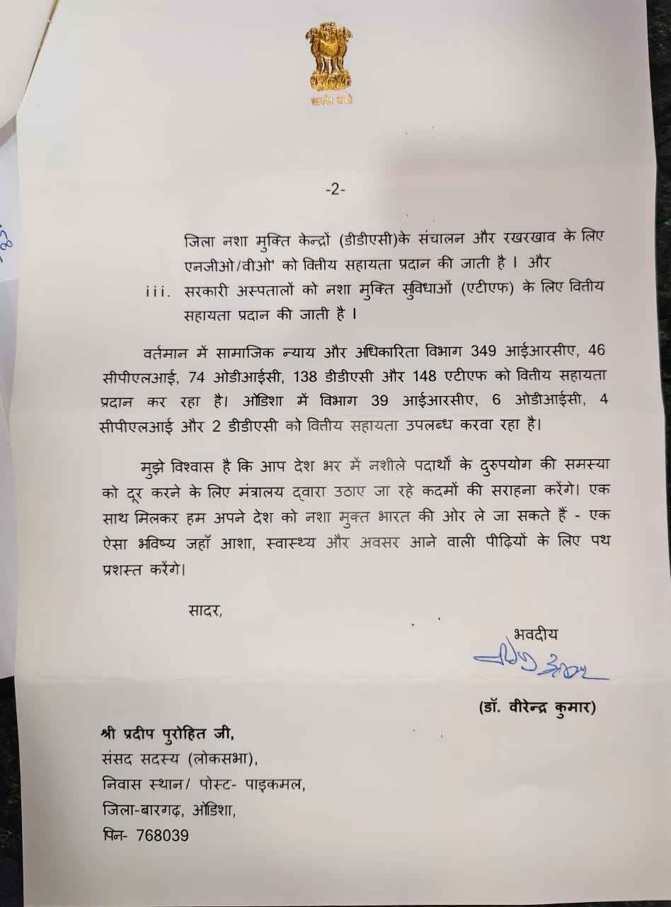 ବର୍ତ୍ତମାନ ସାମାଜିକ ନ୍ୟାୟ ଓ ସଶକ୍ତିକରଣ ମନ୍ତ୍ରାଳୟ ଅଧିନରେ ୩୪୯ଟି ଆଇଆରସିଏ କେନ୍ଦ୍ର, ୪୬ଟି ସିପିଏଲଆଇ କେନ୍ଦ୍ର, ୭୪ଟି ଓଡିଆଇସି, ୧୩୮ଟି ଡିଡିଏସି ଏବଂ ୧୪୮ଟି ଏଟିଏଫ ପାଇଁ ଆର୍ଥିକ ସହାୟତା ପ୍ରଦାନ କରାଯାଇଛି । ଓଡ଼ିଶାରେ ୩୯ଟି ଆଇଆରସିଏ, ୬ଟି ଓଡିଆଇସି ଓ ୪ଟି ସିପିଏଳଆଇ ଏବଂ ୨ଟି ଡିଡିଏସି କେନ୍ଦ୍ର ପାଇଁ ଆର୍ଥିକ ସହାୟତା ଯୋଗାଇ ଦିଆଯାଉଥିବା ଉତ୍ତରରେ ଲେଖିଛନ୍ତି ବୀରେନ୍ଦ୍ର କୁମାର । ତେବେ କେନ୍ଦ୍ର ସରକାରଙ୍କ ସାମାଜିକ ନ୍ୟାୟ ଓ ସଶକ୍ତିକରଣ ମନ୍ତ୍ରୀ ଡକ୍ଟର ବୀରେନ୍ଦ୍ର କୁମାର ସମସ୍ତଙ୍କୁ ଏକଜୁଟ୍ ହୋଇ ନିଶା ନିବାରଣ ଅଭିଯାନରେ ସାମିଲ ହେବା ପାଇଁ ନିବେଦନ କରିଛନ୍ତି କେନ୍ଦ୍ରମନ୍ତ୍ରୀ । ଏଥିସହ କେନ୍ଦ୍ର ସରକାରଙ୍କ ଦ୍ୱାରା କାର୍ଯ୍ୟକାରୀ ହେଉଥିବା ସମସ୍ତ ଯୋଜନାର ସଫଳ ରୂପାୟନ ପାଇଁ ସମସ୍ତଙ୍କ ସହଯୋଗ କାମନା କରିଛନ୍ତି ଶ୍ରୀ ବୀରେନ୍ଦ୍ର କୁମାର ।